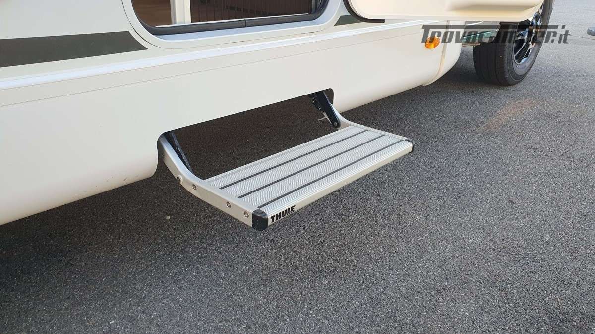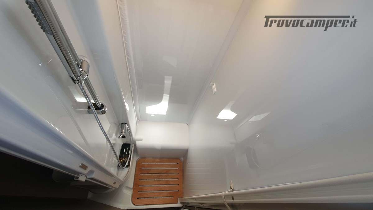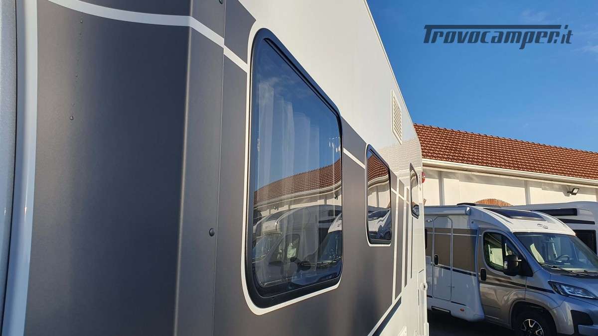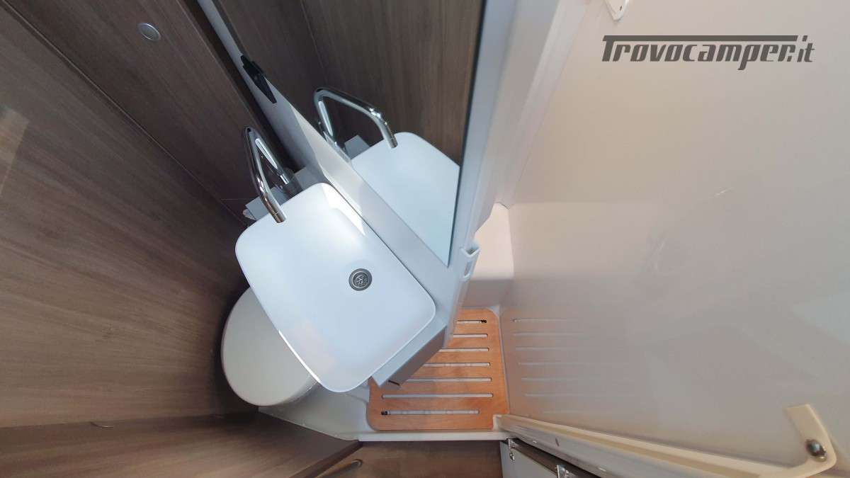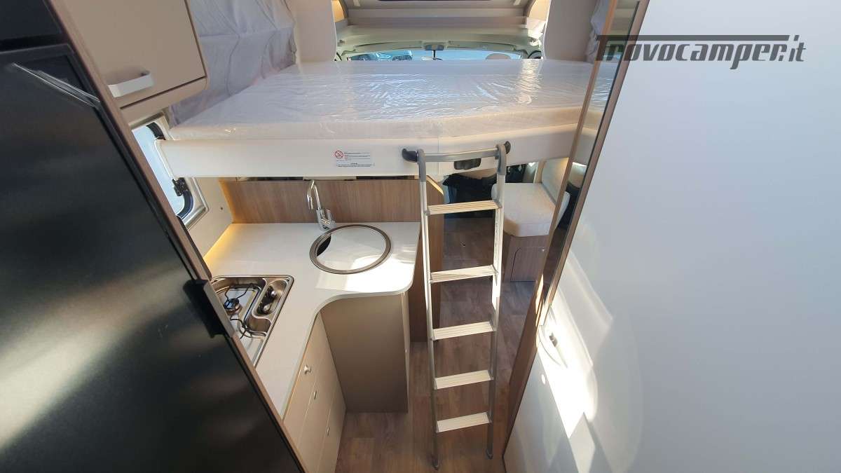 un letto matrimoniale basculante manuale si trova sopra la dinette, mentre nella parte posteriore ci sono due letti gemelli sopra al garage.