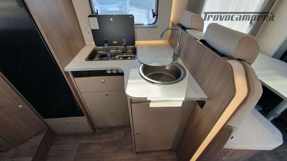 La cucina a gas è completa di due fuochi, lavandino e frigorifero trivalente da 167 litri con freezer da 29 litri, perfetta per preparare ogni pasto anche in viaggio.