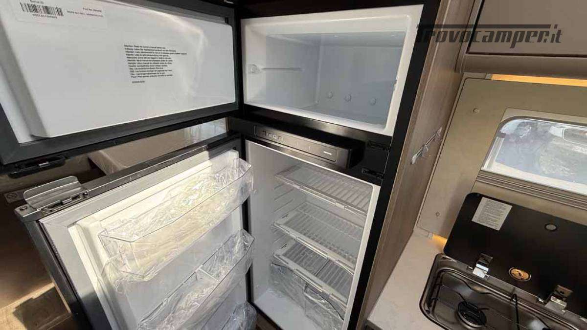 La cucina a gas è completa di due fuochi, lavandino e frigorifero trivalente da 156 litri con freezer da 29 litri, perfetta per preparare ogni pasto anche in viaggio.