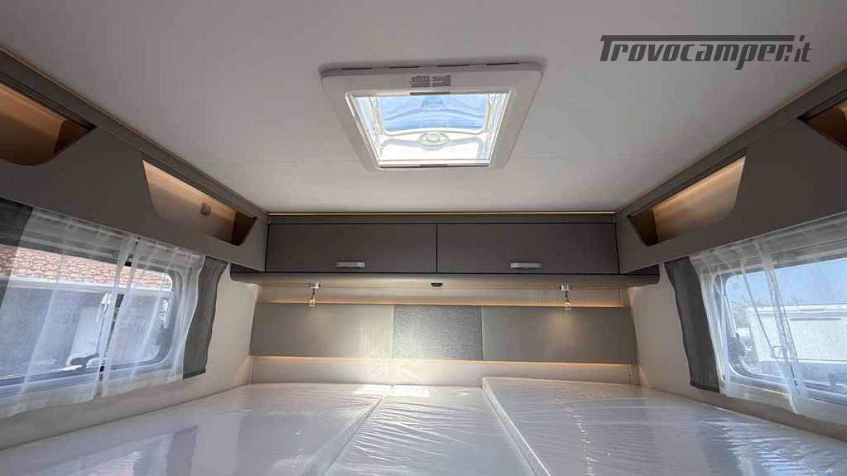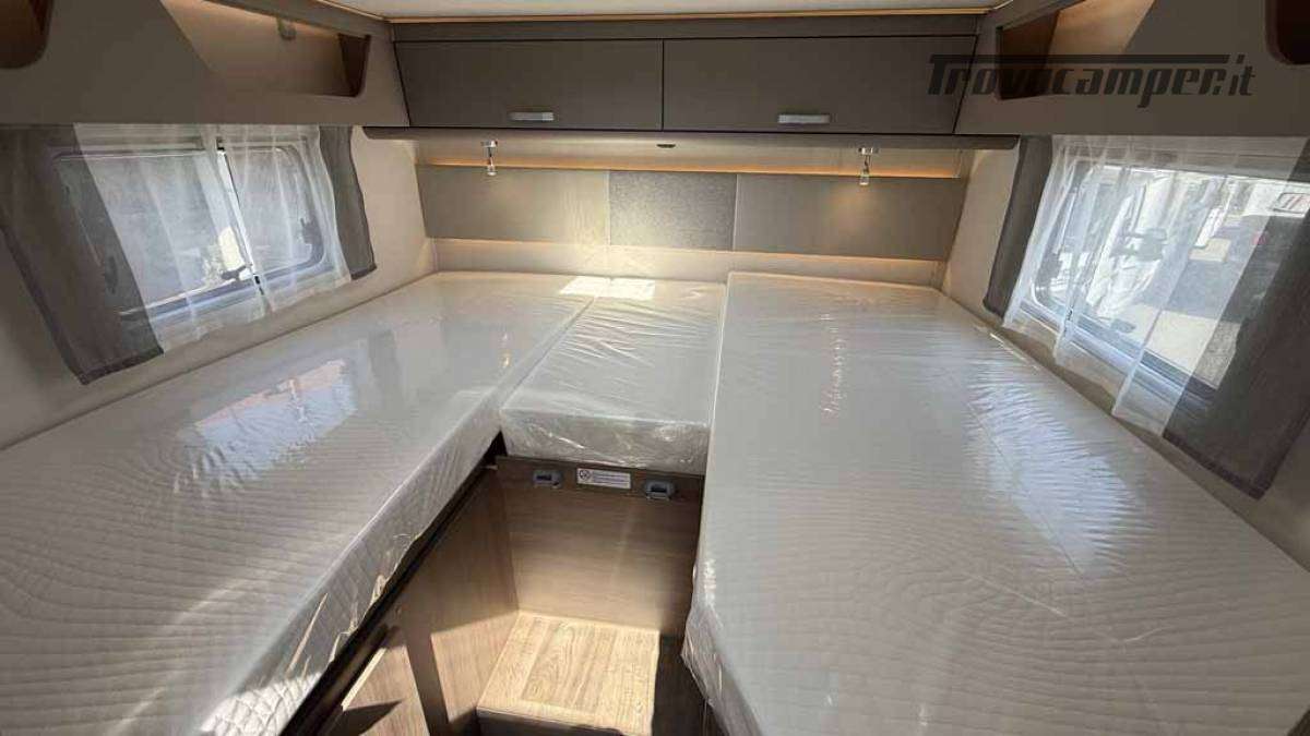 un letto matrimoniale basculante manuale si trova sopra la dinette, mentre nella parte posteriore ci sono due letti gemelli sopra al garage.