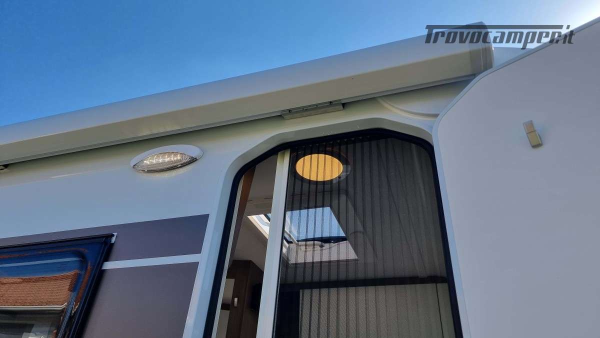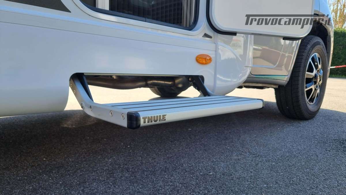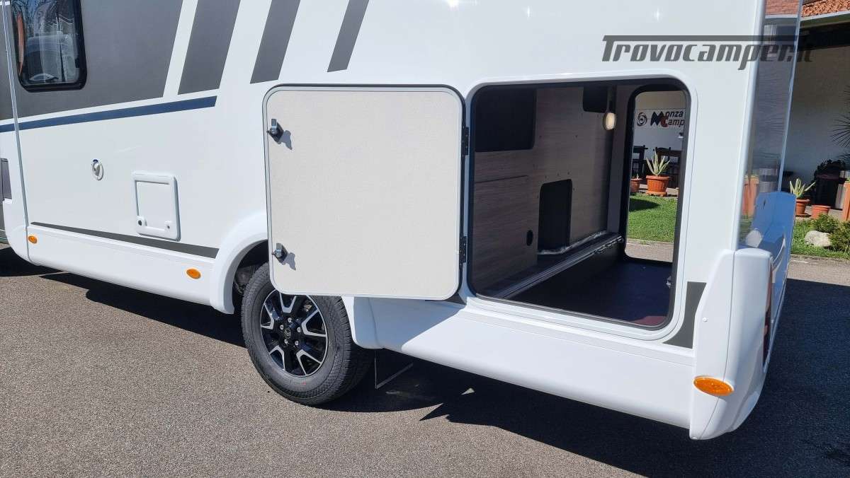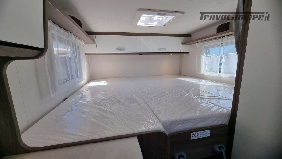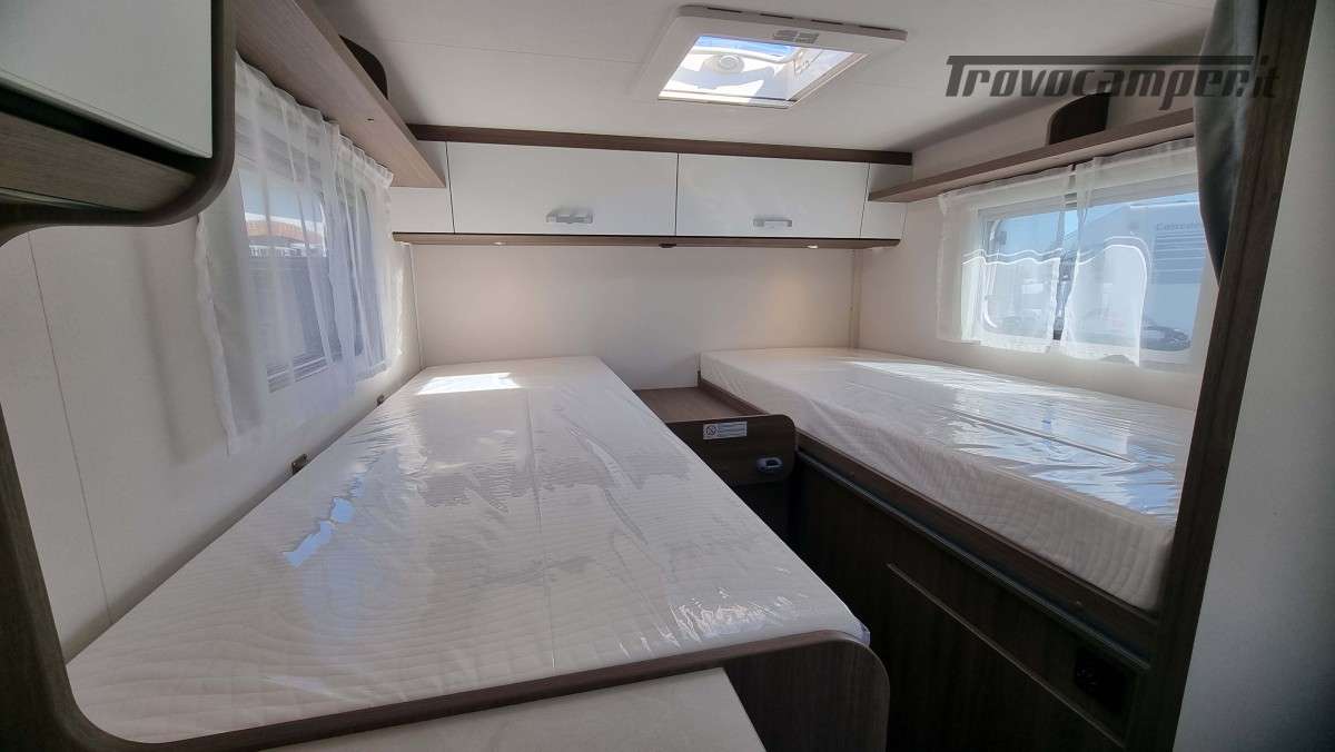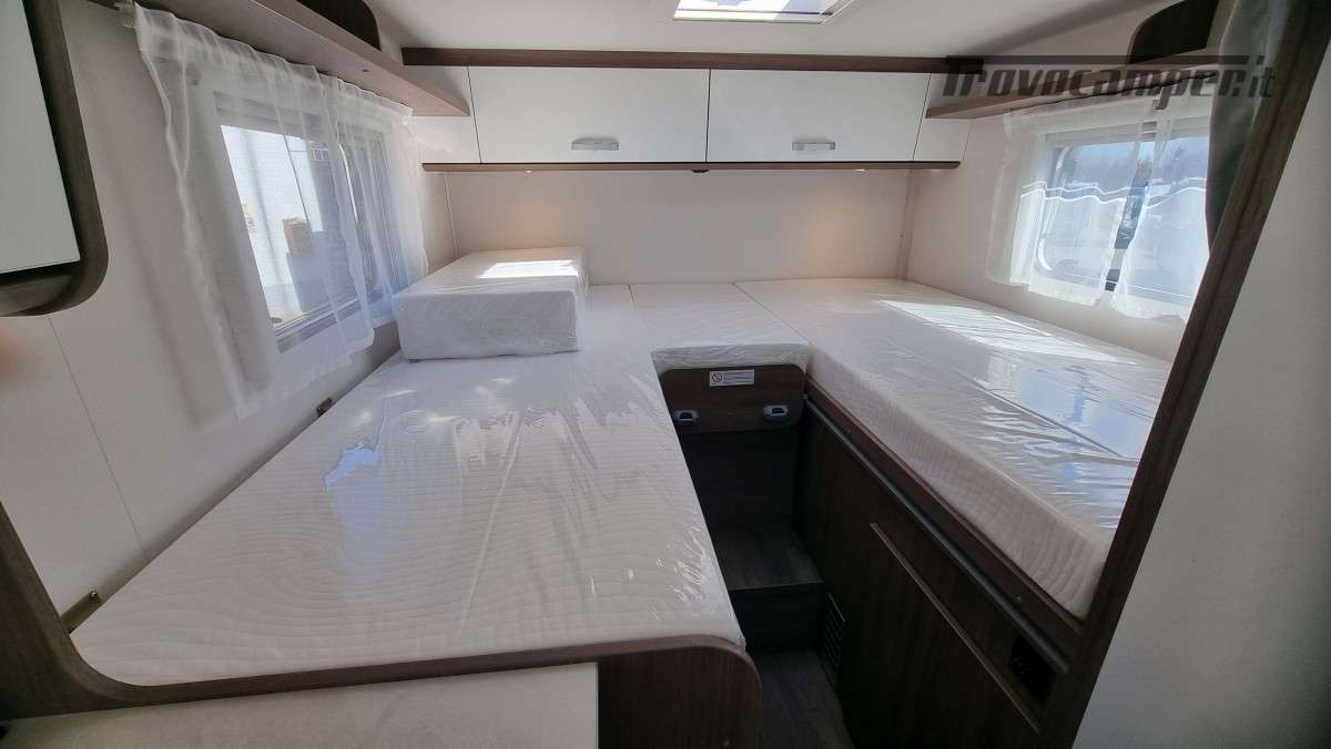 Con una lunghezza di soli 6,64 metri, questo semintegrale è omologato per 4 persone e offre una sistemazione comoda con 2 letti gemelli sopra il garage, che possono facilmente trasformarsi in un letto matrimoniale grazie ai materassi aggiuntivi.