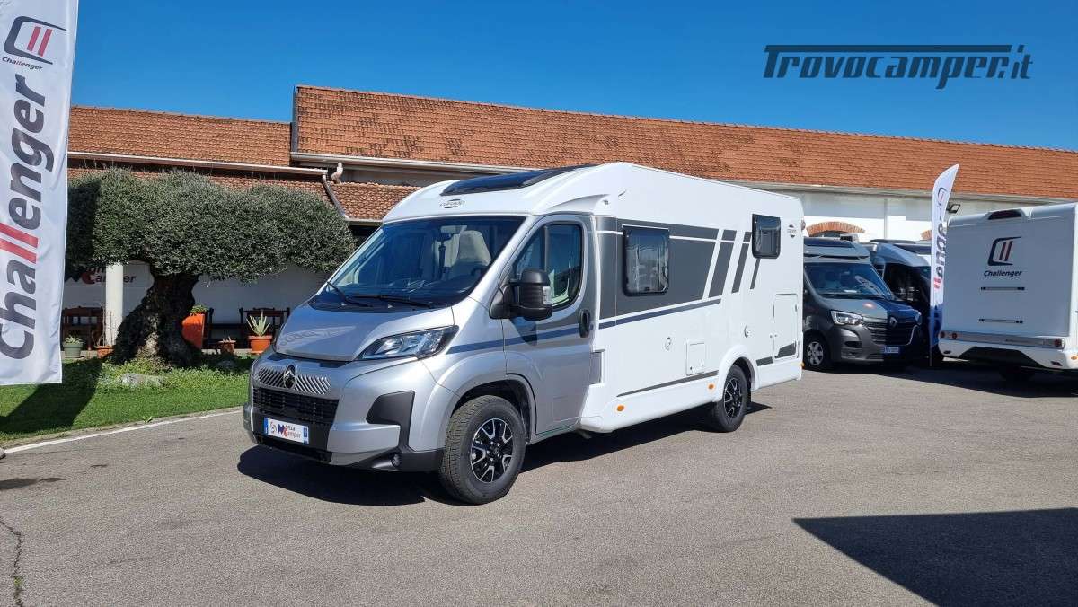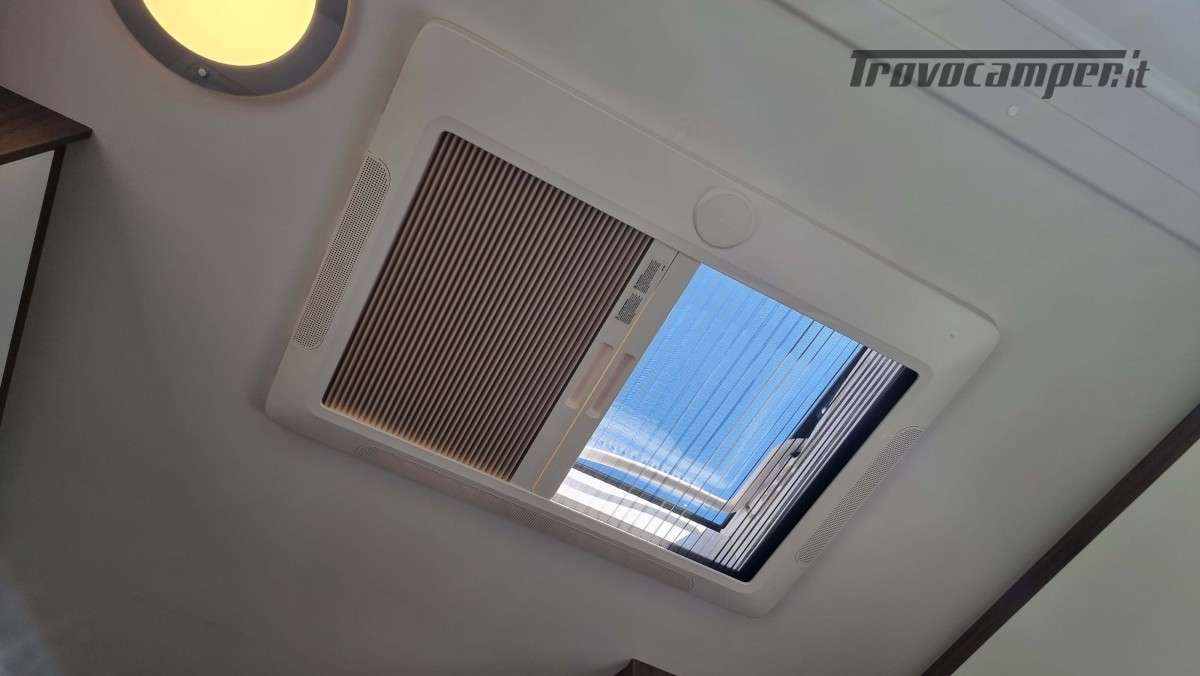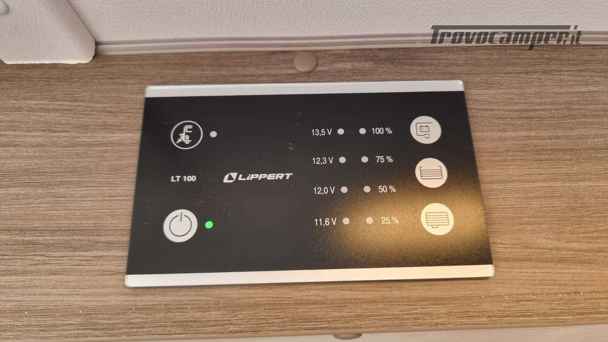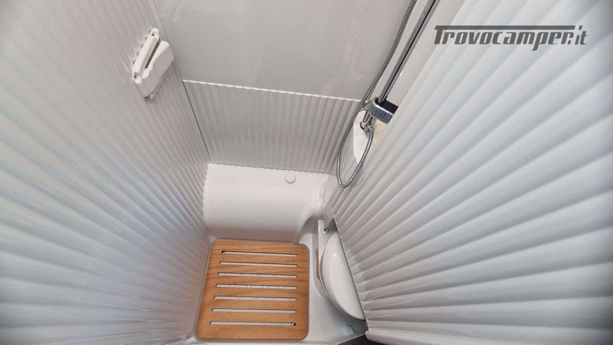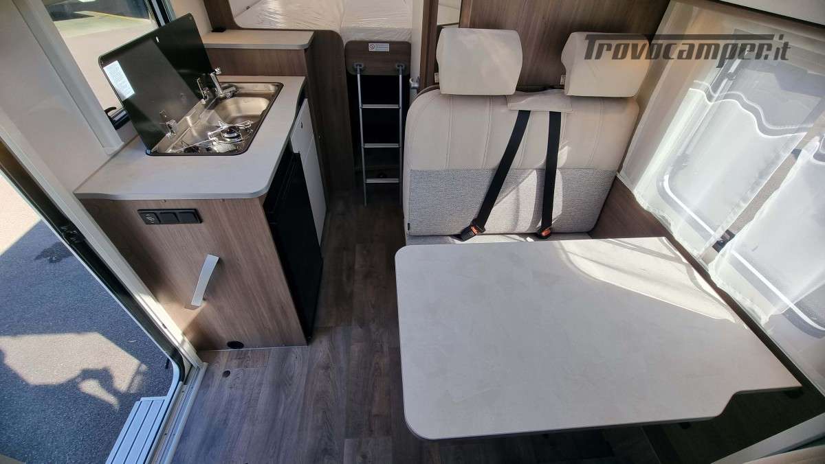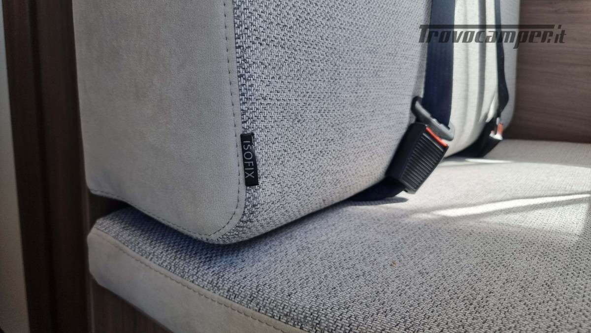 Con una lunghezza di soli 6,64 metri, questo semintegrale è omologato per 4 persone e offre una sistemazione comoda con 2 letti gemelli sopra il garage, che possono facilmente trasformarsi in un letto matrimoniale grazie ai materassi aggiuntivi.