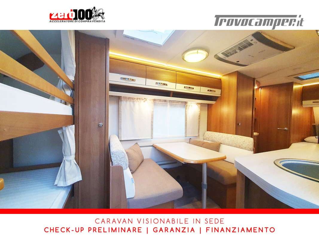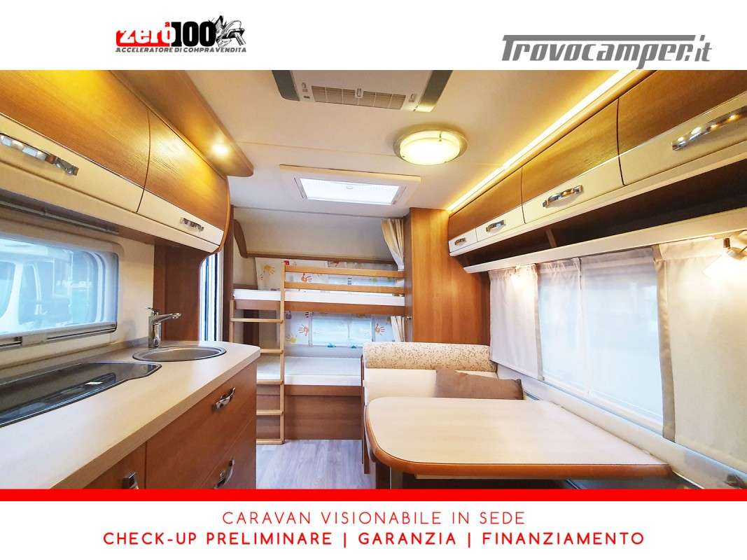 Letto matrimoniale anteriore lato dx alla francese – Letti a castello posteriori trasversali – Dinette trasformabile in letto matrimoniale con Cucina lineare 3 fuochi e Frigorifero trivalente 135 lt