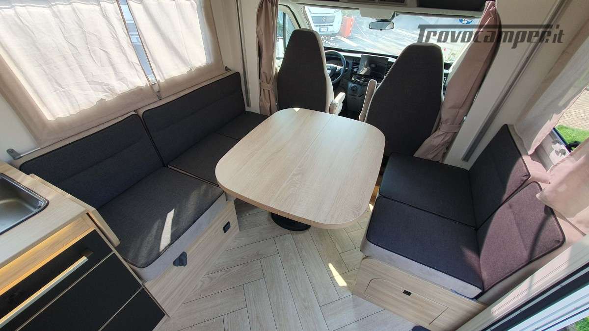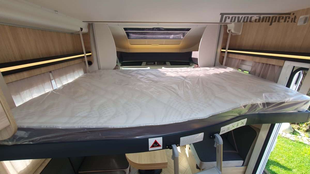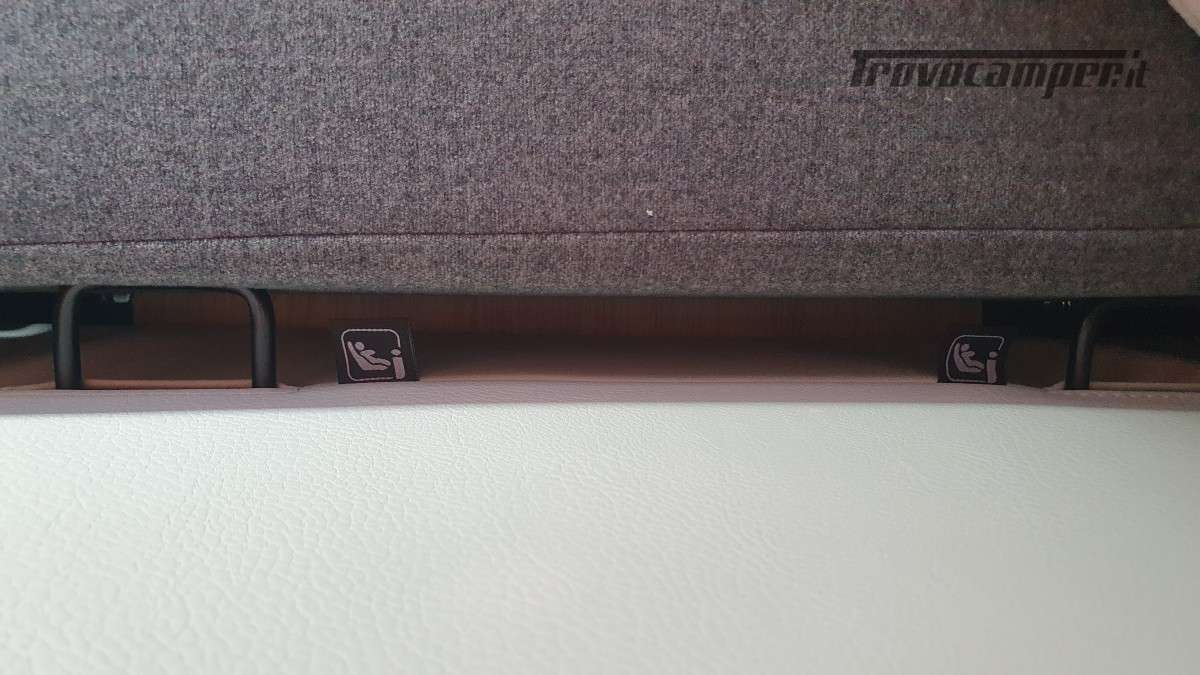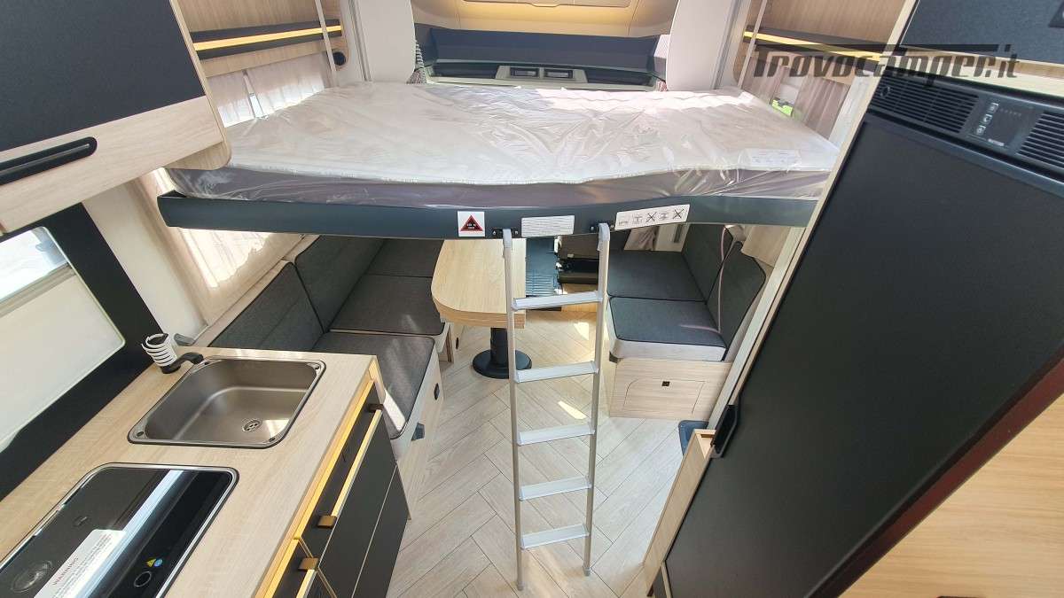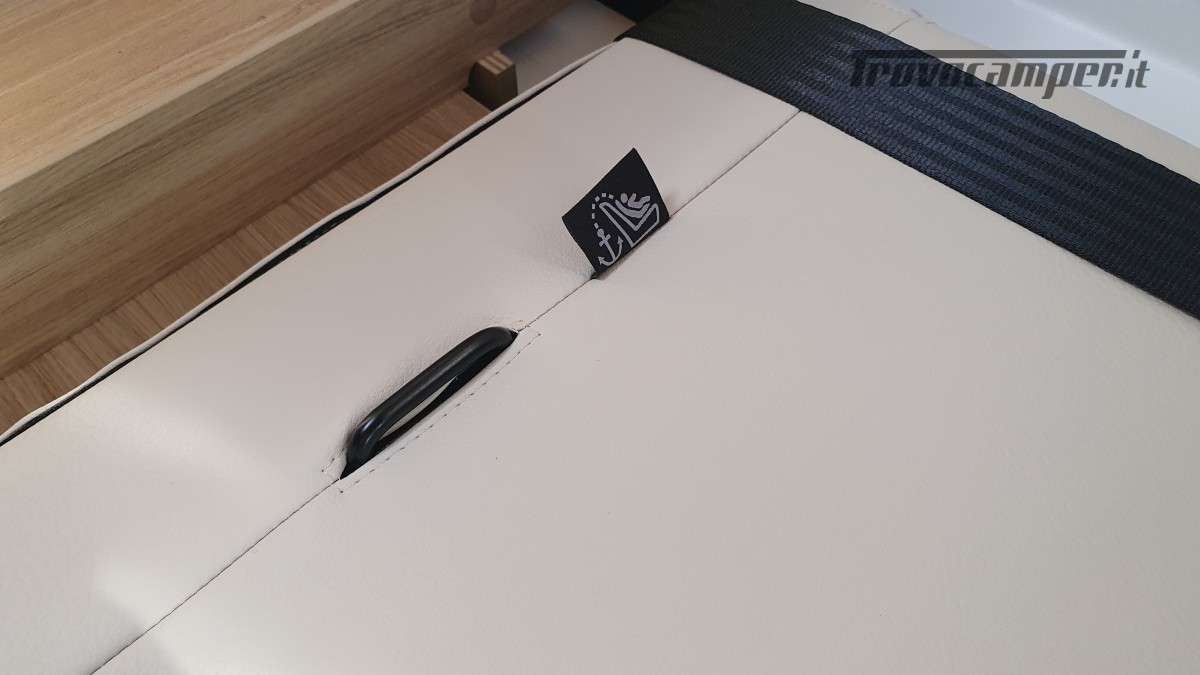 Omologato per 4 persone, con sistema Isofix, offre 4 posti letto: un matrimoniale basculante sopra la dinette e un secondo letto matrimoniale ricavabile dalla trasformazione della stessa dinette. Spazio e comfort perfettamente bilanciati per ogni esigenza di viaggio.