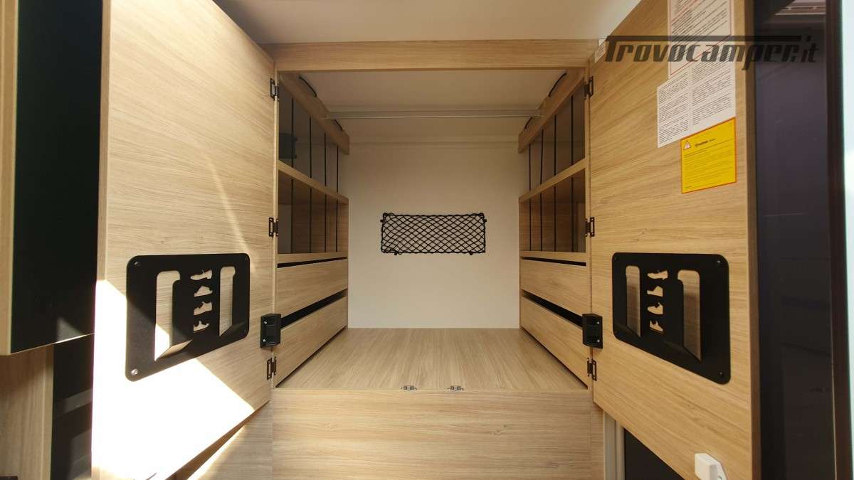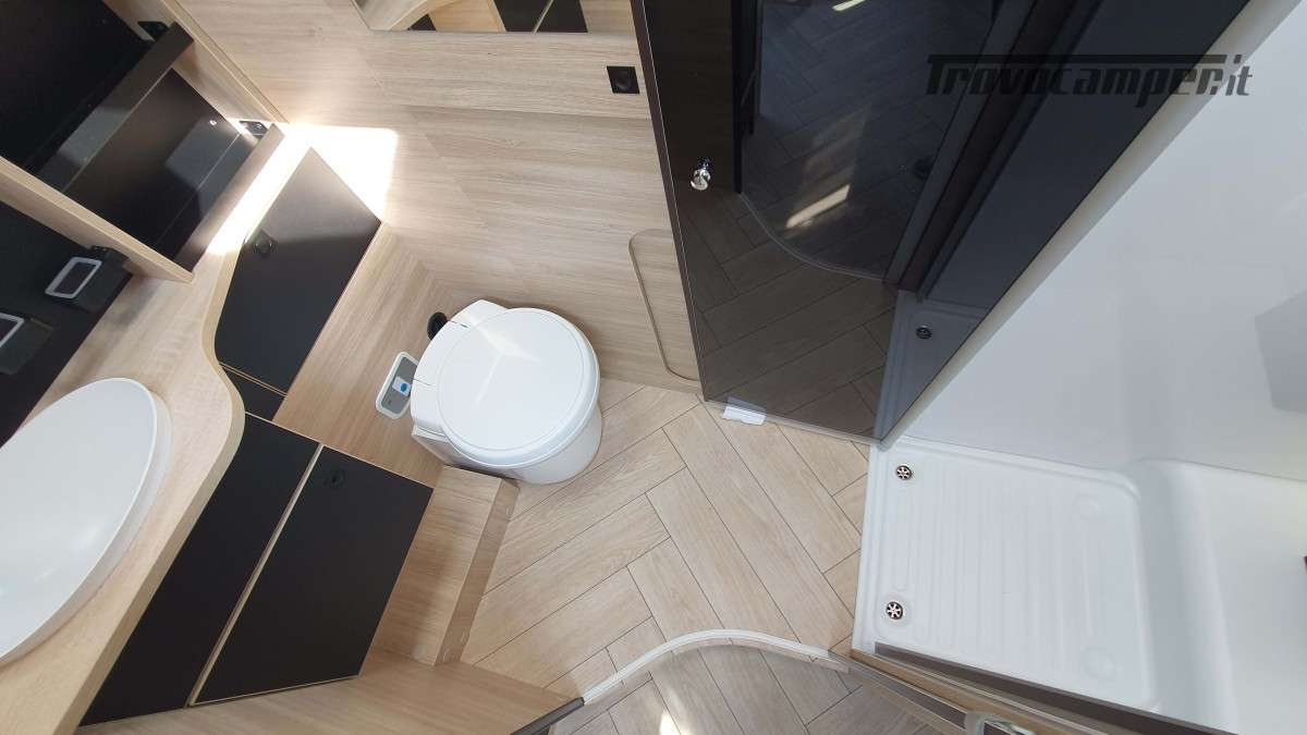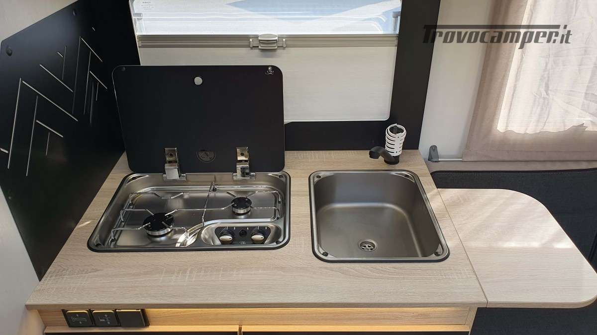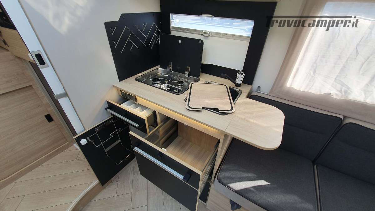 La cucina, moderna e funzionale, è dotata di due fuochi a gas, un lavandino e un frigorifero trivalente da 145 litri, ideale per conservare le provviste durante i soggiorni più lunghi. Nella parte posteriore si trova il bagno, ampio e ben organizzato, con una comoda doccia separata e un armadio spazioso, perfetto per riporre tutto ciò che serve.