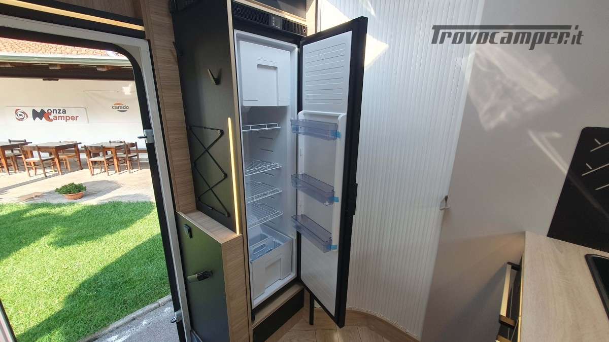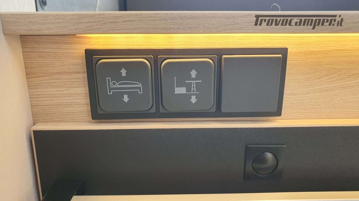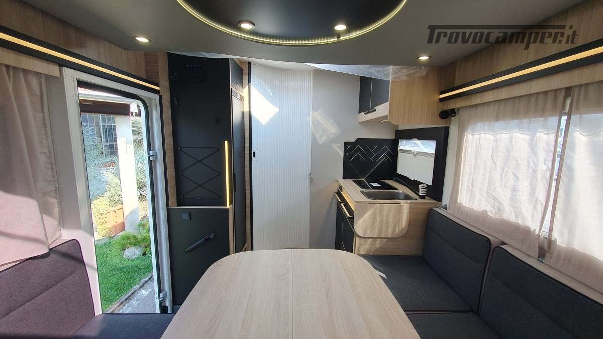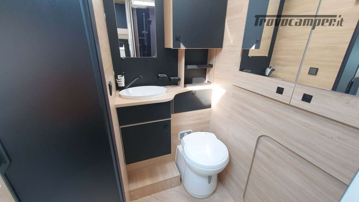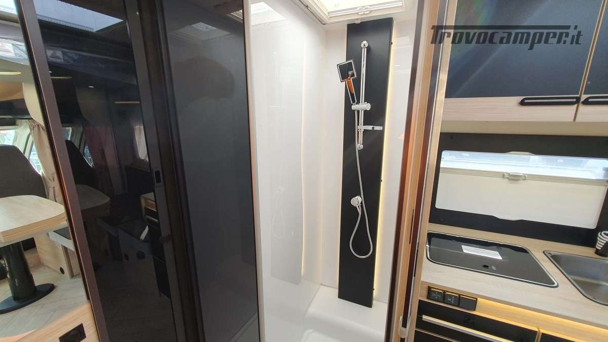La cucina, moderna e funzionale, è dotata di due fuochi a gas, un lavandino e un frigorifero trivalente da 145 litri, ideale per conservare le provviste durante i soggiorni più lunghi. Nella parte posteriore si trova il bagno, ampio e ben organizzato, con una comoda doccia separata e un armadio spazioso, perfetto per riporre tutto ciò che serve.