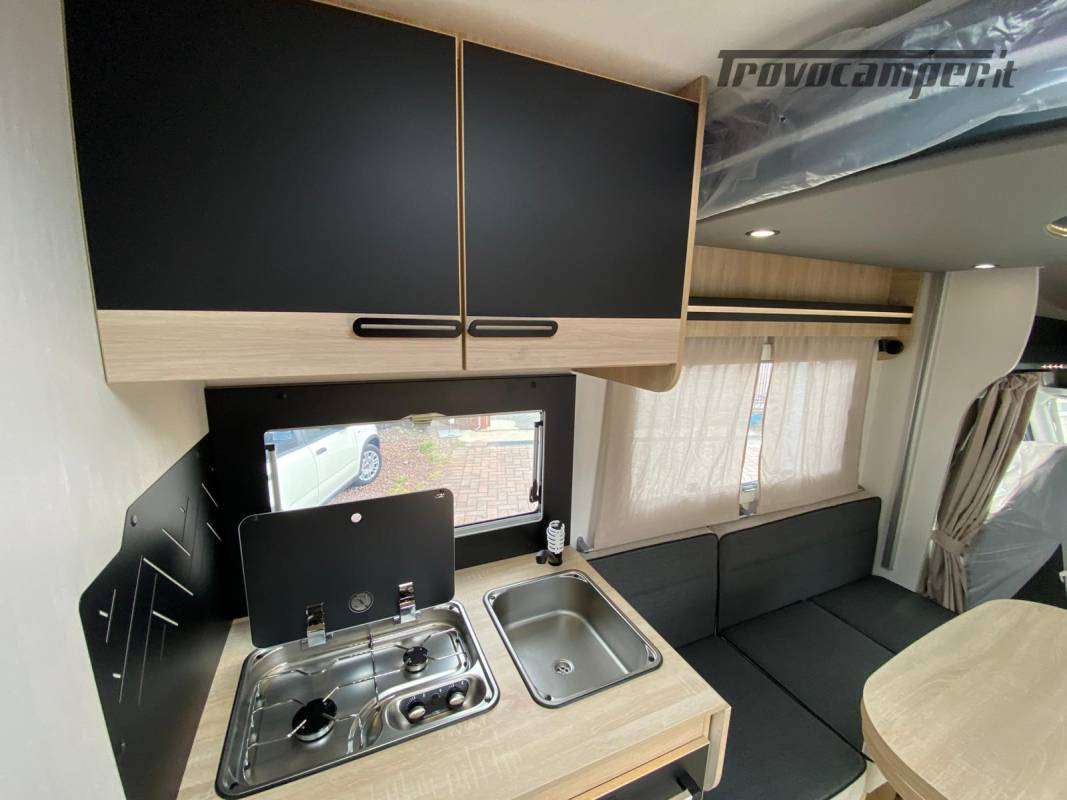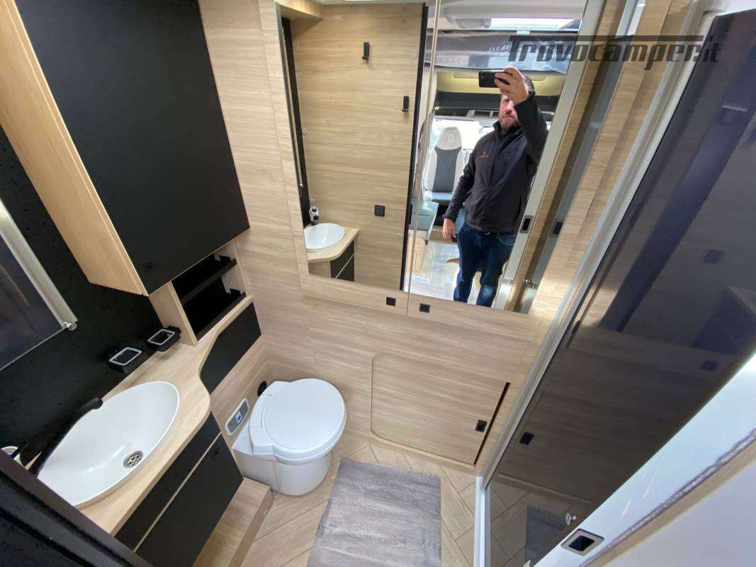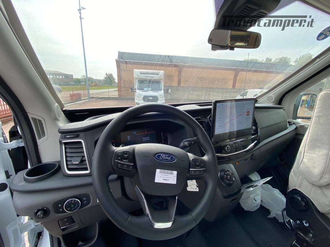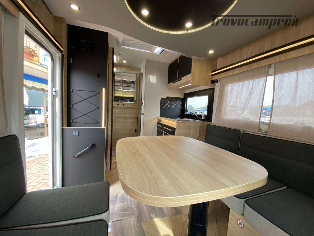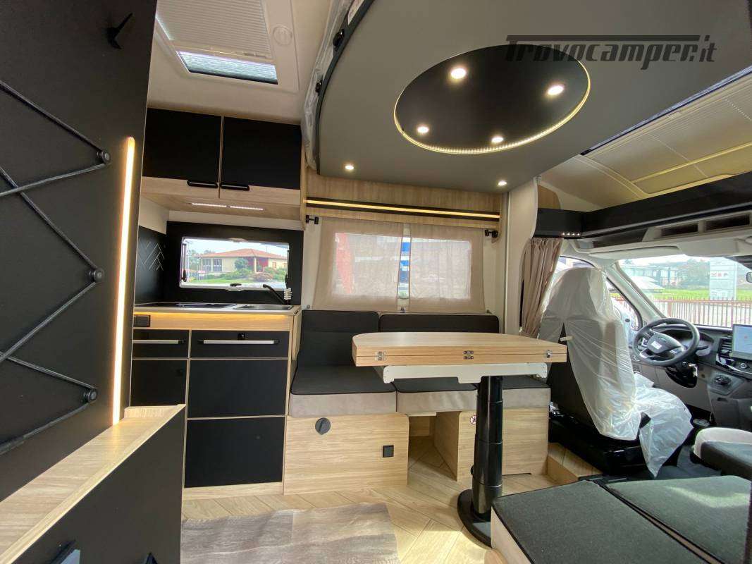 Climatizzazione manuale di cabina, airbag conducente + passeggero, sedili di cabina girevoli regolabili in altezza con doppio bracciolo, fodere sedili cabina coordinate con i tessuti cellula, retrovisori elettrici con sbrinatore, regolatore e limitatore di velocità, autoradio DAB/MP3/Bluetooth, antenna autoradio DAB, scalino di cellula incassato e isolato, riscaldamento webasto a diesel con comando digitale programmabile e boiler truma gas, tetto panoramico apribile, oblò panoramico (o 2 lucernari), zanzariera porta, supporto TV, finestre doppio vetro con combinato oscurante/zanzariera, illuminazione interna ed esterna 100 % a LED, presa USB, struttura IRP, Technibox , oscuranti plissettati cabina