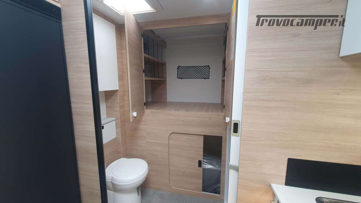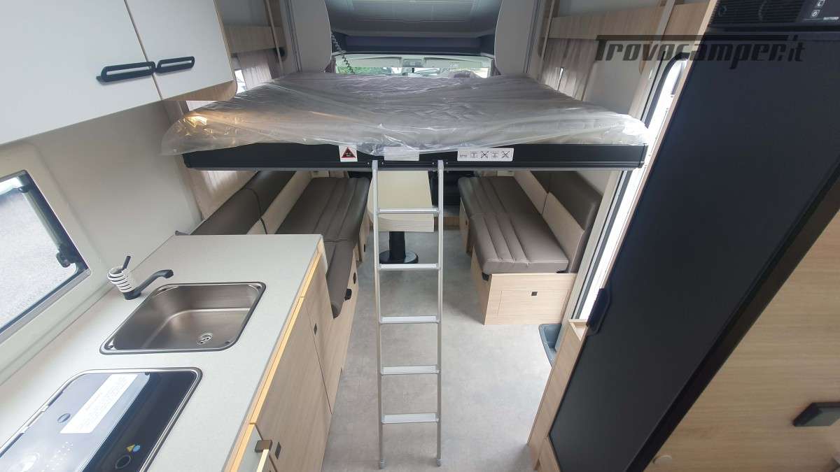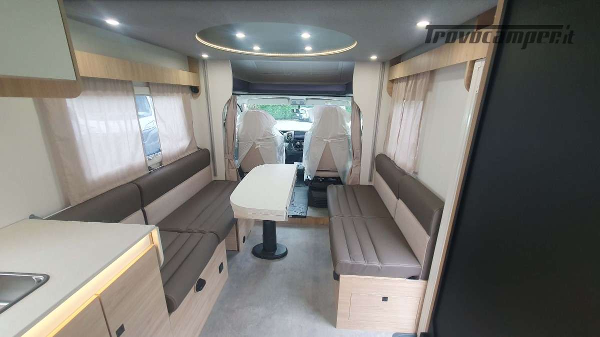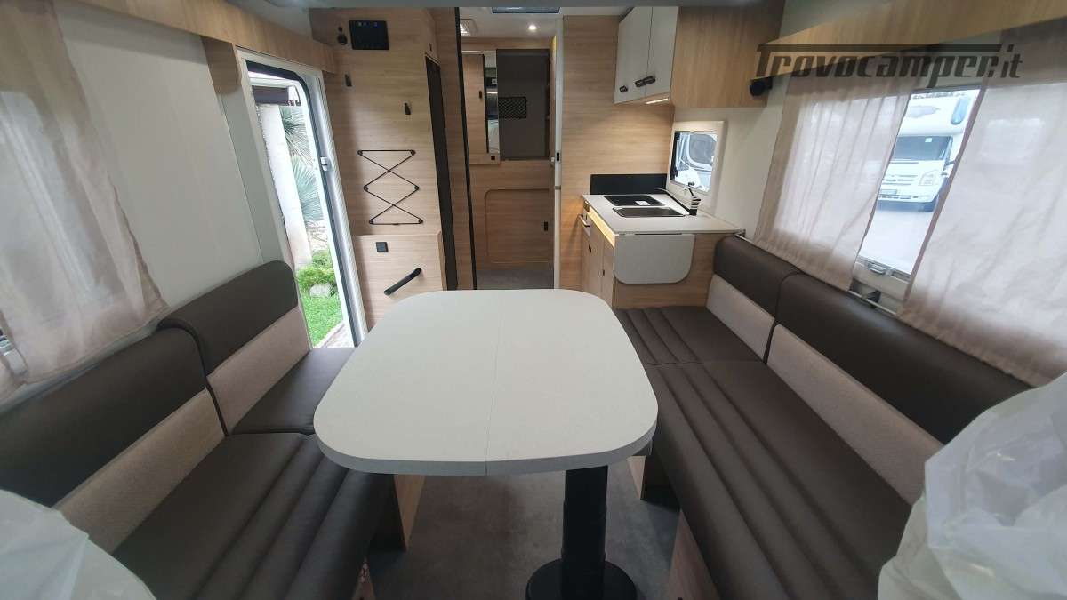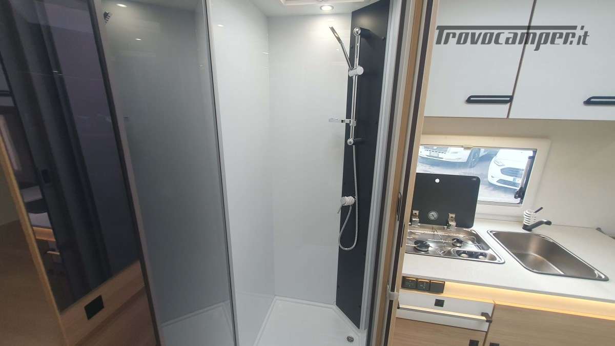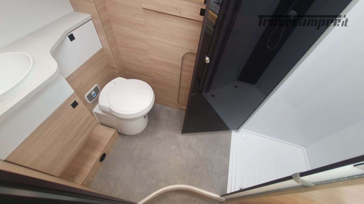 La zona posteriore ospita un bagno comodo e spazioso, con doccia separata e armadi di stivaggio per organizzare al meglio tutti i tuoi effetti personali. A completare il tutto, un ampio garage con secondo portellone permette di trasportare comodamente tutto il necessario per le tue avventure.