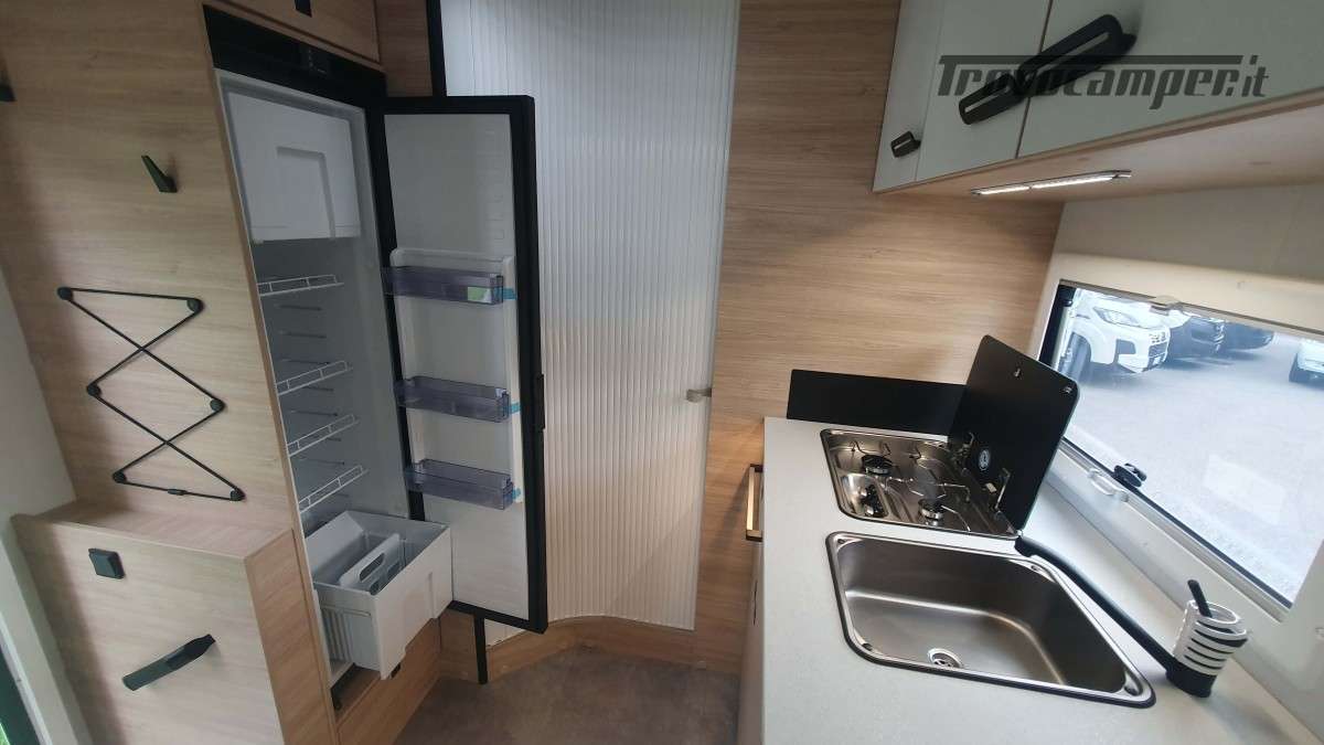La zona giorno è spaziosa e accogliente: i divanetti e il tavolo pieghevole e regolabile in altezza offrono il massimo della comodità. La cucina a gas è completa di 2 fuochi, lavandino, ripiano di appoggio a scomparsa e frigorifero trivalente da 167 litri, perfetto per preparare e conservare i pasti durante i viaggi più lunghi.