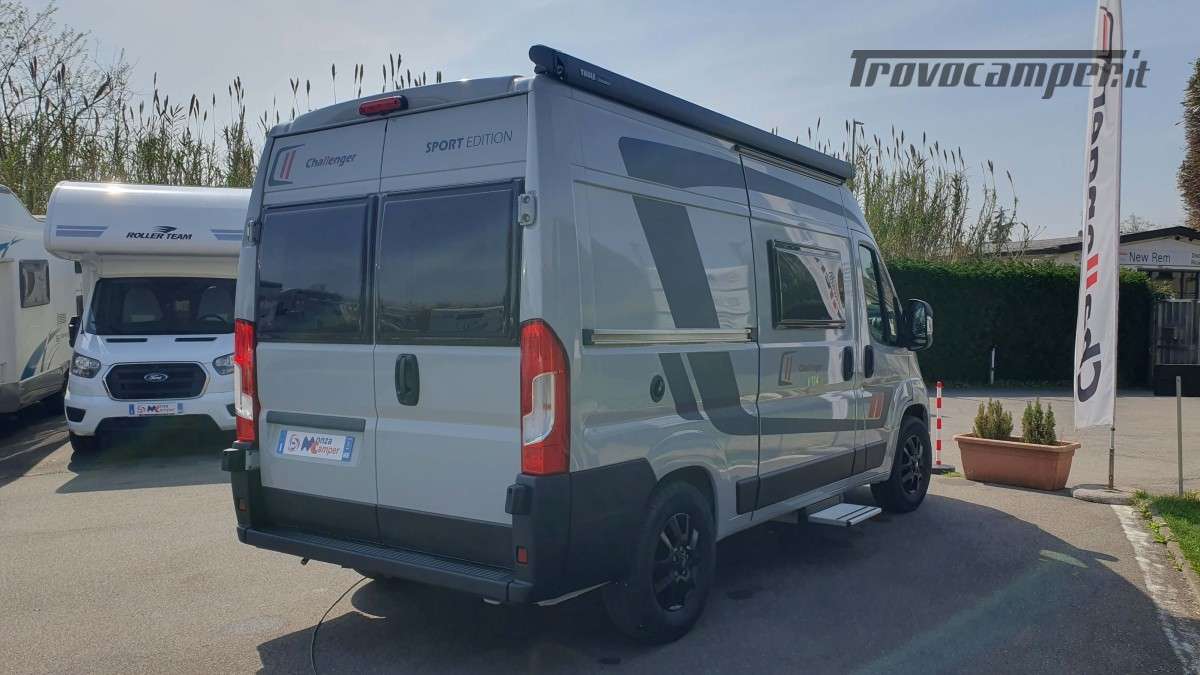 Motorizzato con un Fiat Ducato Euro 6 da 140 cavalli, il Challenger V114S Sport Edition è dotato di trazione anteriore e cambio manuale a 6 marce, che garantiscono una guida sicura e fluida in ogni situazione. Il veicolo è omologato per 4 posti e offre 2 posti letto grazie al comodo letto matrimoniale trasversale nella parte posteriore. La cucina a gas è dotata di 2 fuochi, mentre il frigorifero da 70 litri a compressore, con doppia apertura, offre ampio spazio per le provviste. Il bagno è completo di doccia e di lavandino a scomparsa per una massima resa in poco spazio.