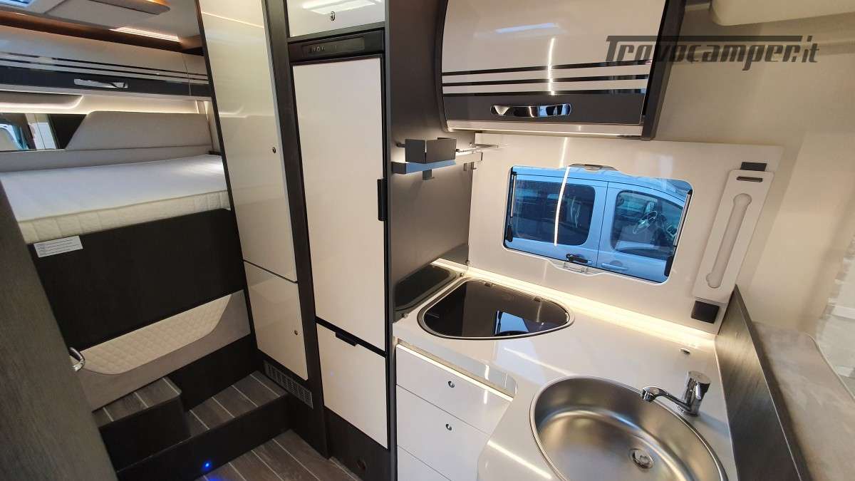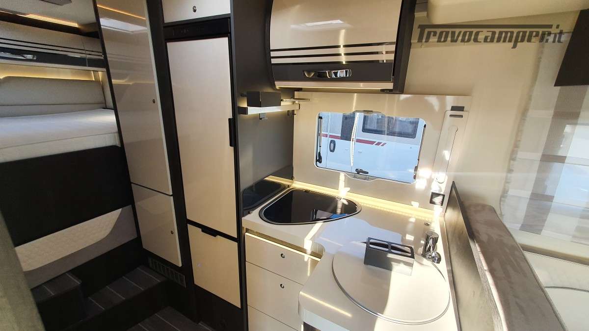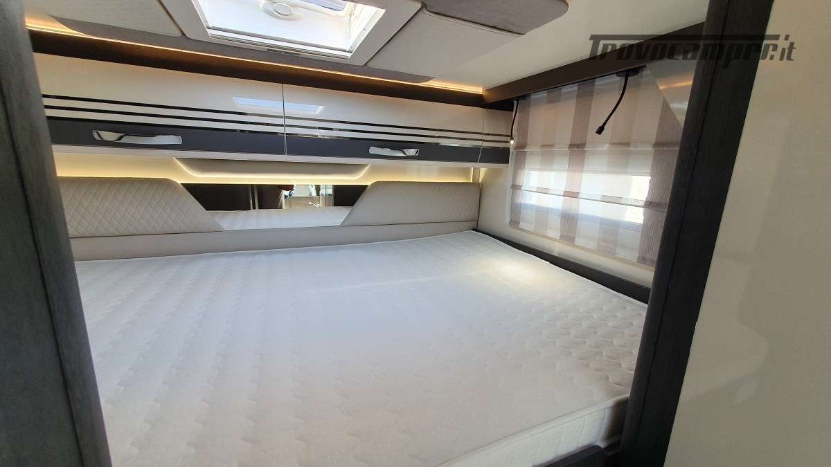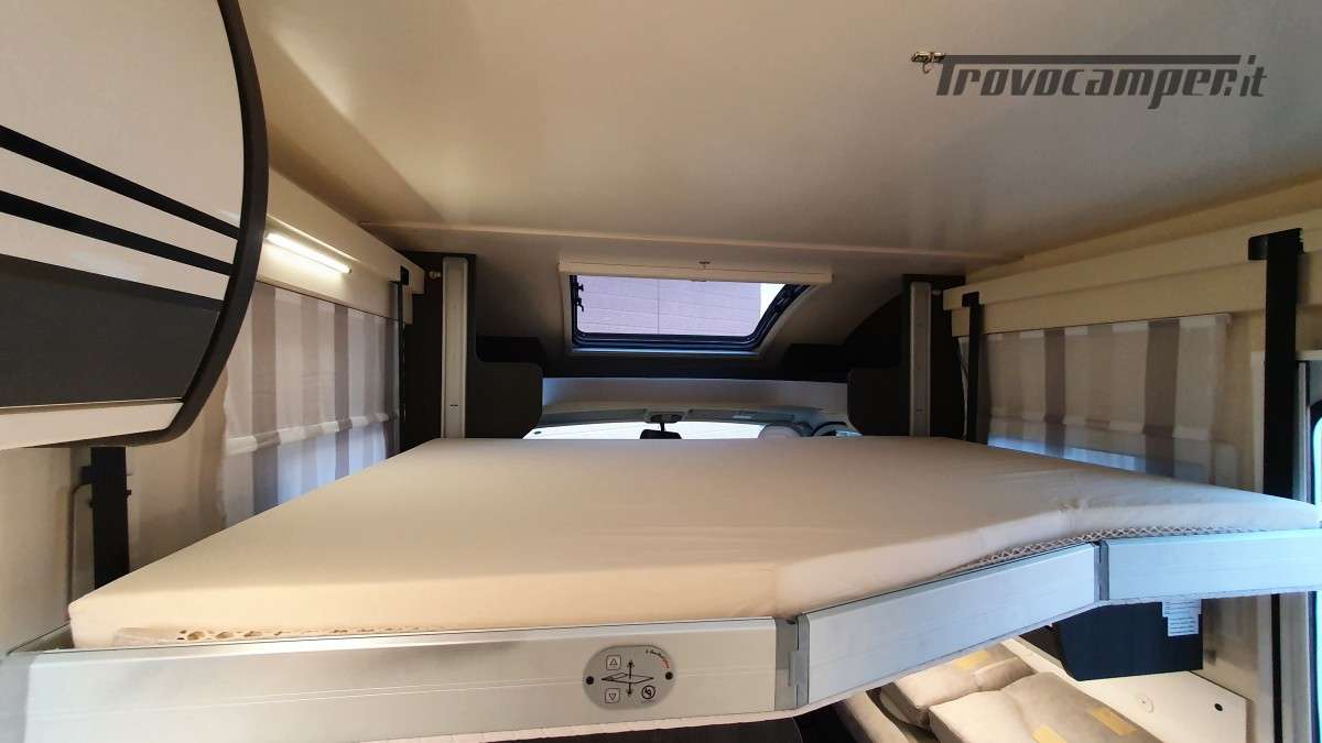 Configurazione letti : letto matrimoniale fisso, letto basculante elettrico e dinette trasformabile. Cinque posti letto in una configurazione ottimizzata per comfort e spazio.