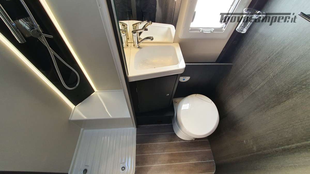 Bagno con box doccia separato, oblò dedicato e tutti gli optional per il comfort: veranda, terzo stop e sistemi di sicurezza avanzati.