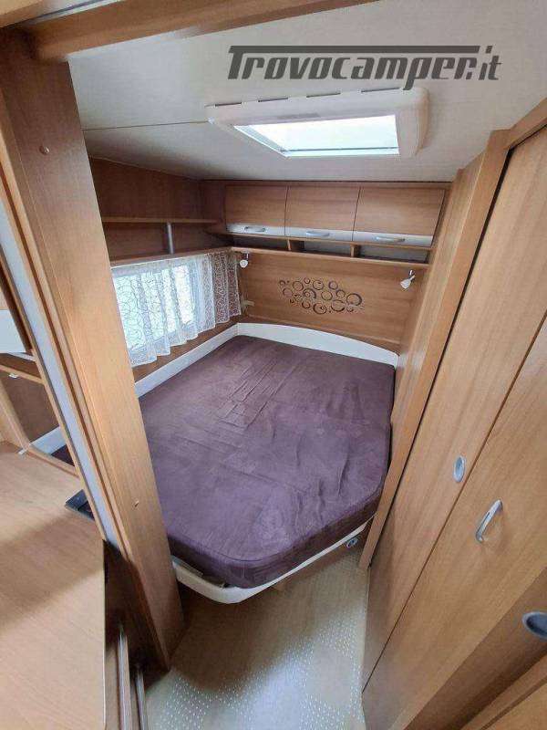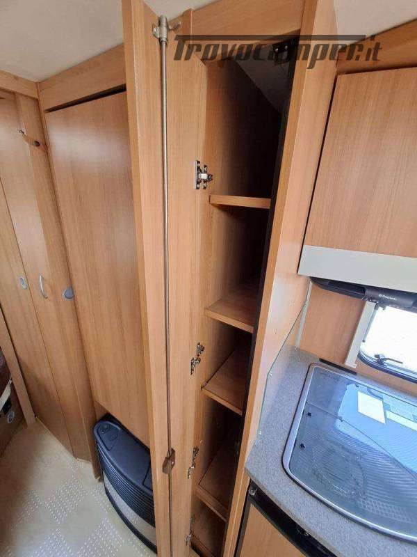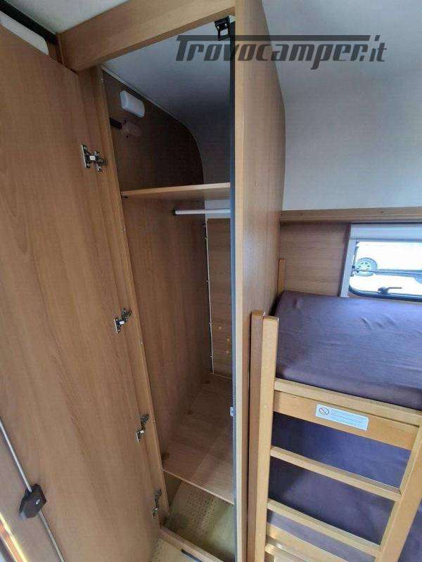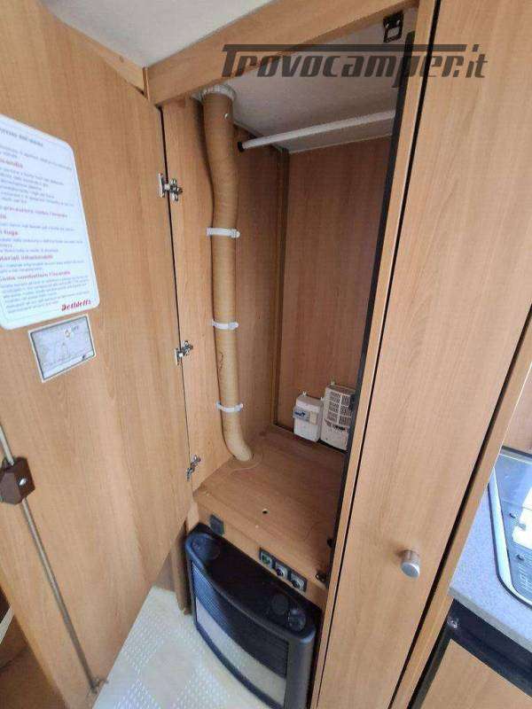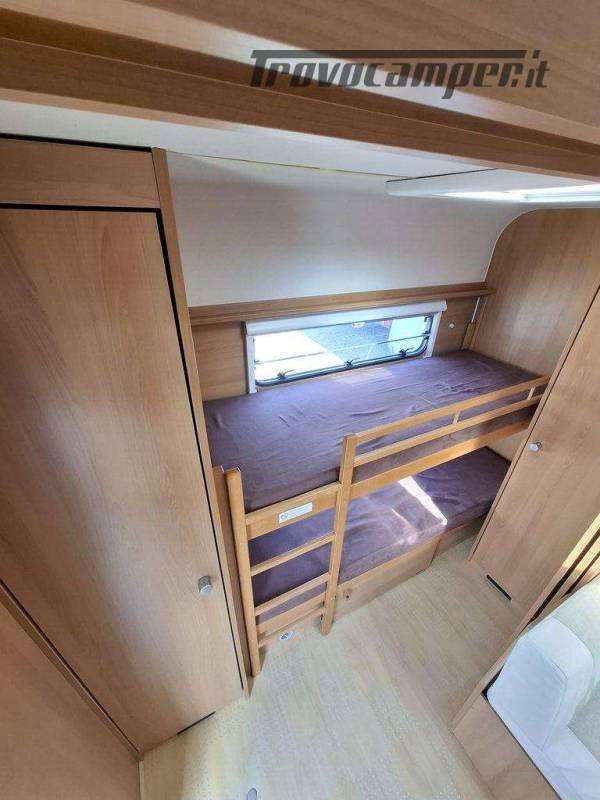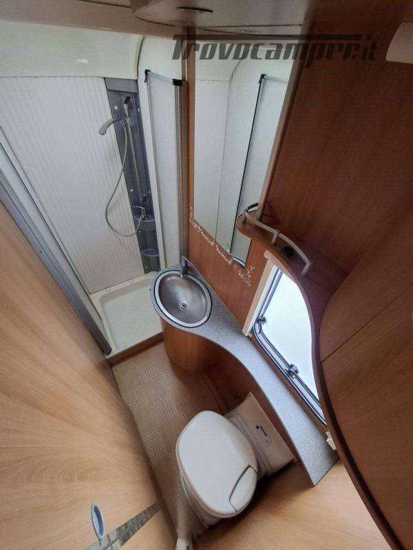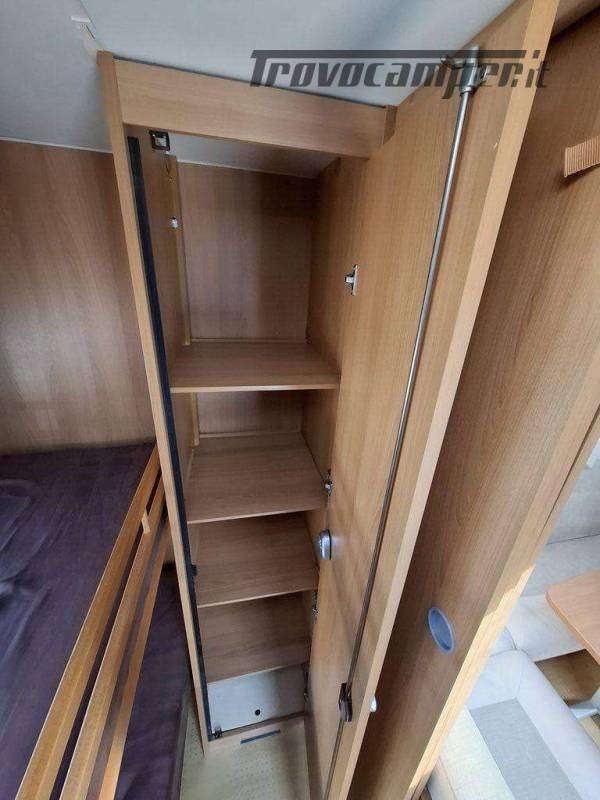 Telaio AL-KO, Stabilizzatore AL-KO, Climatizzatore Teleco Silent, Movimentatore con c.b. fisso, Tendalino Fiamma F45L, Portabici Fiamma basculante a 2 posti, Antenna TV terrestre Teleco, Pareti laterali verniciate, Piedini di stazionamento rinforzati, bigfoot Fiamma, Sportello di servizio laterale dx, Vano bombole 2x12kg con apertura a pantografo, Attacco rapido del gas esterno, Carter copritimone, Luce esterna, Luce esterna integrata al tendalino, Porta ingresso a scuderia, Zanzariera scorrevole all'ingresso, Maxi oblò centrale, dinette a ferro di cavallo trasformabile a letto, cucina con 3 fuochi, cappa aspirante, forno a gas, frigo trivalente da 98lt., Riscaldamento Trumatic, Termoventilazione 12V, Boiler 220V, Boiler a gas 10lt., Divisorio a porta rigida per letto a castello, Divisorio a porta rigida per letto matrimoniale, Bagno con finestra, Toilette a cassetta estraibile, doccia con porta rigida, piatto doccia con 2 punti di scarico, oblò in doccia, Serbatoio acqua potabile fisso da 80lt., Serbatoio di recupero acque grigie con ruote.