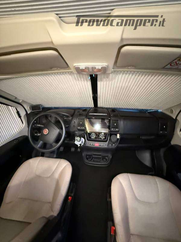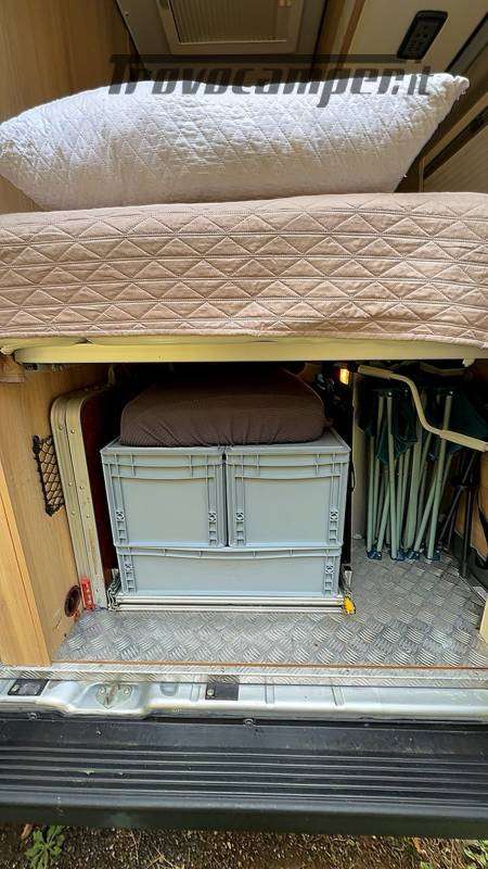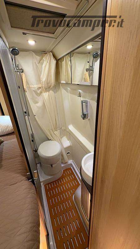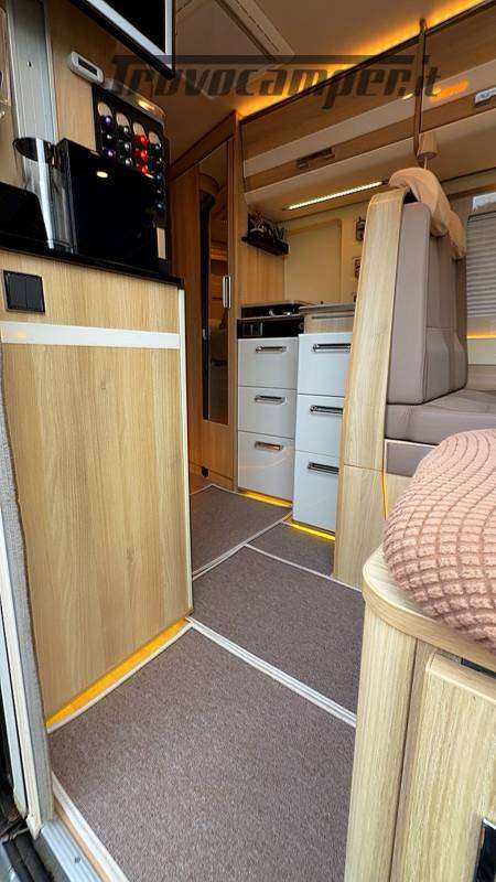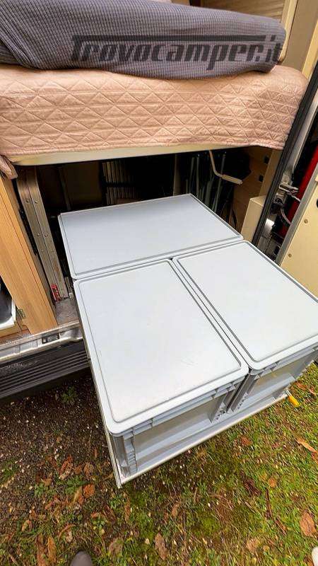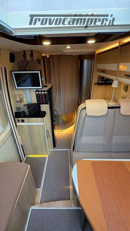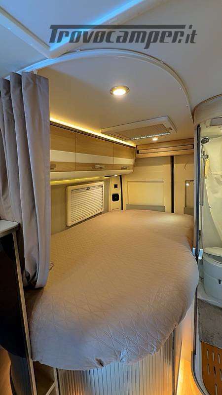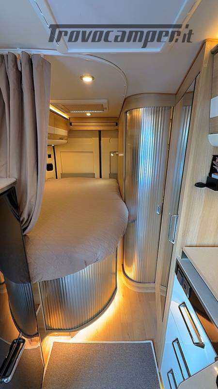 PUNTI DI FORZA = Salotto spazioso convertibile in posto letto supplementare, Letto alla francese dalle dimensioni confortevoli, Gradino retrattile per accesso al letto, Maxi bagno posteriore, Blocco cucina con superficie cassetti bianca lucida arrotondata, Rivestimento cucina con compartimenti retroilluminati integrati, Tenda scorrevole ai piedi del letto per accesso al gavone dall'interno e ripiano portaoggetti, Grandi guardaroba, Mobile TV con cestino scorrevole.