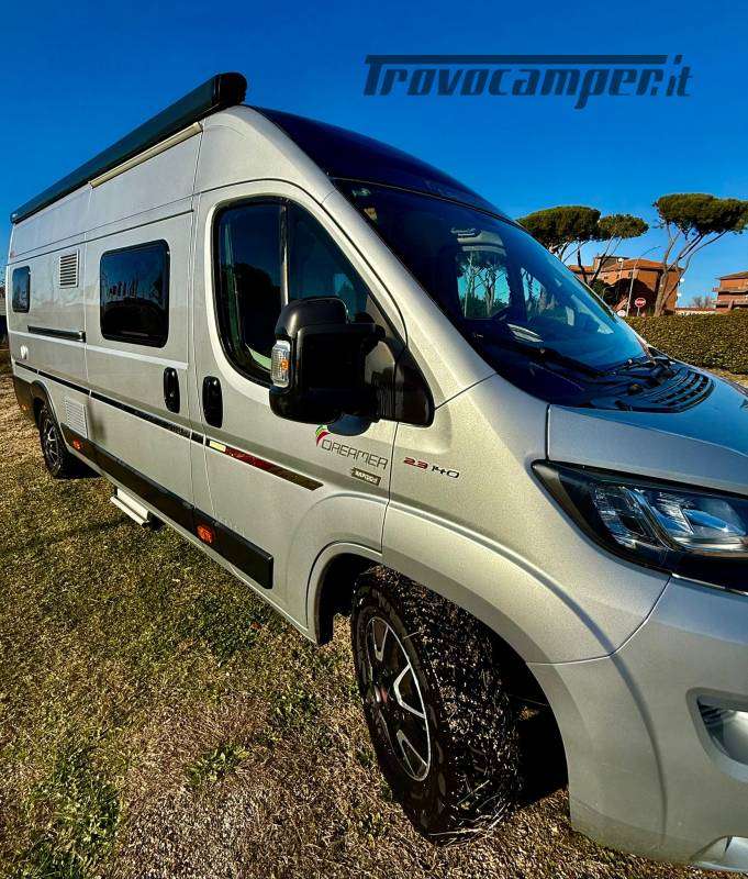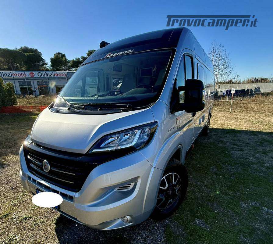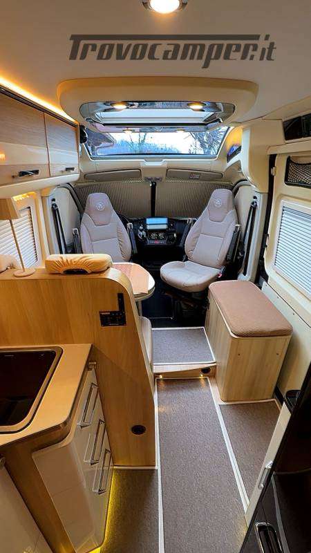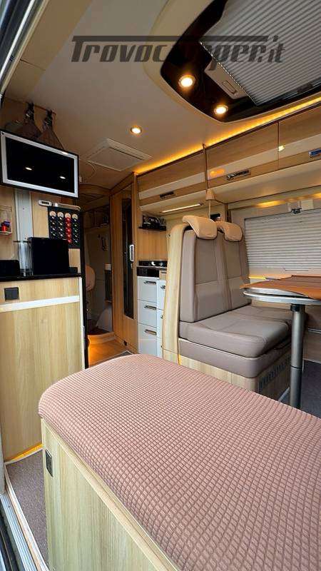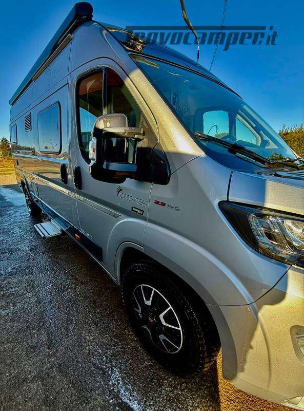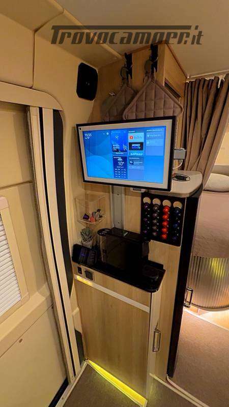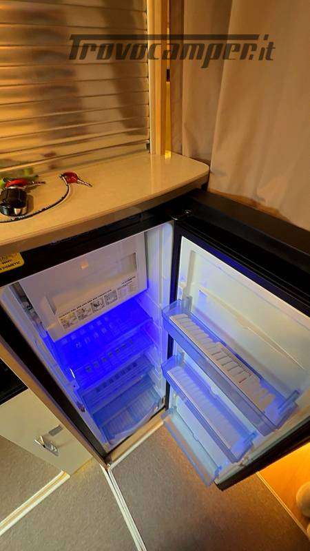PUNTI DI FORZA = Salotto spazioso convertibile in posto letto supplementare, Letto alla francese dalle dimensioni confortevoli, Gradino retrattile per accesso al letto, Maxi bagno posteriore, Blocco cucina con superficie cassetti bianca lucida arrotondata, Rivestimento cucina con compartimenti retroilluminati integrati, Tenda scorrevole ai piedi del letto per accesso al gavone dall'interno e ripiano portaoggetti, Grandi guardaroba, Mobile TV con cestino scorrevole.