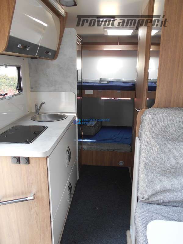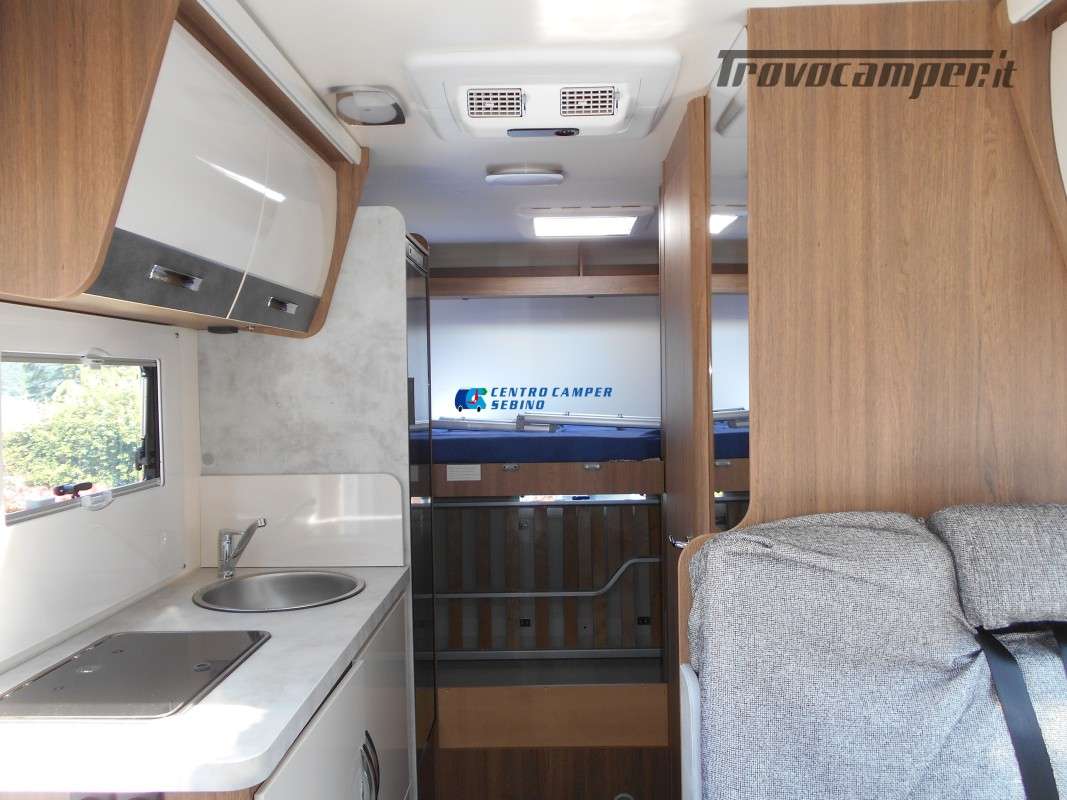 Alzando la rete inferiore del letto a castello è possibile avere un maxi garage avendo comunque 6 posti letto di cui 4 sempre pronti + letto matrimoniale in dinette.