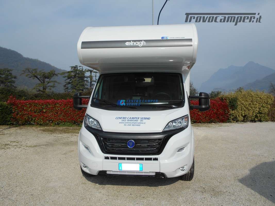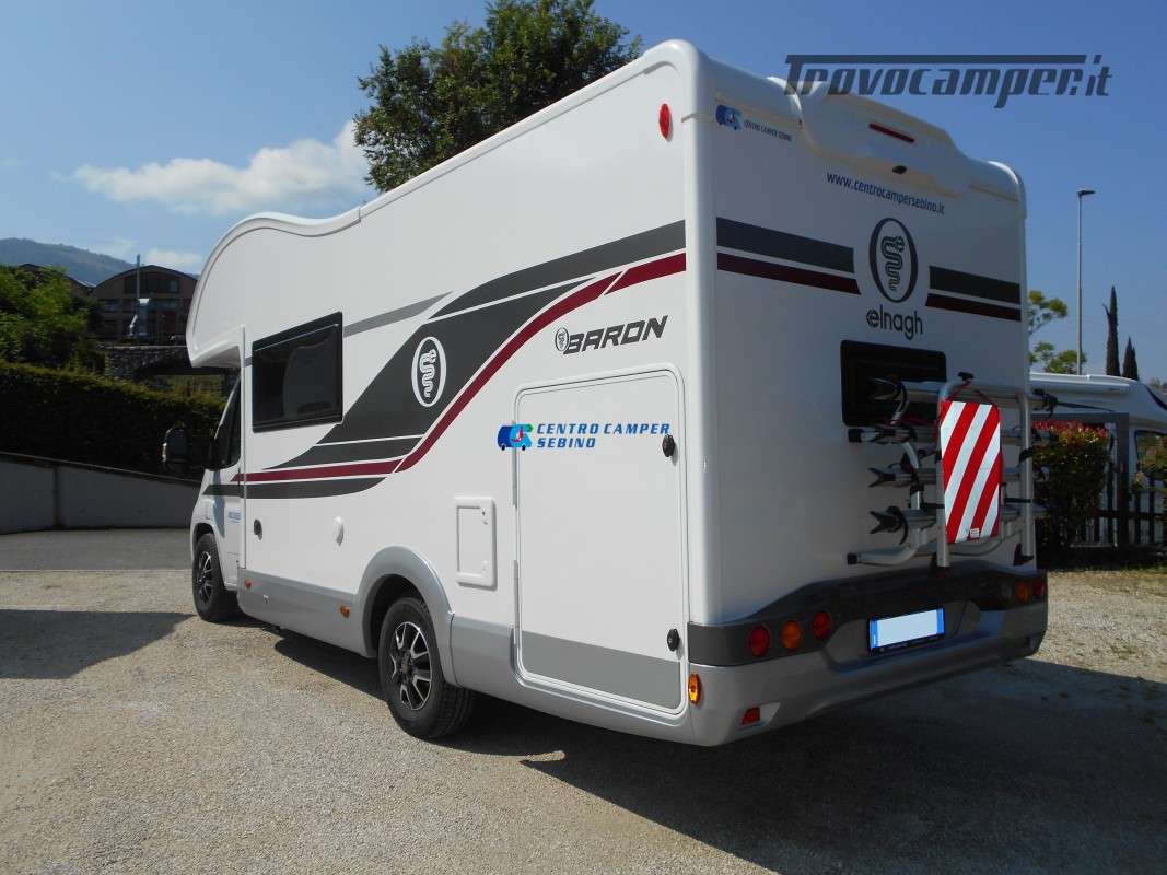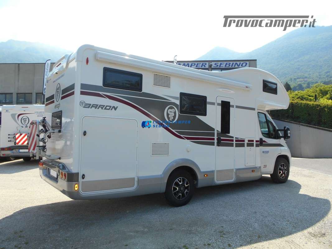Elnagh Baron 20, camper mansardato 6,99 mt con 8 posti letto (6 posti letto sempre pronti tra cui letto matrimoniale in mansarda e letto a castello matrimoniale posteriore + letto matrimoniale ricavabile dalla dinette) e 6 posti viaggio omologati.