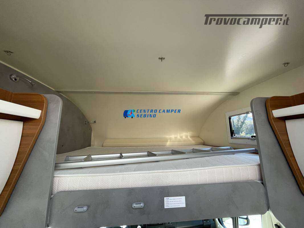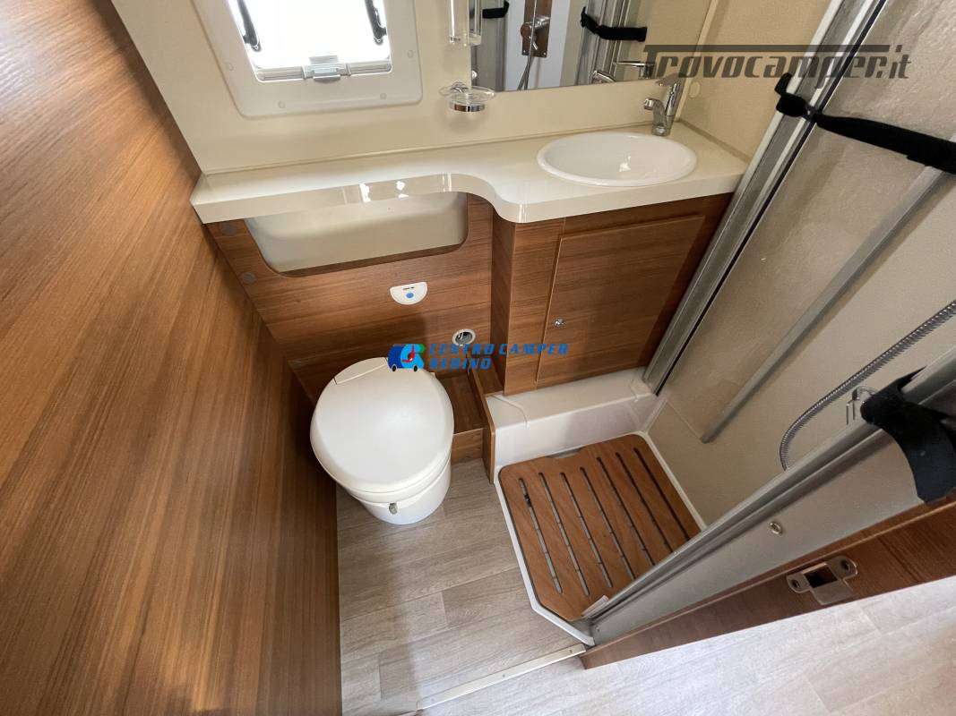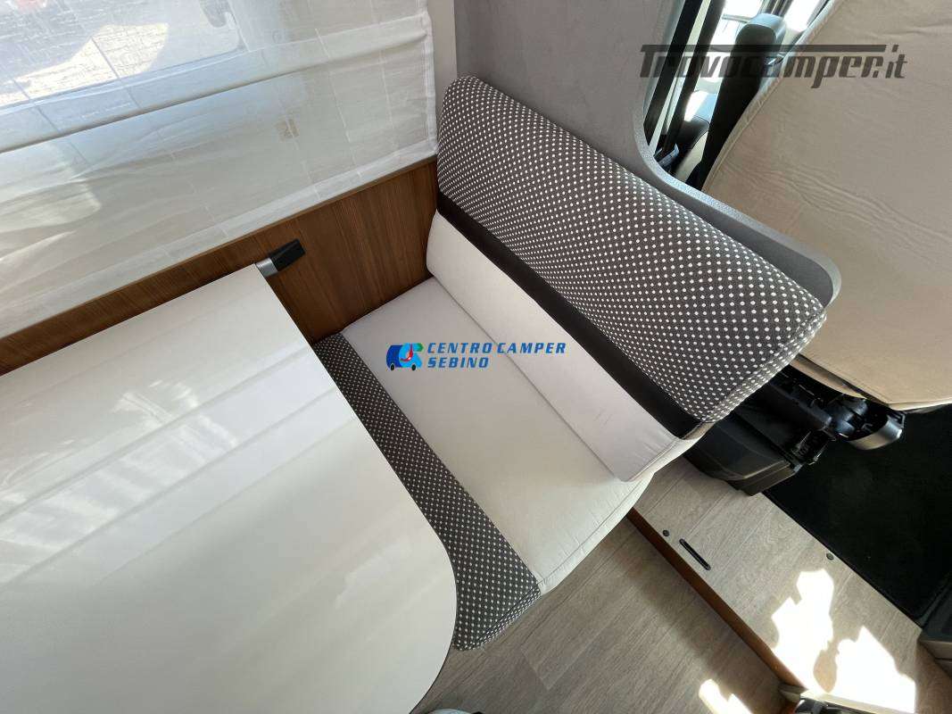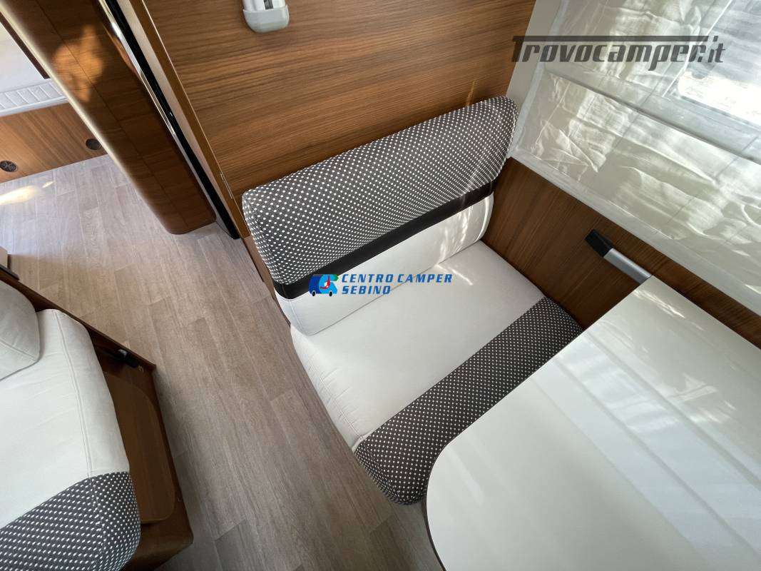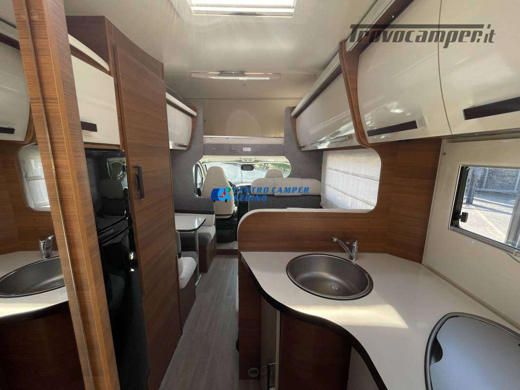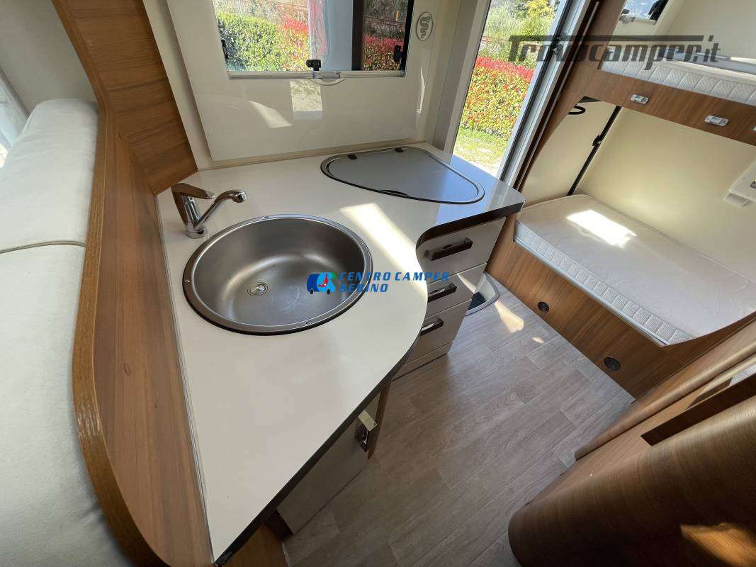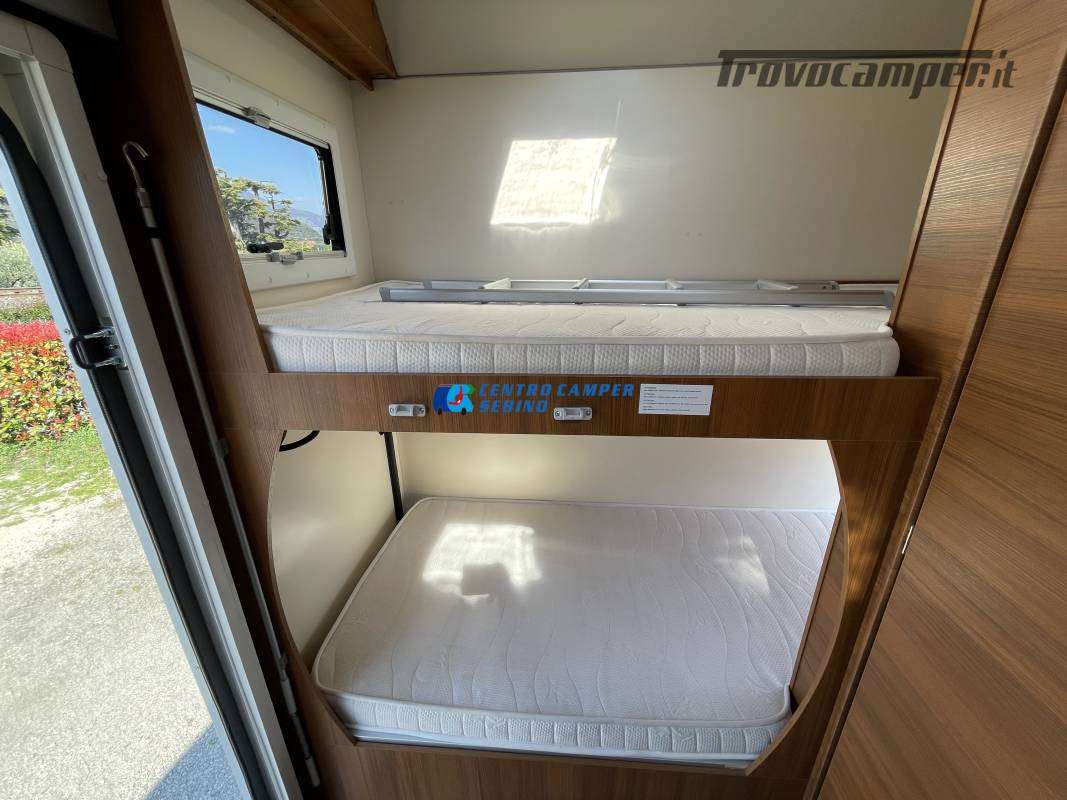 Disposizione interna versatile e spaziosa con ampia mansarda finestrata, doppia dinette e letti a castello trasversali, gavone a volume variabile, cucina ad angolo e bagno con finestra e con doccia separata (comodo box doccia con antine in plexiglass, no tendina).