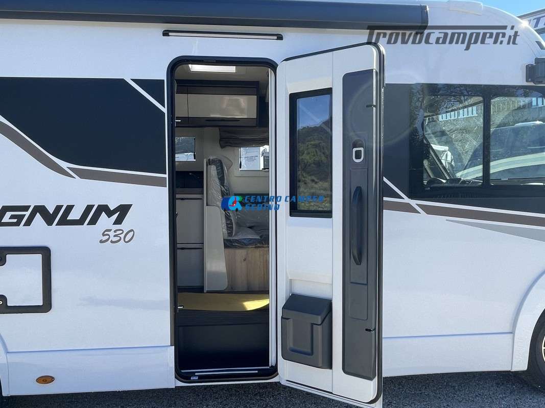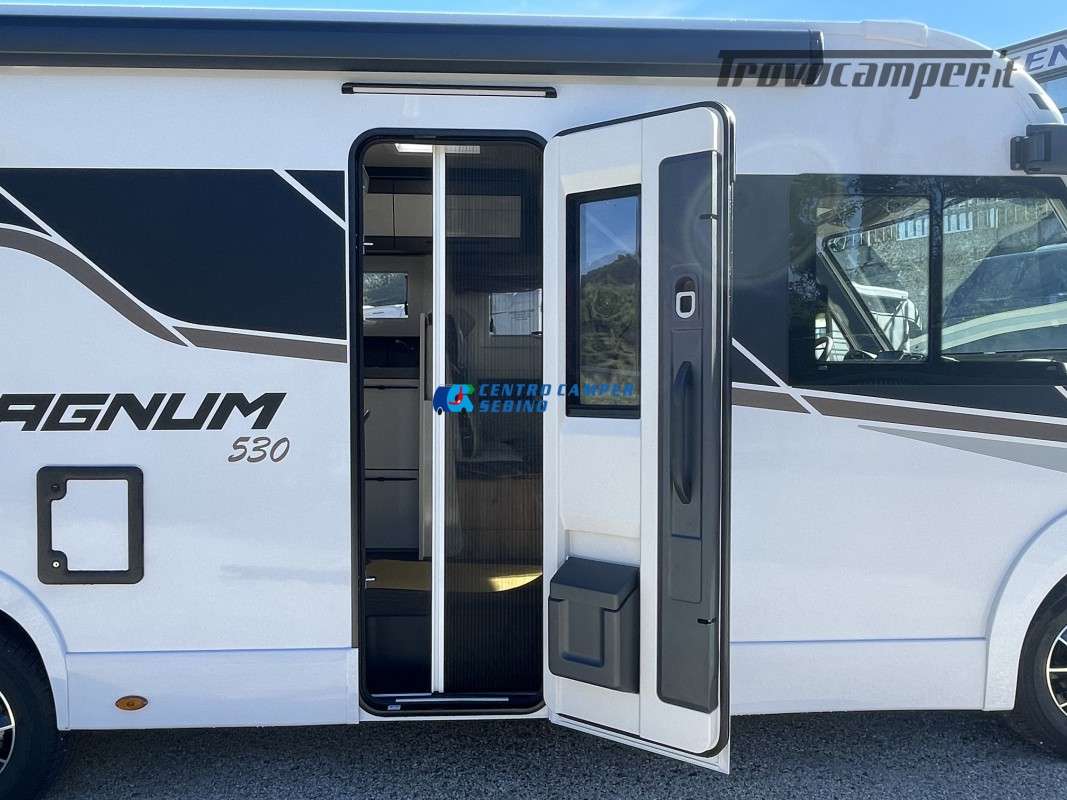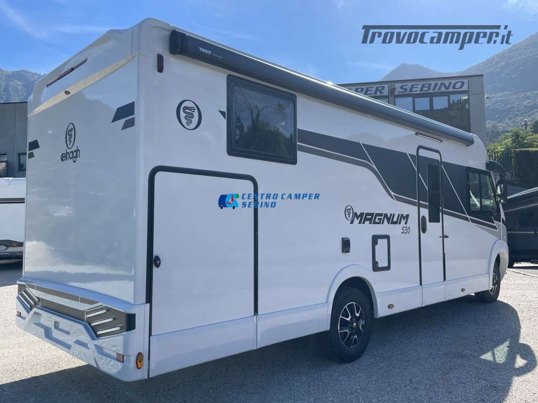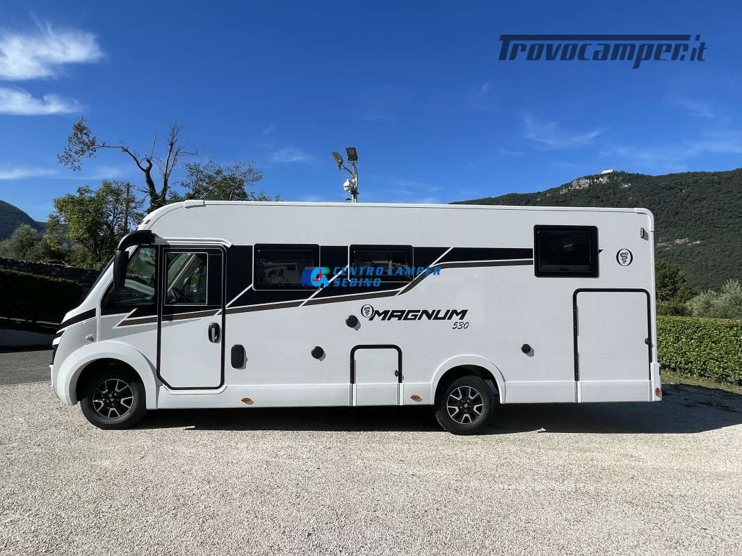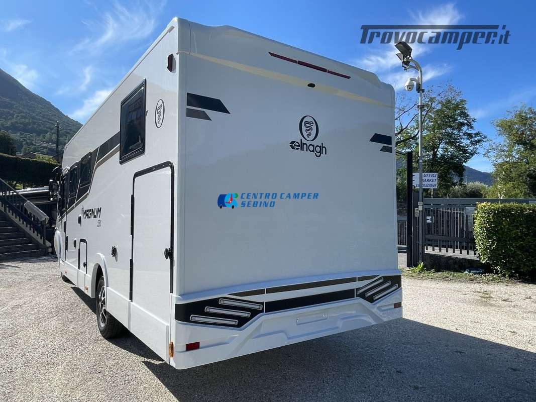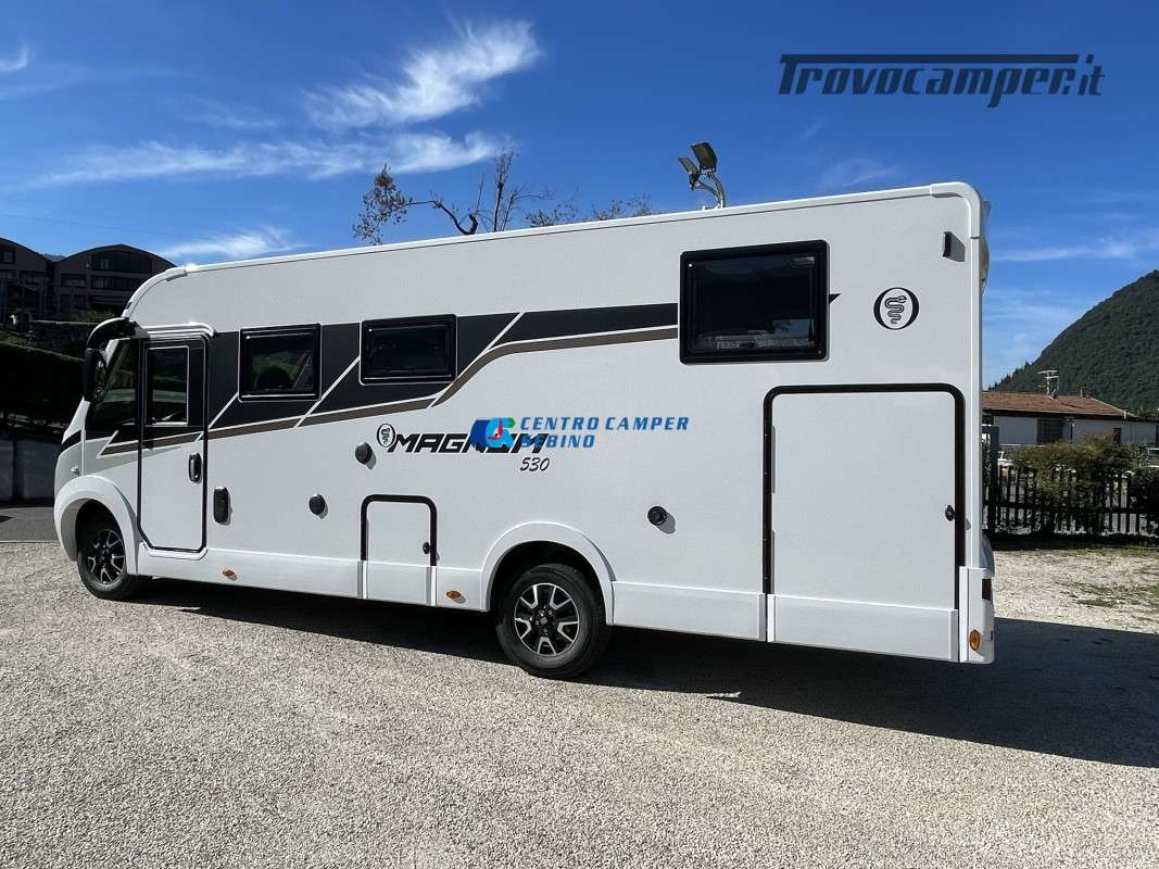 Nuovo Elnagh MAGNUM 530 camper motorhome 7,45 mt con 5 posti letto e viaggio, letti gemelli unibili e letto basculante matrimoniale, comoda dinette con sedili girevoli trasformabile in un letto aggiuntivo, spaziosa cucina ad angolo con grande frigorifero, maxi garage, porta divisoria zona giorno e zona notte, bagno con box doccia separato.
