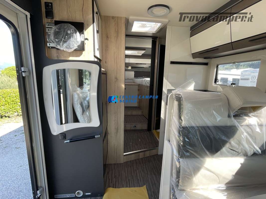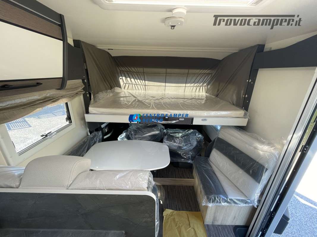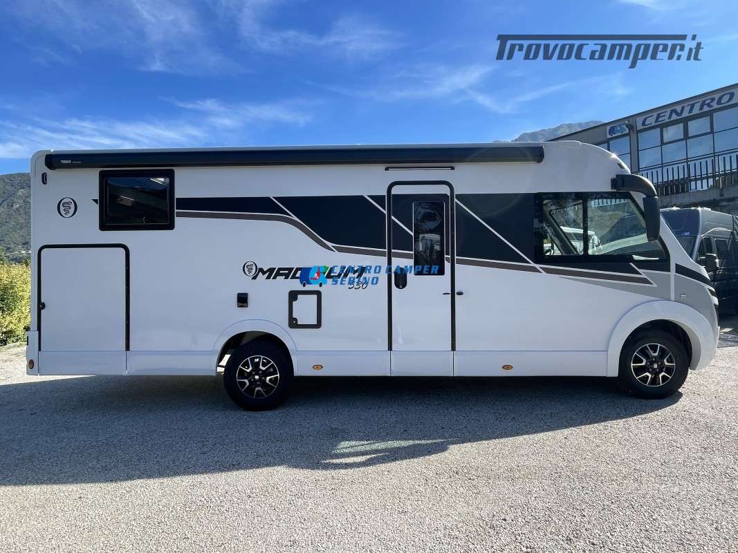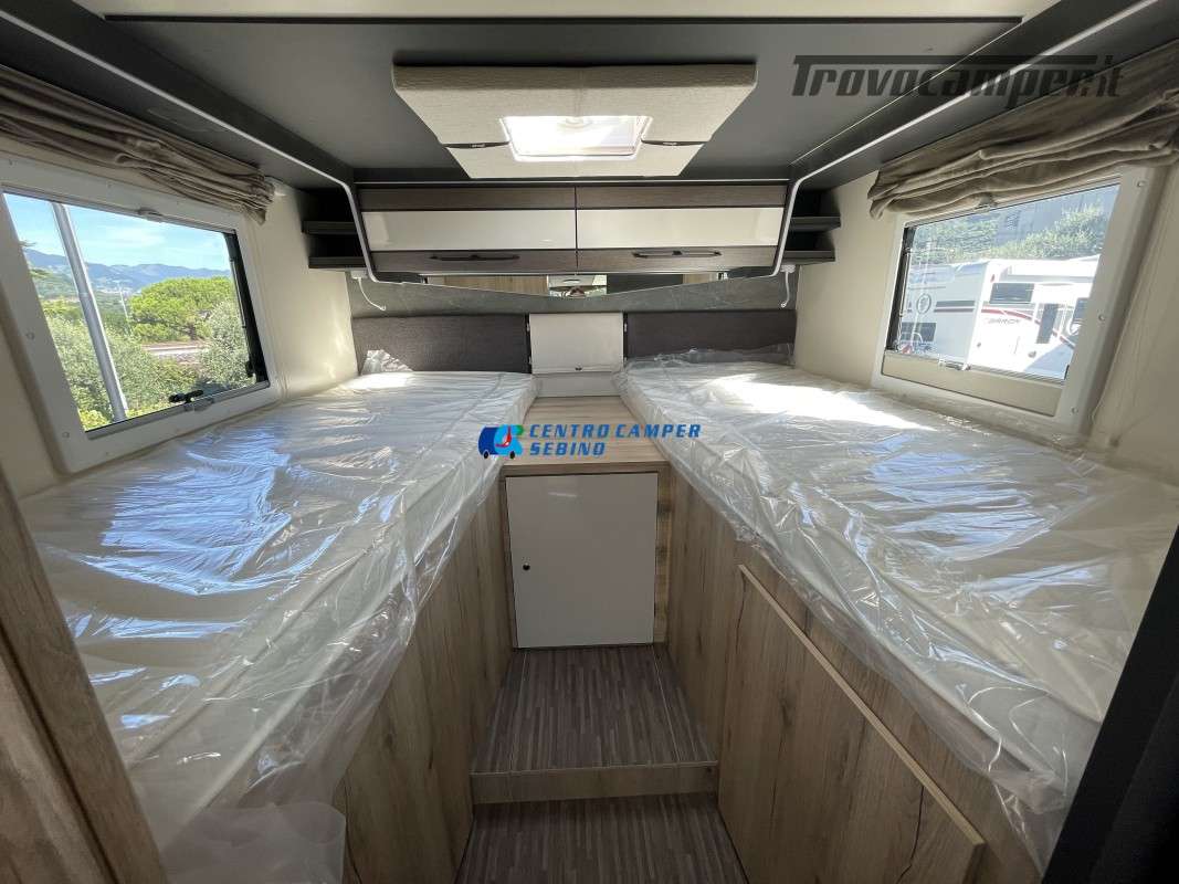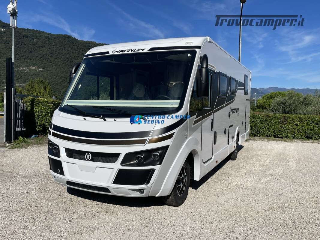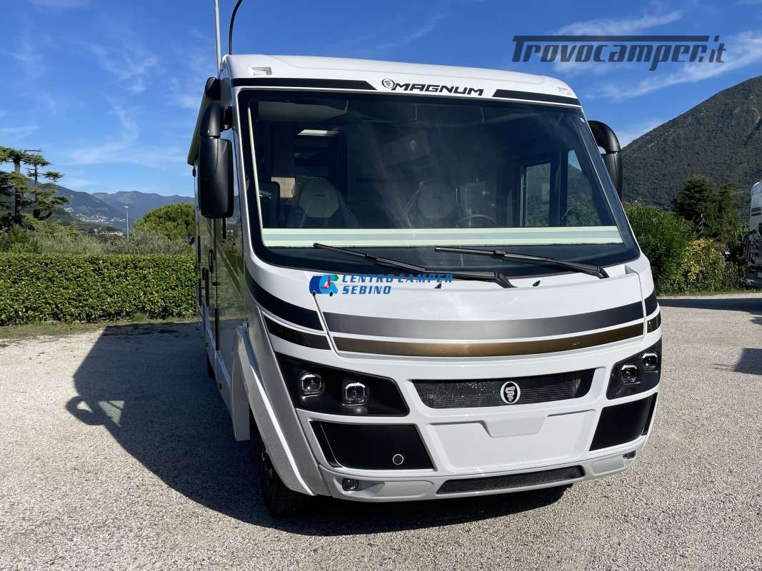 Nuovo Elnagh MAGNUM 530 camper motorhome 7,45 mt con 5 posti letto e viaggio, letti gemelli unibili e letto basculante matrimoniale, comoda dinette con sedili girevoli trasformabile in un letto aggiuntivo, spaziosa cucina ad angolo con grande frigorifero, maxi garage, porta divisoria zona giorno e zona notte, bagno con box doccia separato.