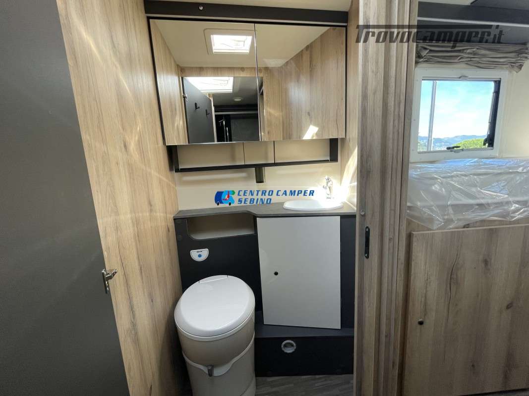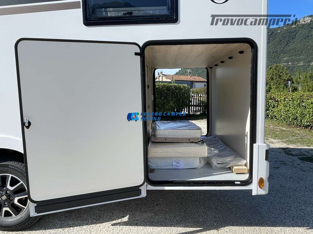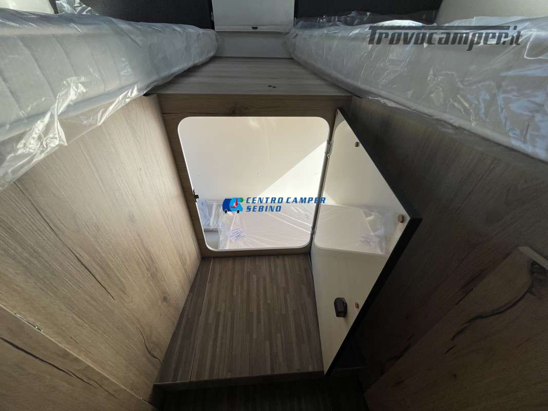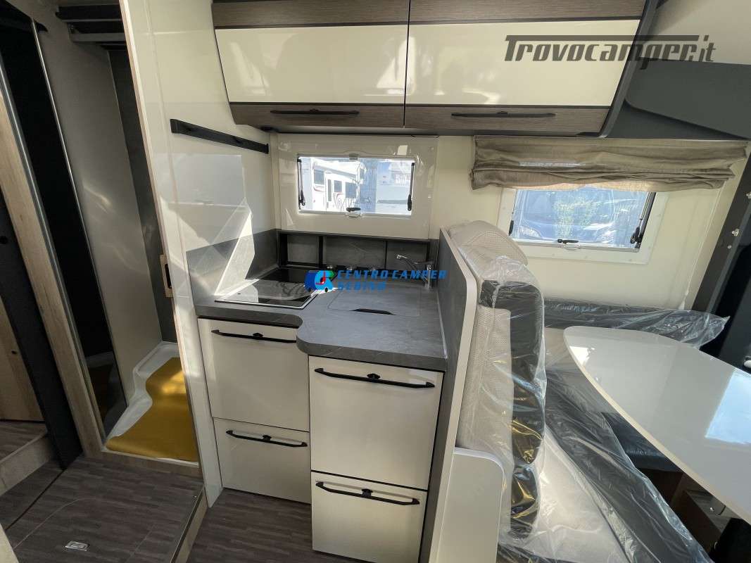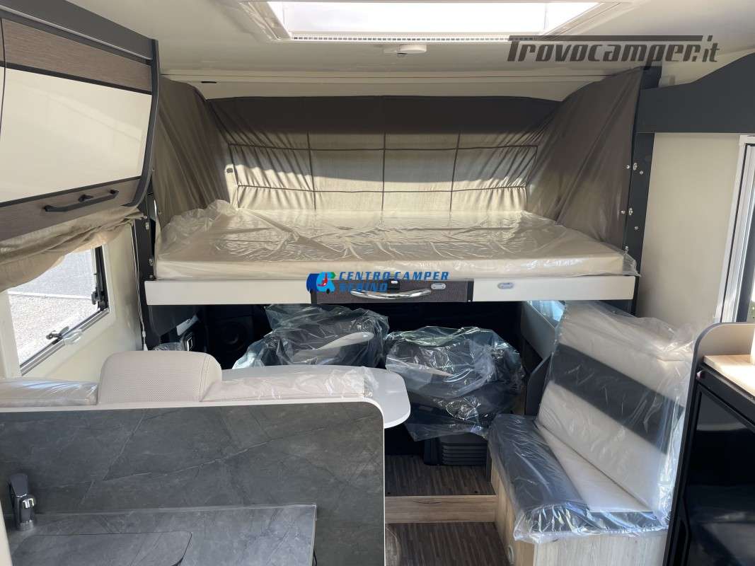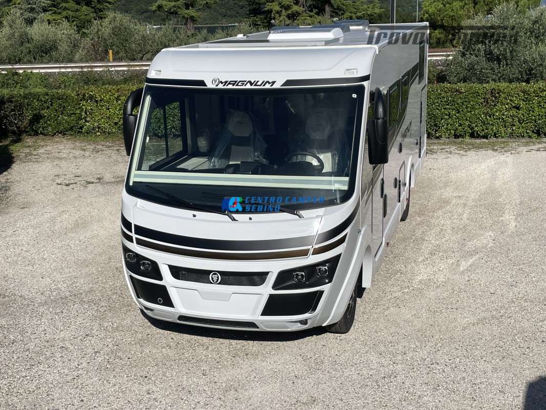 Nuovo Elnagh MAGNUM 530 camper motorhome 7,45 mt con 5 posti letto e viaggio, letti gemelli unibili e letto basculante matrimoniale, comoda dinette con sedili girevoli trasformabile in un letto aggiuntivo, spaziosa cucina ad angolo con grande frigorifero, maxi garage, porta divisoria zona giorno e zona notte, bagno con box doccia separato.