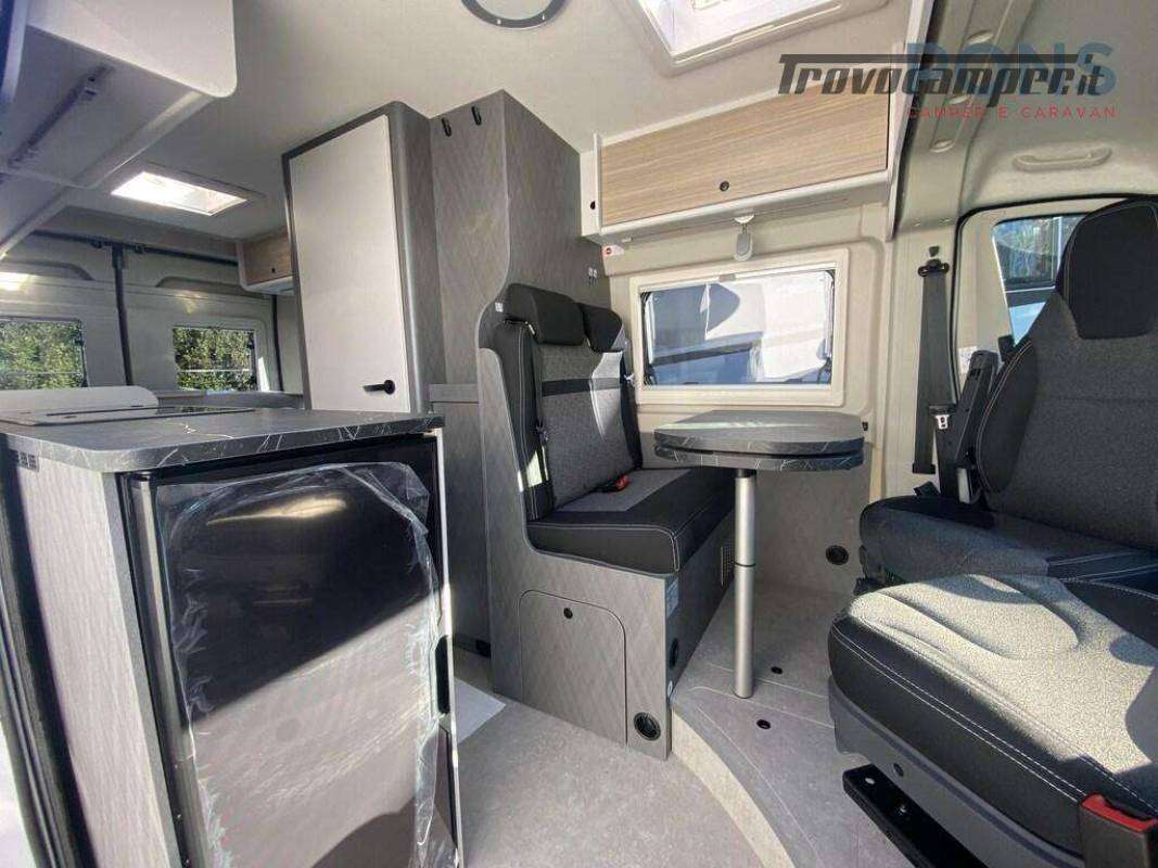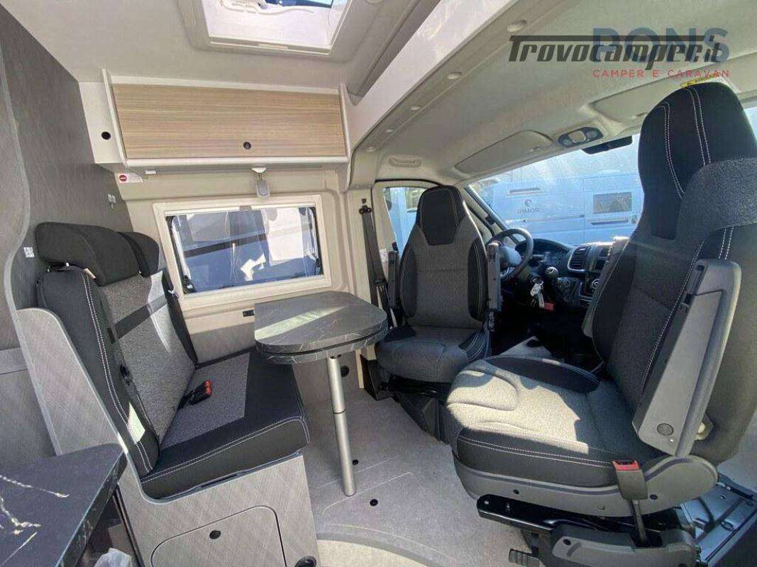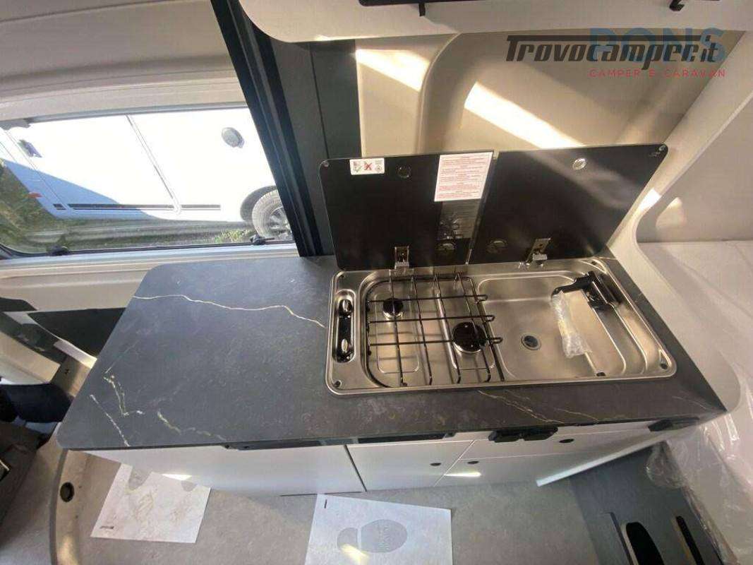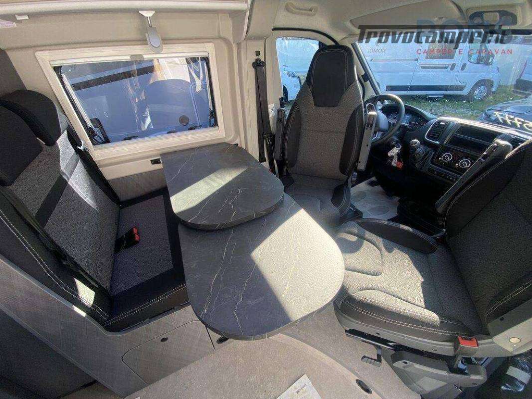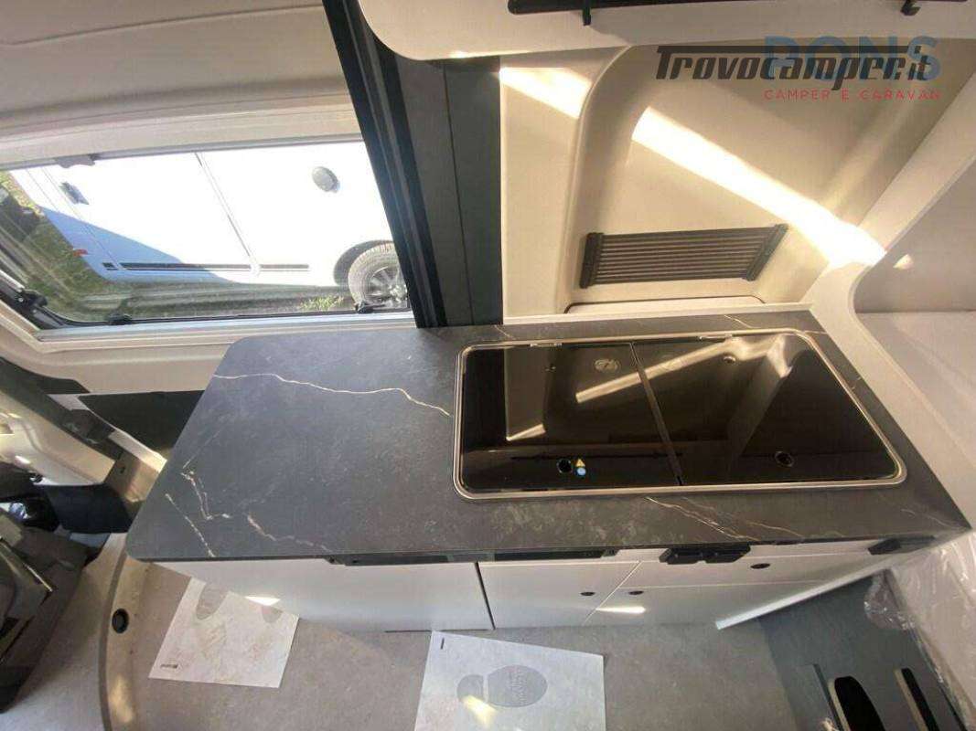 Sviluppato su una lunghezza di soli 5,99m, accedendo al veicolo ci si affaccia su una luminosa dinette con sedili cabina girevoli e tavolo con piano d?appoggio supplementare orientabile, cucina composta da piano cottura a due fuochi e lavello oltre a un comodo piano di appoggio.