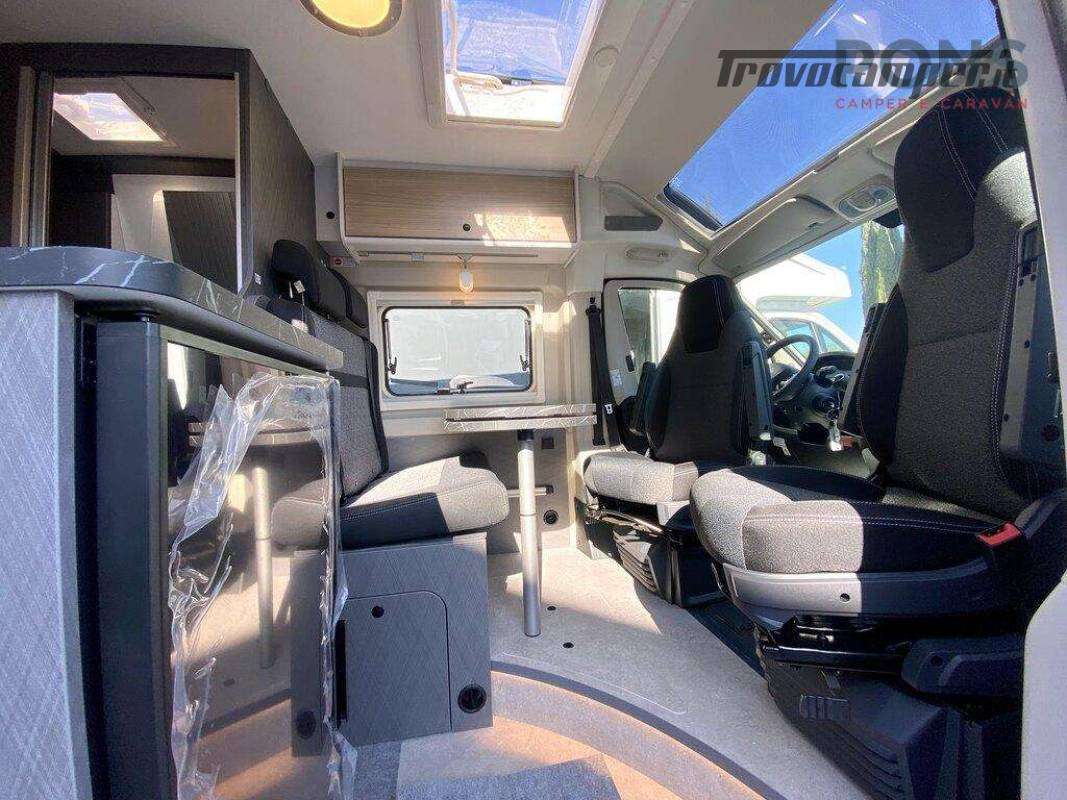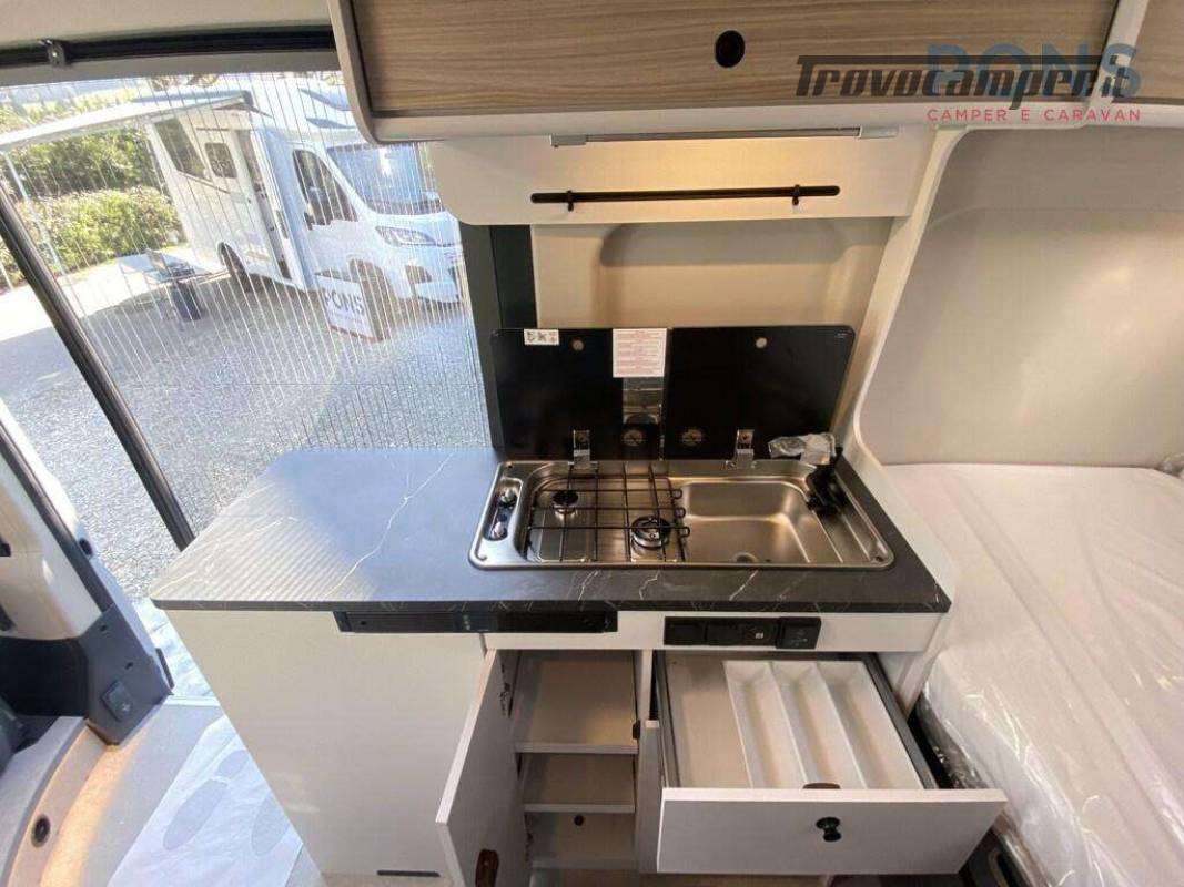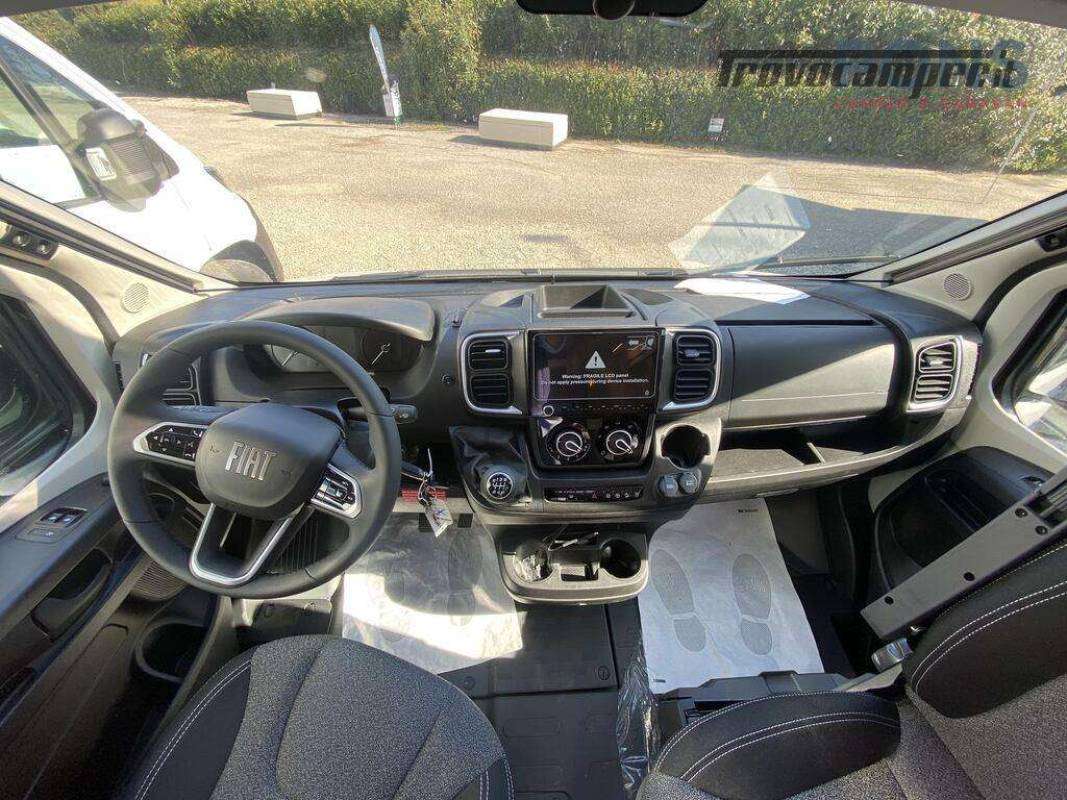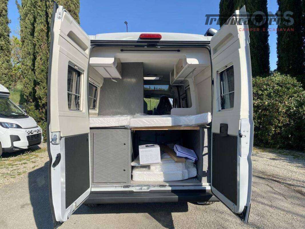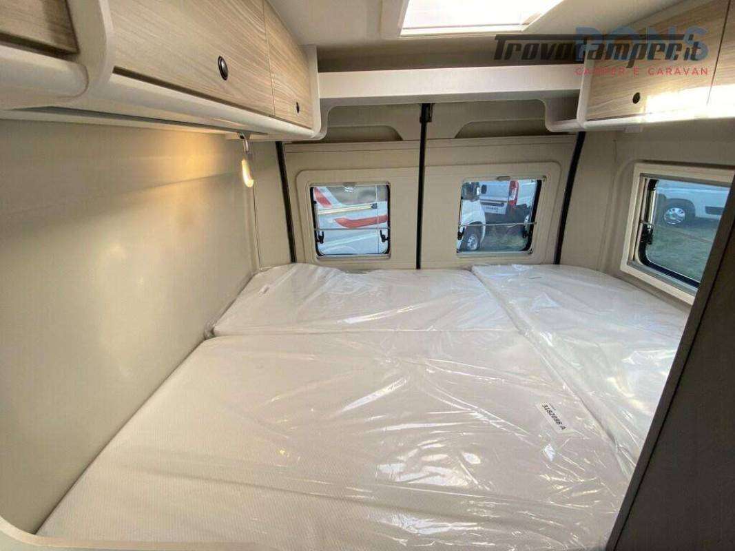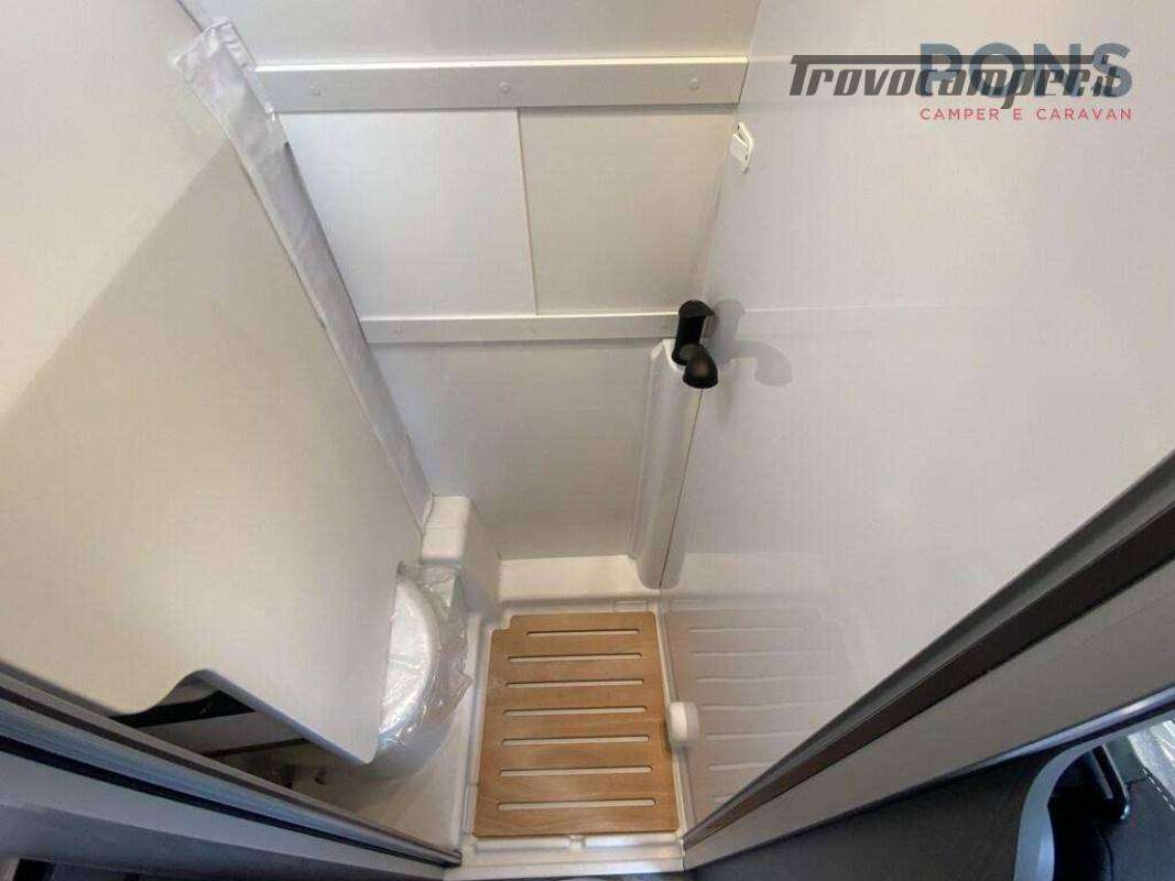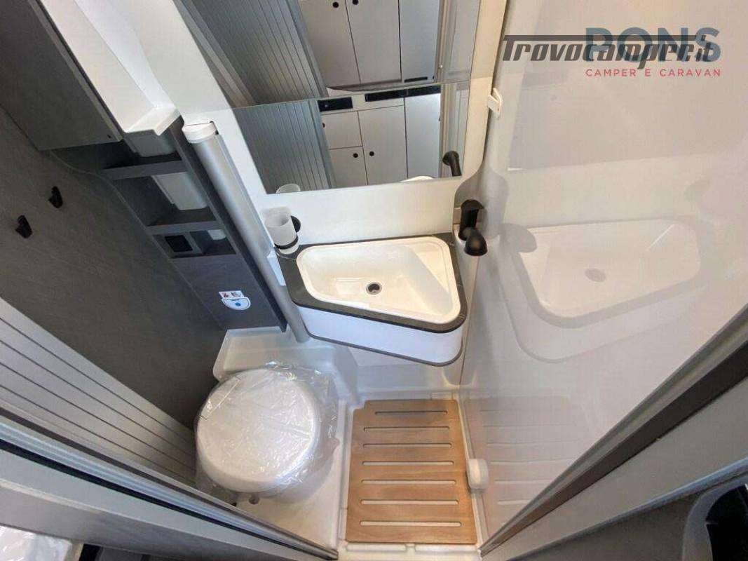 Caratteristica principale del veicolo: bagno e doccia in un unico ambiente separabili grazie alla parete traslabile. Comodo letto trasversale in coda con spazio sottostante per lo stivaggio.