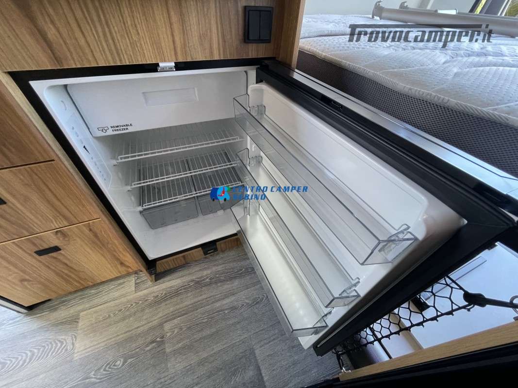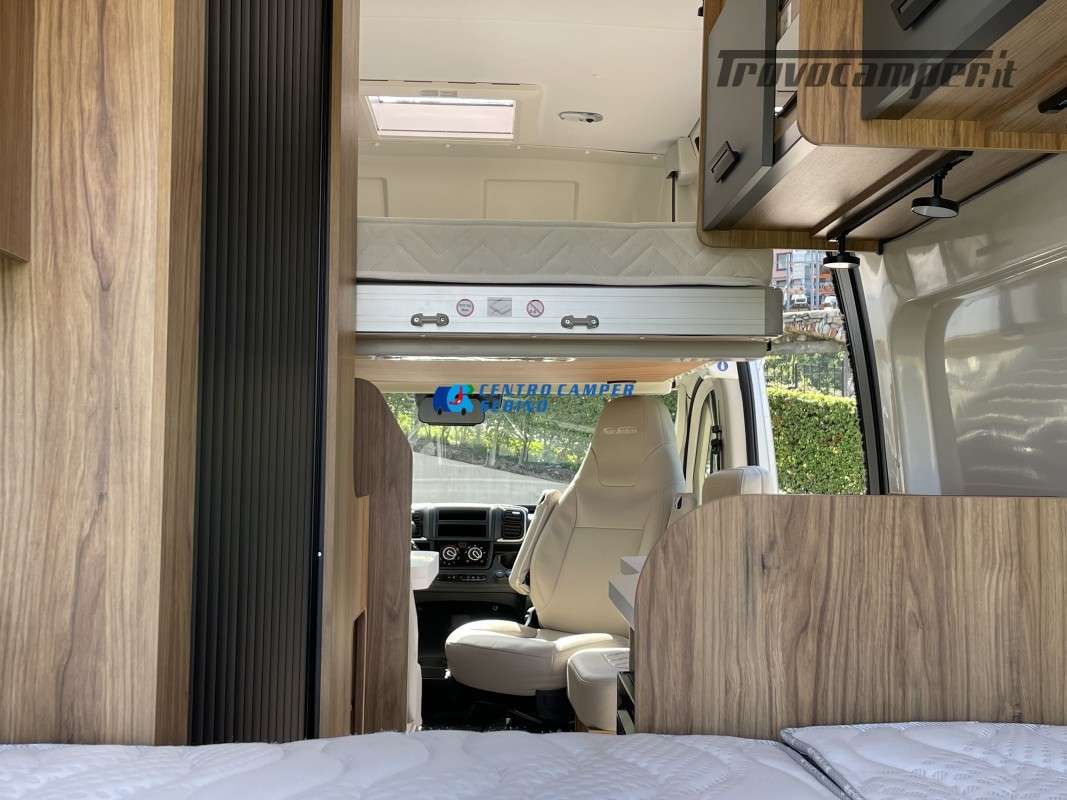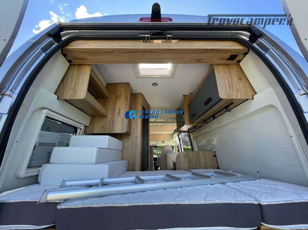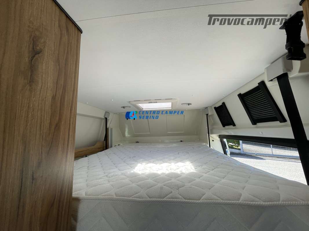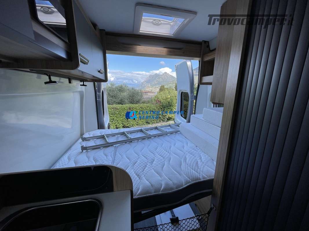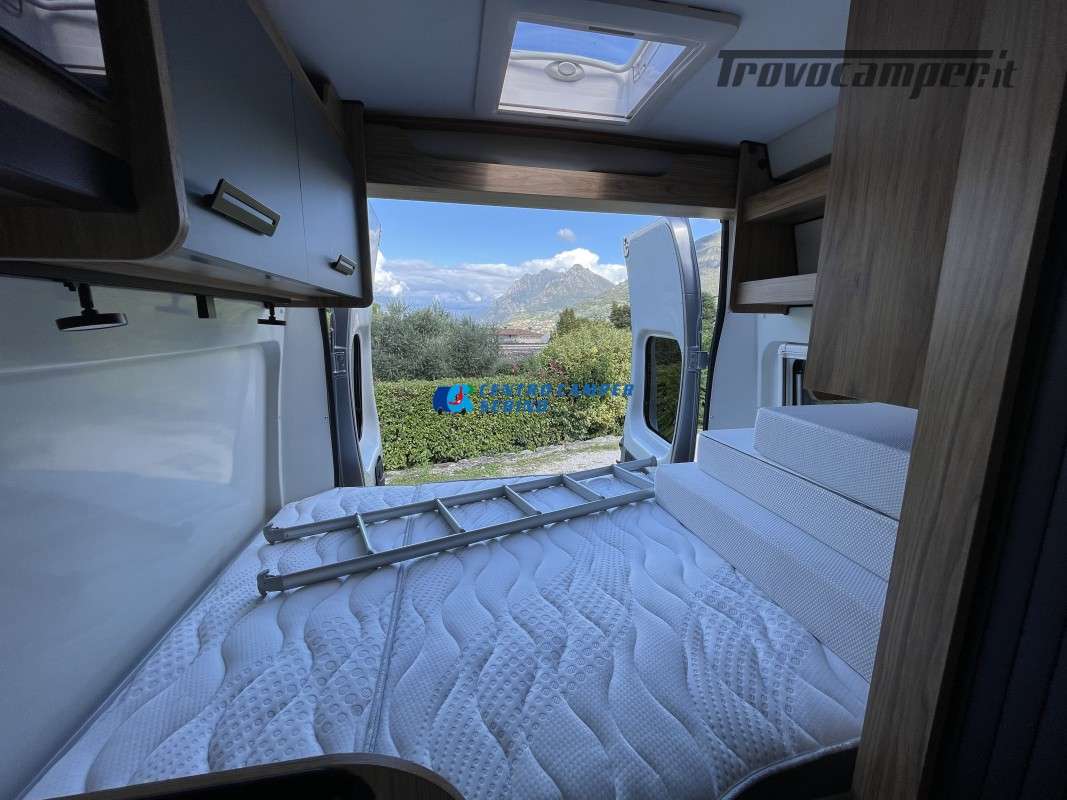 Posti letto 5 di cui 4 posti letto sempre pronti (doppio letto matrimoniale: letto matrimoniale trasversale posteriore 184x130/123 cm c.a. amovibile per aumentare il volume di carico del garage e letto matrimoniale basculante anteriore elettrico 197x132 cm c.a+ letto singolo aggiuntivo in dinette 184x99 cm c.a.)