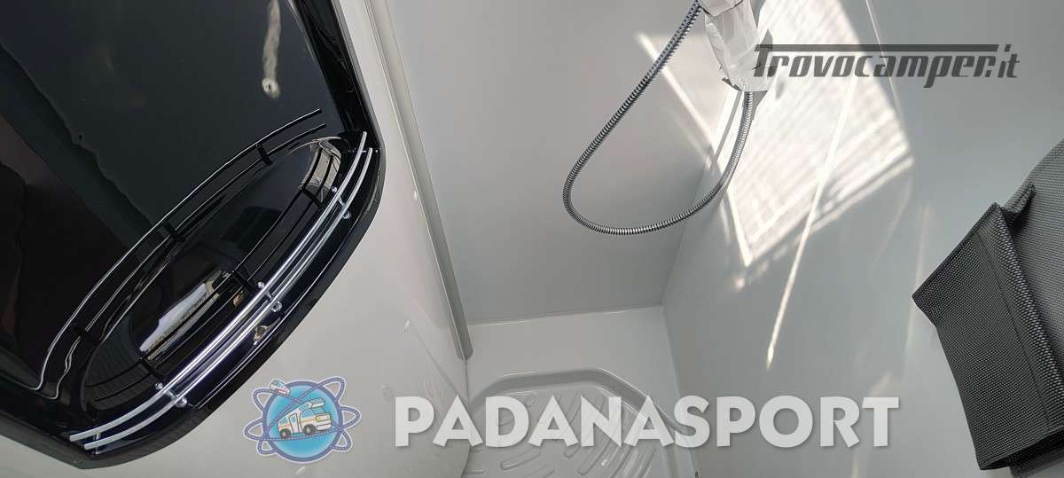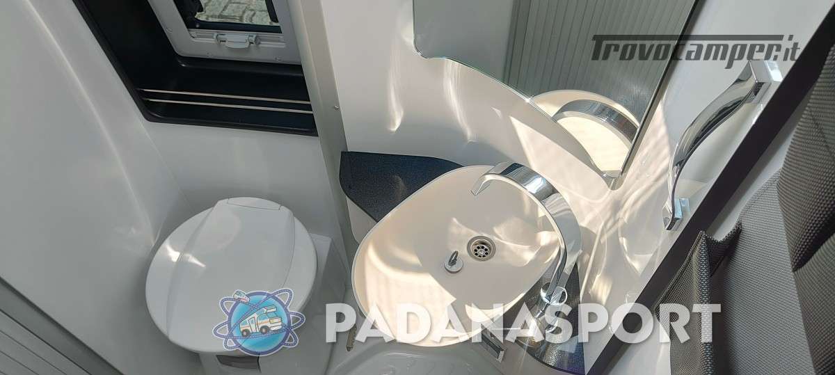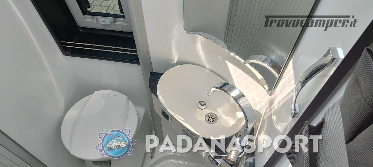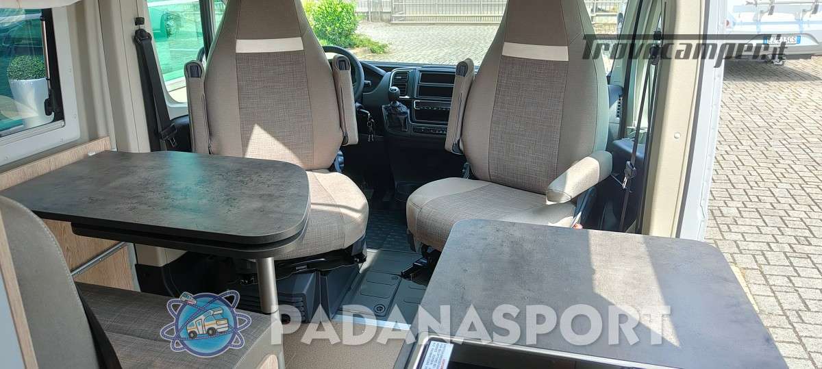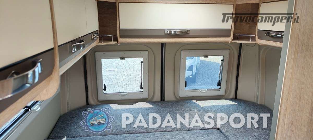 Il modello PLUS con pensili Tricolor e tapezzeria Mindoro presenta la classica disposizione con letto trasversale in coda,ampia dinette anteriore con tavolo allargabile (opt),cucina con il nuovo piano cottura/lavello e il bagno premium con parete girevole da ora completo di pensile,pacco sanitario e finestra (opt).