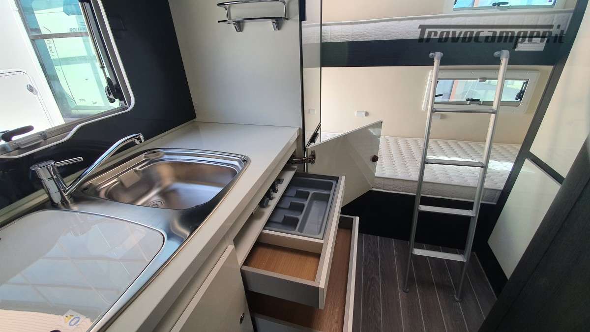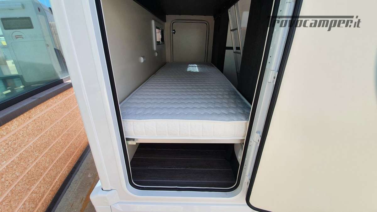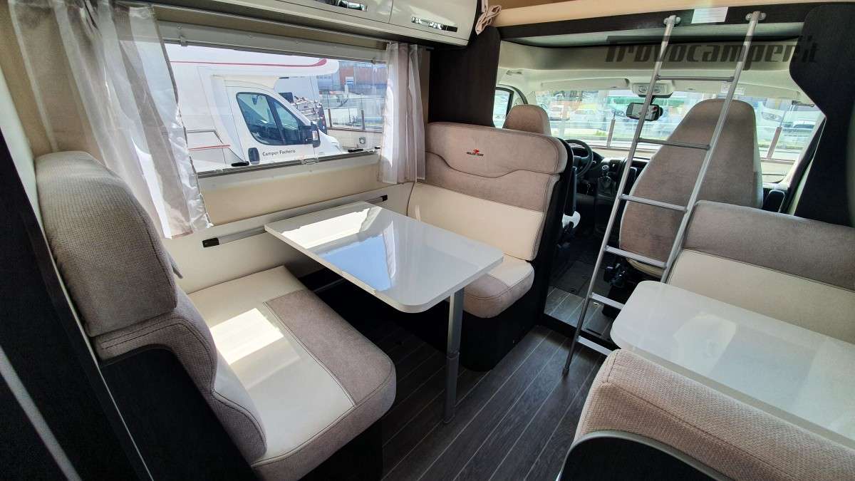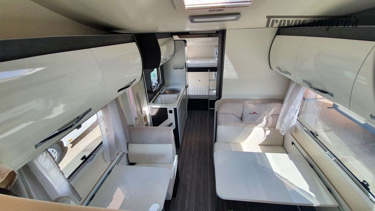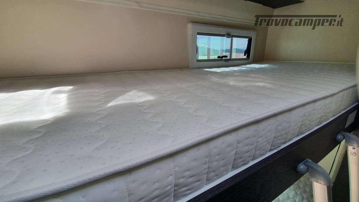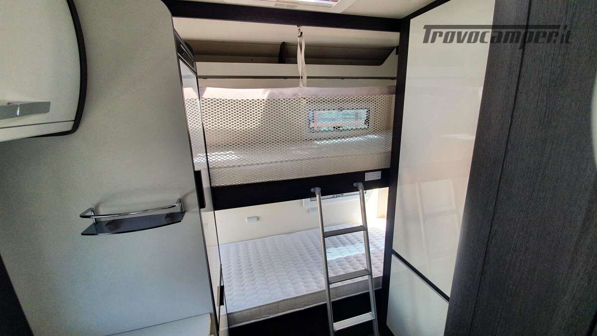 Configurazione letti per famiglie numerose: letto matrimoniale extrasize in mansarda (209×160cm), dinette matrimoniale (186×125cm), letto singolo dinette (163×65cm) e letti a castello posteriori (212×80cm). Sette posti omologati per la marcia e sette posti letto.