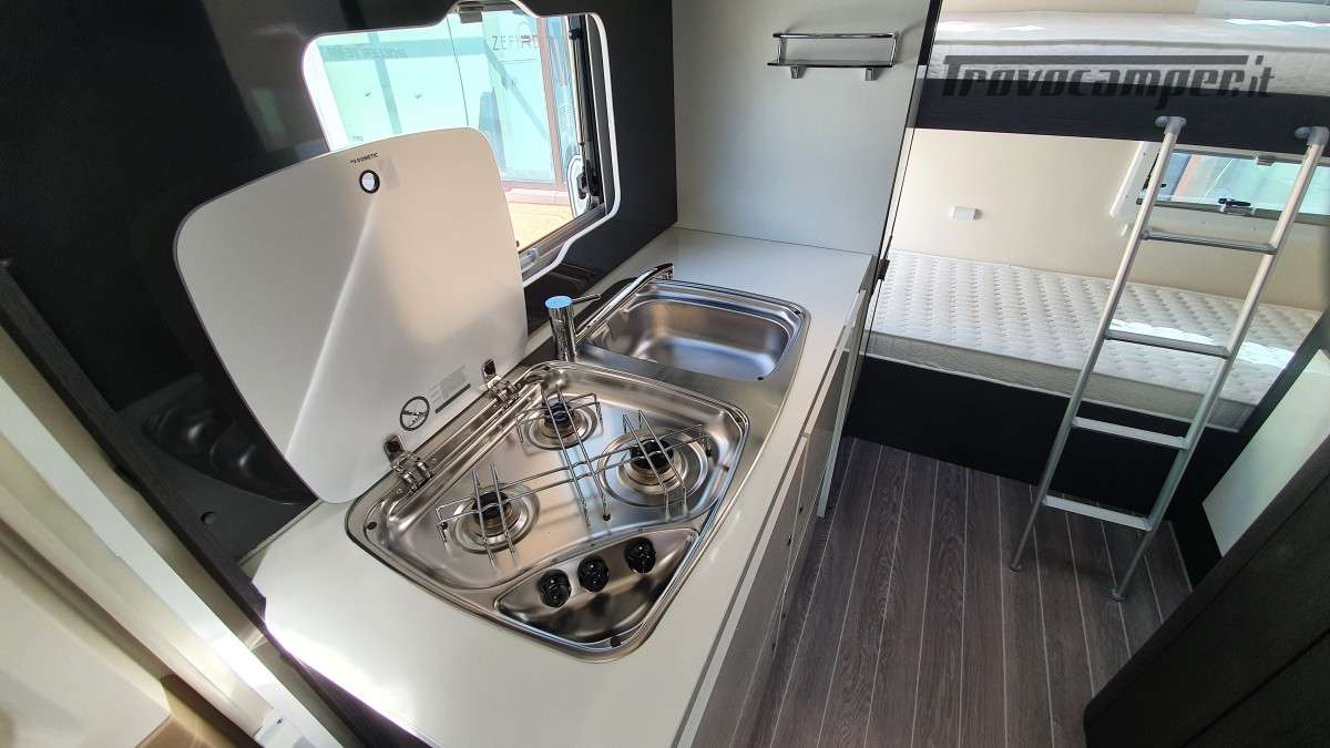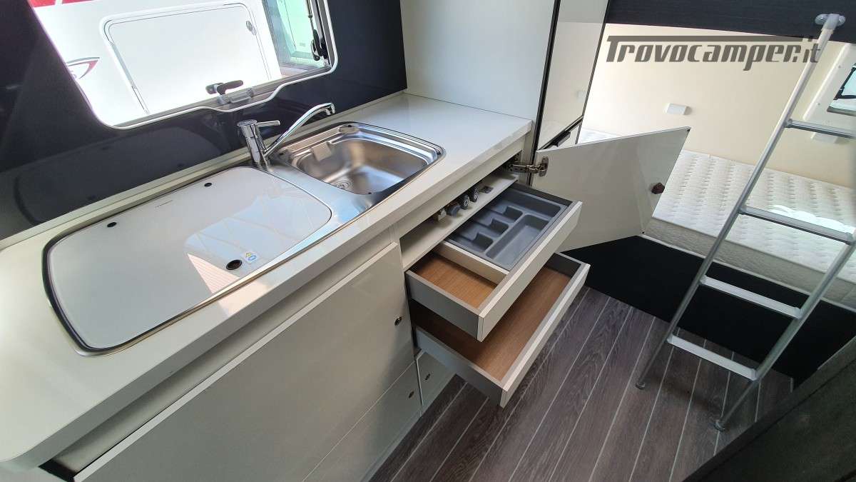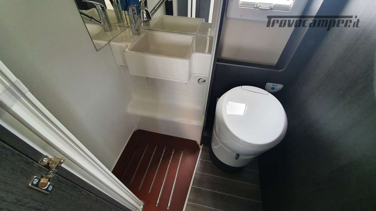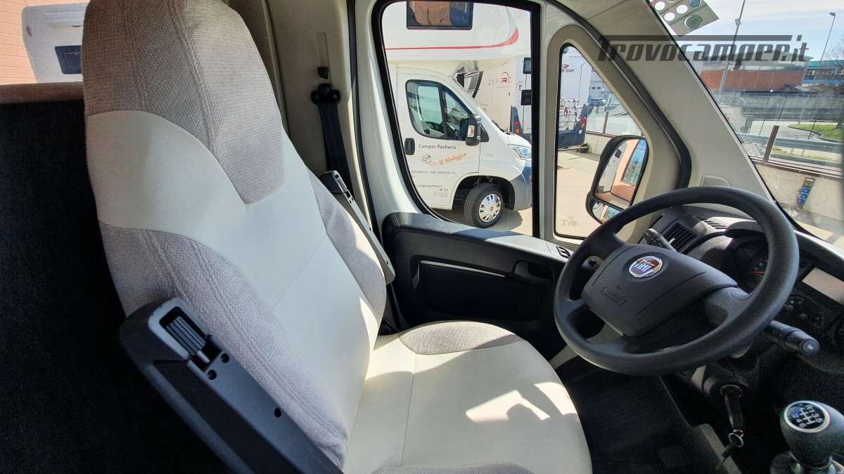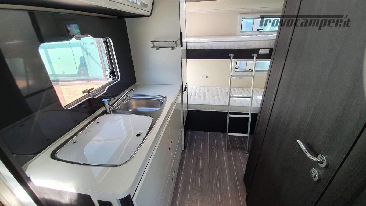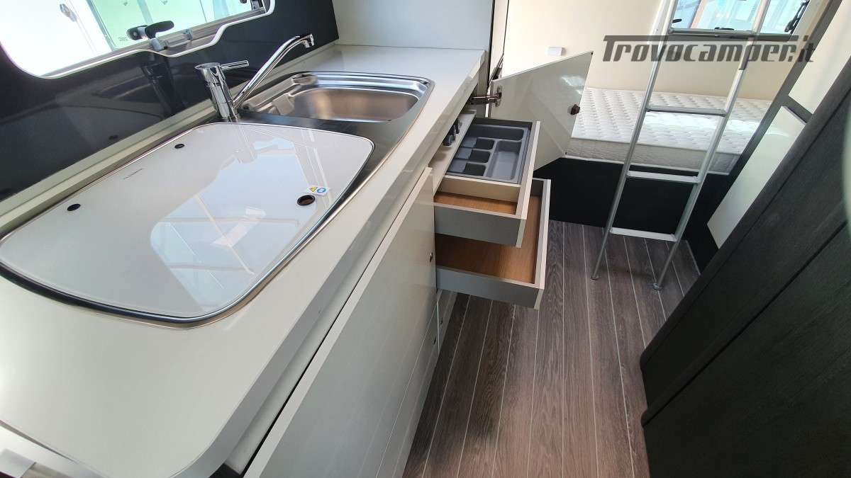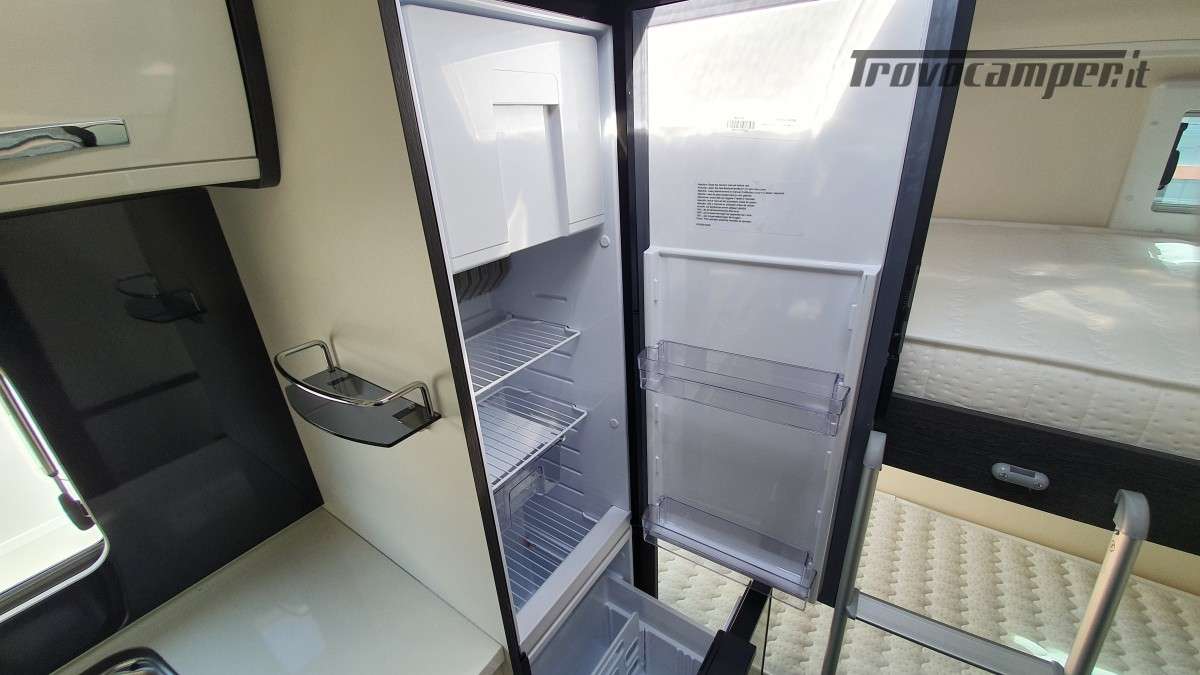 Configurazione letti per famiglie numerose: letto matrimoniale extrasize in mansarda (209×160cm), dinette matrimoniale (186×125cm), letto singolo dinette (163×65cm) e letti a castello posteriori (212×80cm). Sette posti omologati per la marcia e sette posti letto.
