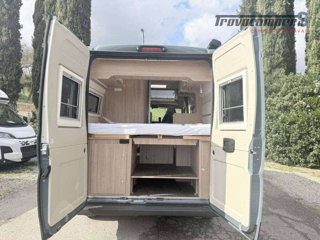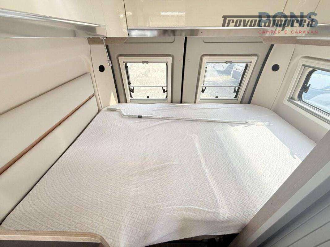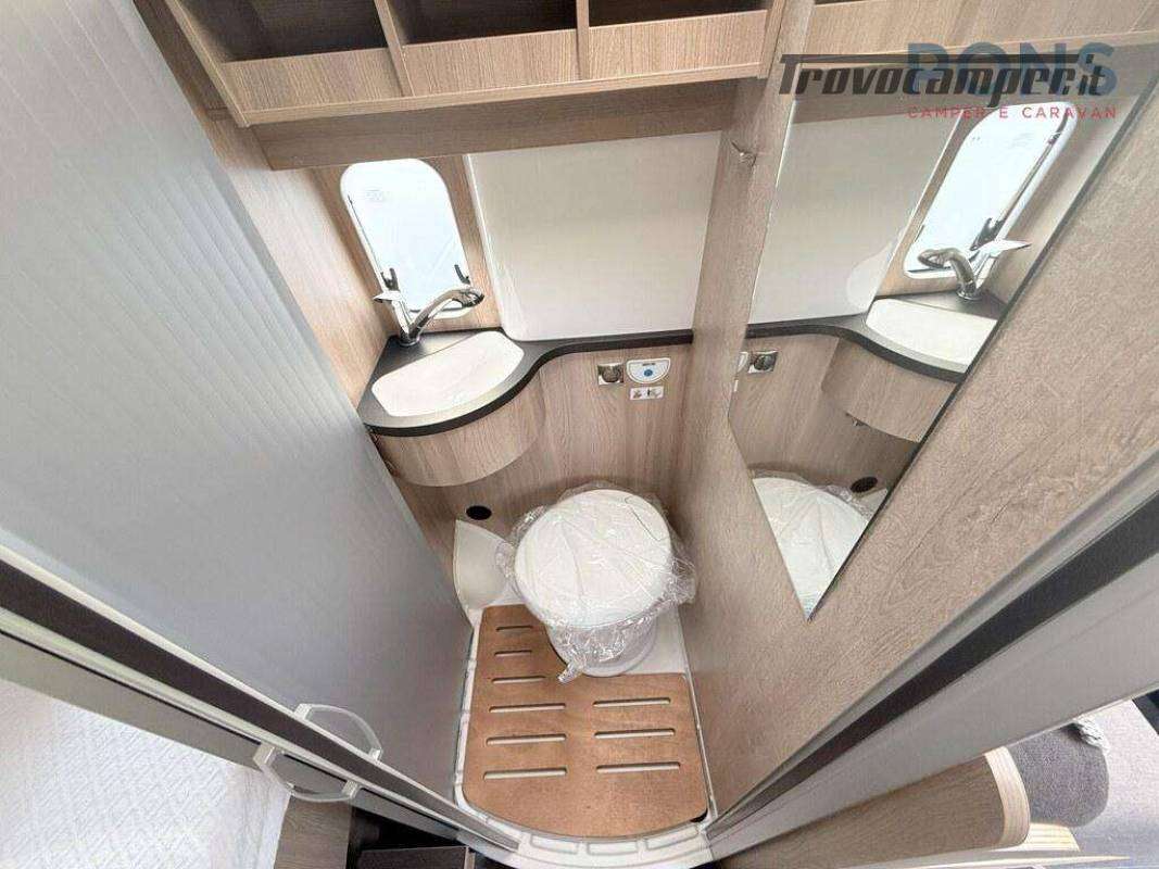 Nella parte posteriore è collocato il letto matrimoniale sotto al quale è possibile stivare bagagli o attrezzature varie, mentre ai suoi piedi troviamo il bagno composto da toilette e doccia, separabili con l?apposita tenda. Anche quest'ultimo molto luminoso grazie alla finestra presente.
