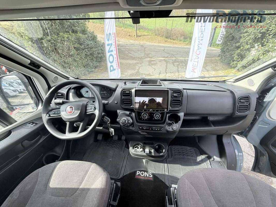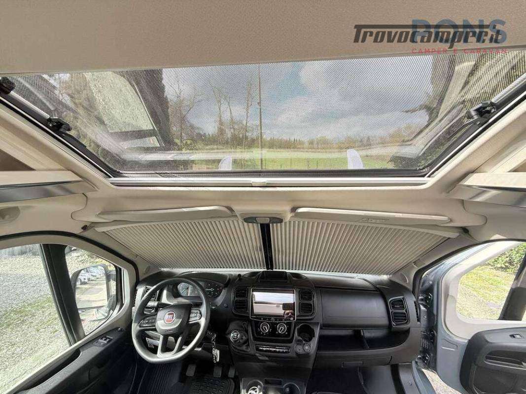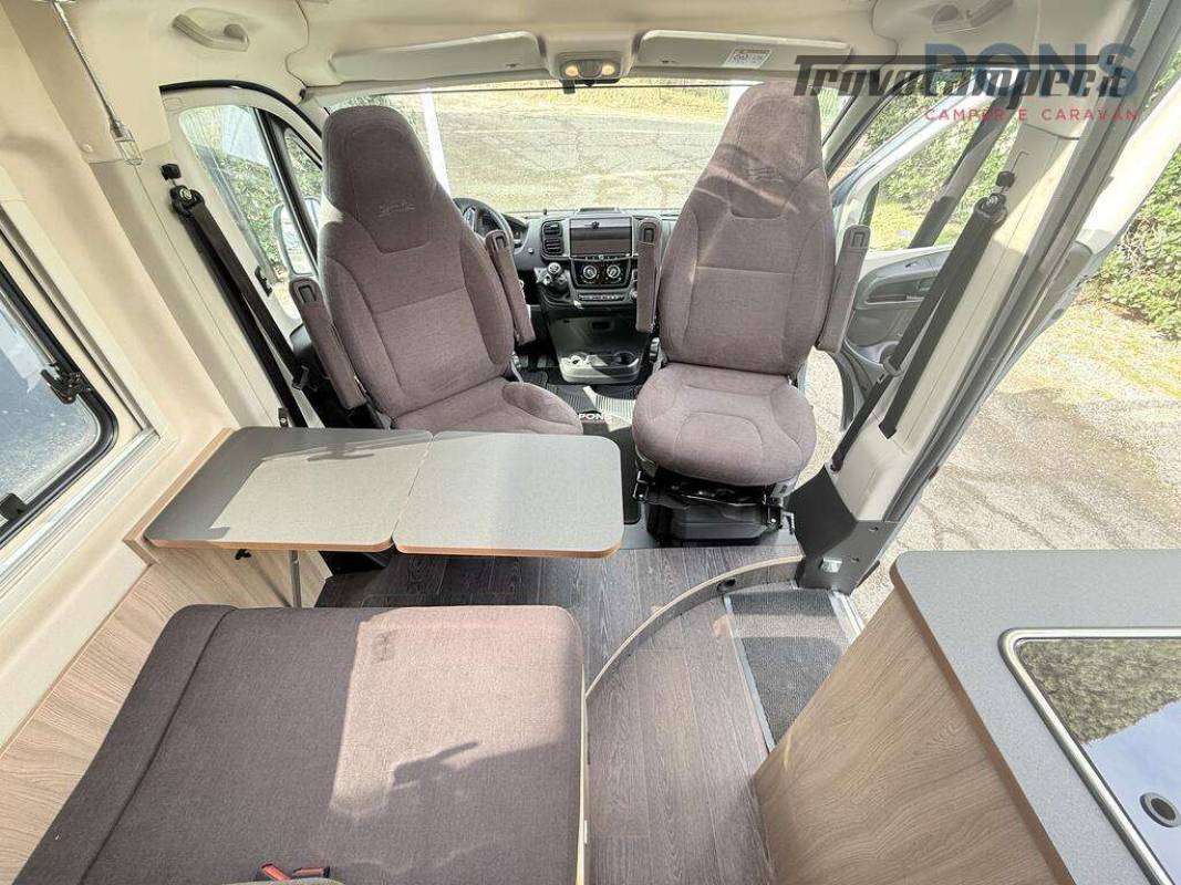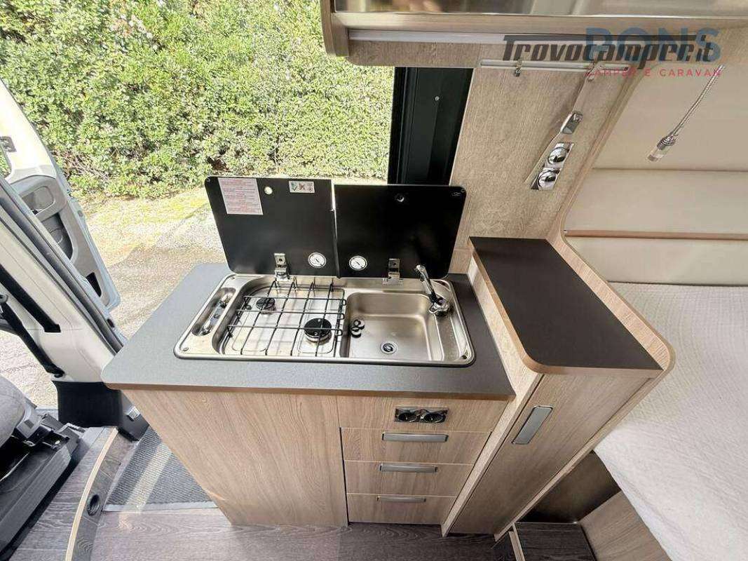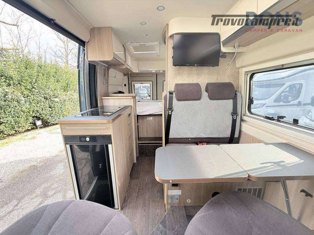 La pianta interna è composta da una luminosa dinette con sedili cabina girevoli e tavolo a scomparsa, cucina con piano cottura a due fuochi lavello e piano d'appoggio laterale; Non manca il frigorifero all'ingresso con relativo scomparto freezer.