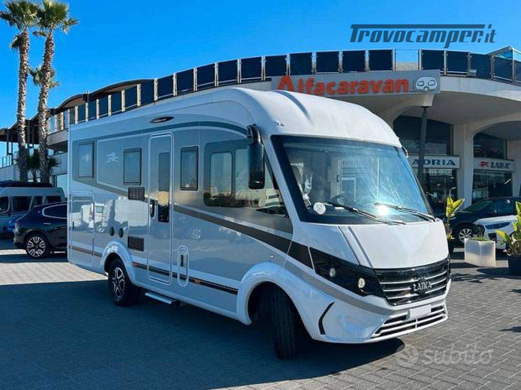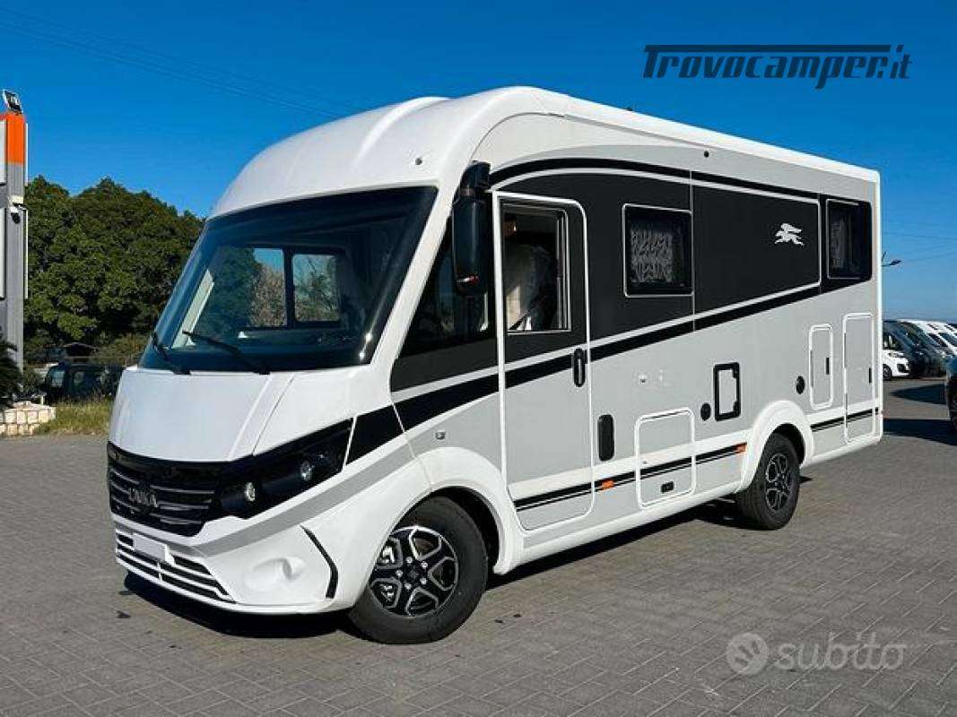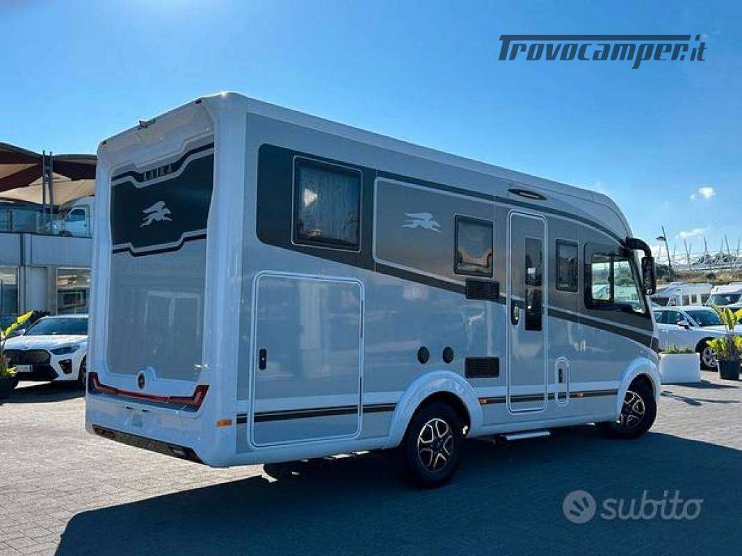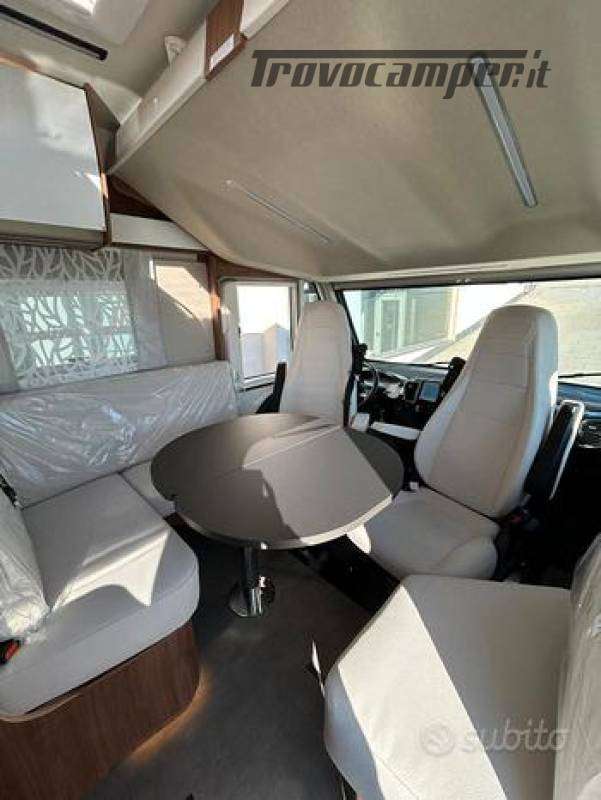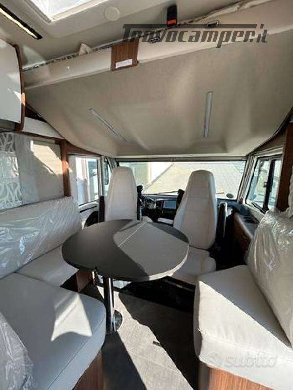Letto basculante completamente integrato nella linea dei pensili, completo di rete a doghe, materasso di alta qualità, tenda perimetrale di cortesia, luci di lettura orientabili, prese USB, oblò a tetto, vano di stivaggio dedicato, riscaldamento, tenda di separazione interna e impianto di illuminazione plurivie