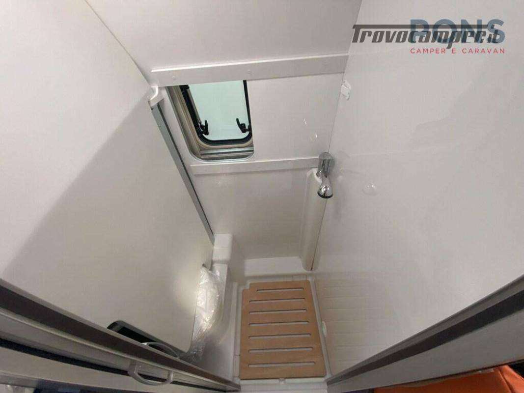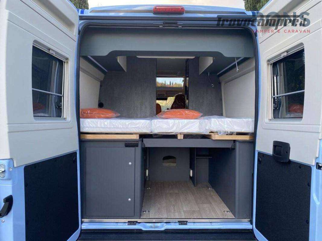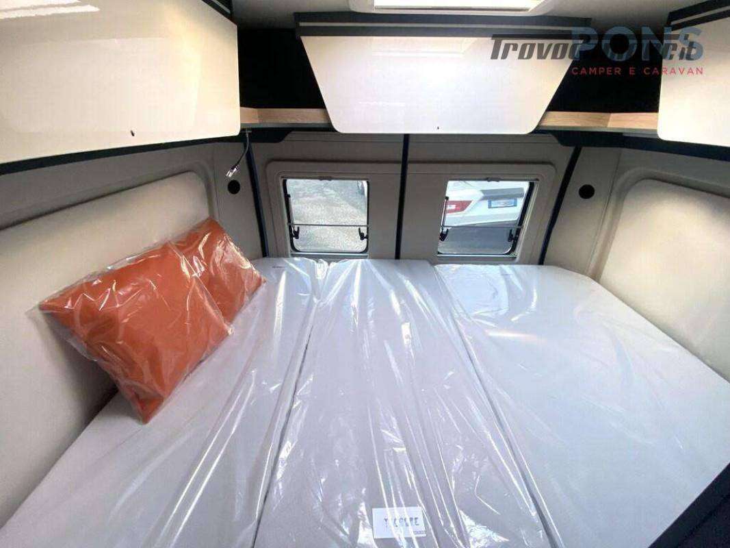 Nella parte posteriore un letto matrimoniale trasversale con pensili a giro sui 3 lati; Nella parte sottostante il vano per riporre due bombole del gas e non manca lo spazio per lo stivaggio del materiale.