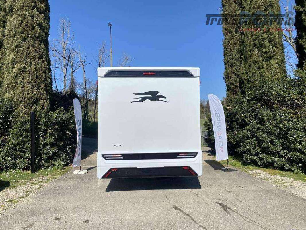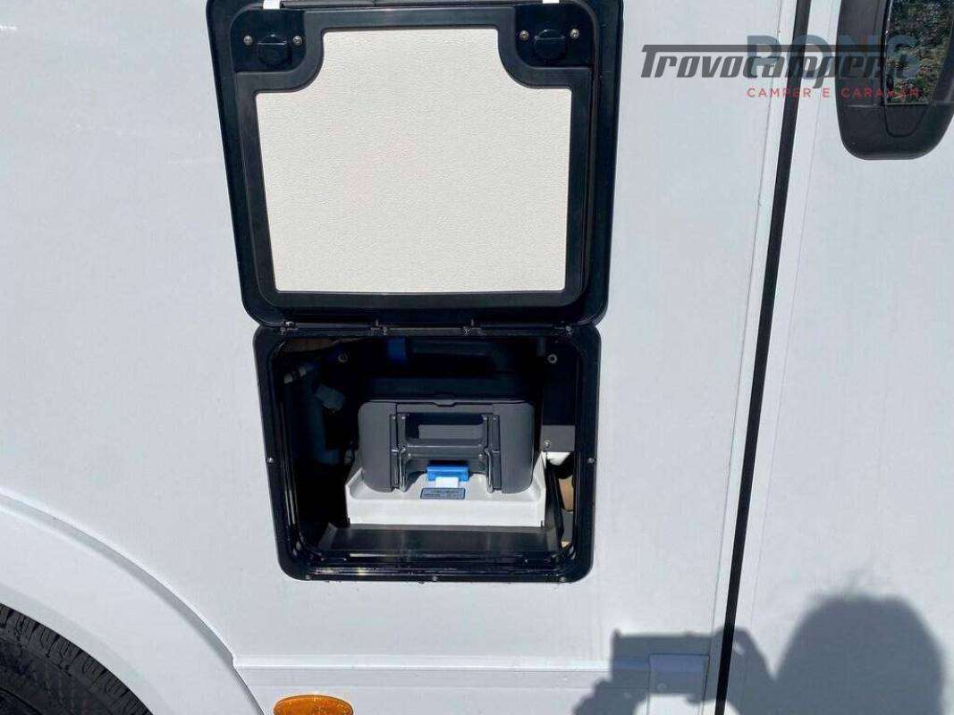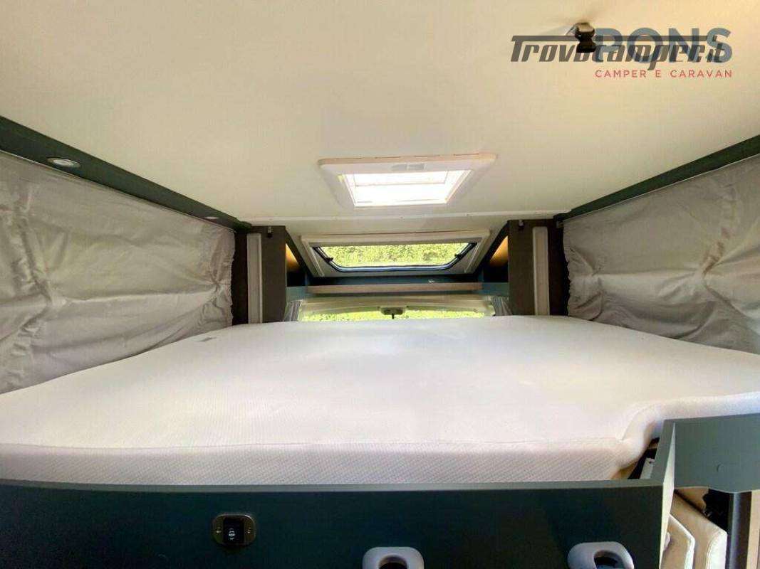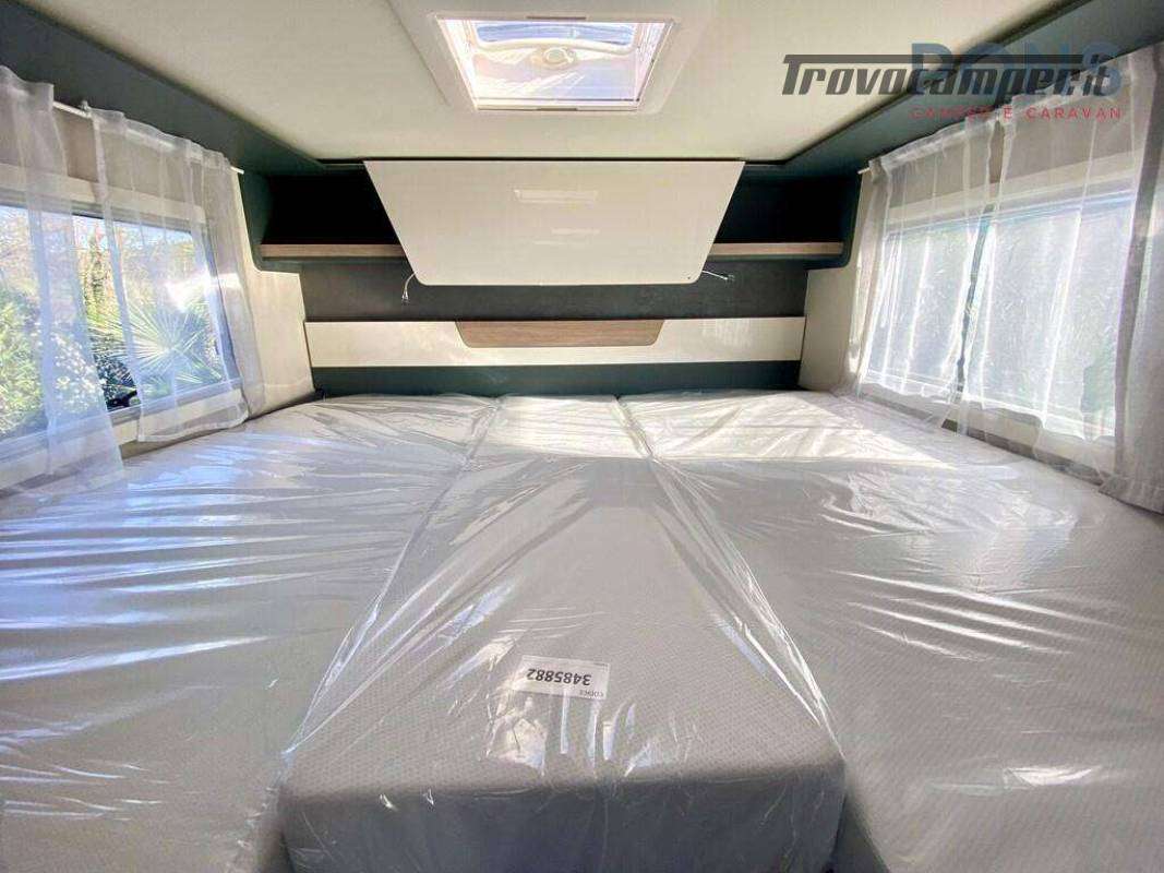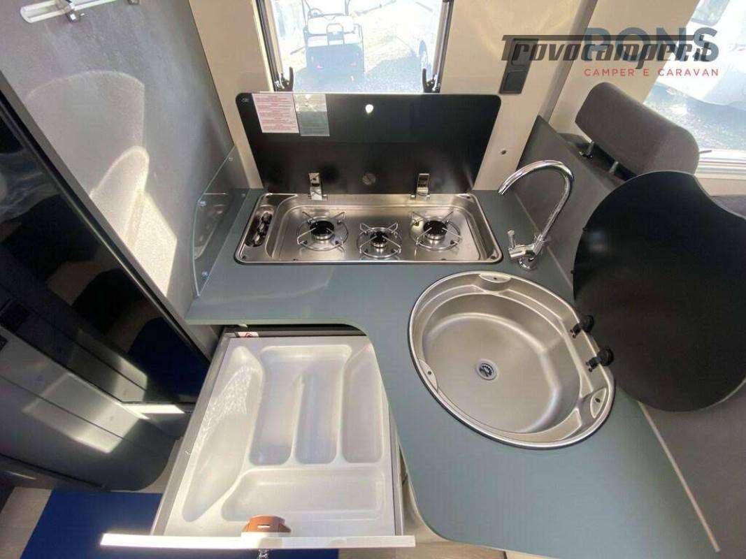 Piano cottura a 3 fuochi, lavello in acciaio inox e frigorifero con selezione automatica della fonte di energia; bagno con doccia separata; e nella parte posteriore letti gemelli con possibilità di trasformazione in matrimoniale con scaletta e, al di sotto, un guardaroba con binario estraibile; altri due posti letto ricavabili dal letto basculante elettrico sopra il soggiorno.