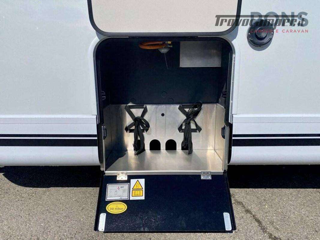 Nella parte esterna l?apposito vano per le bombole del gas e un ampio garage con piano ribassato, rivestimento antiscivolo, illuminazione, riscaldamento e binari con ganci fermacarico riposizionabili.
