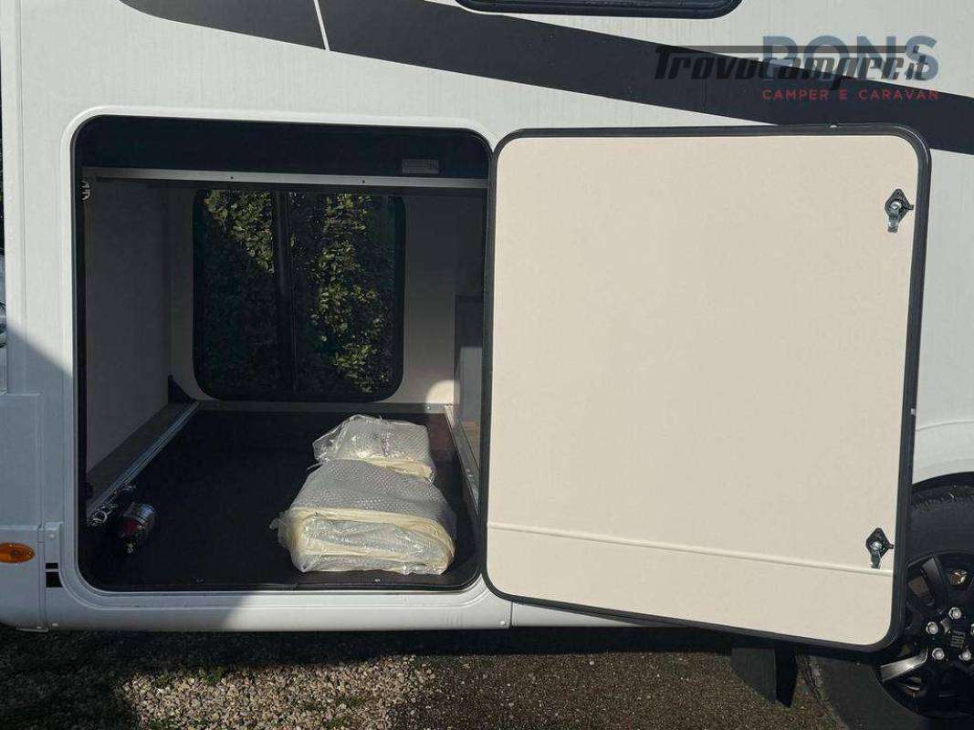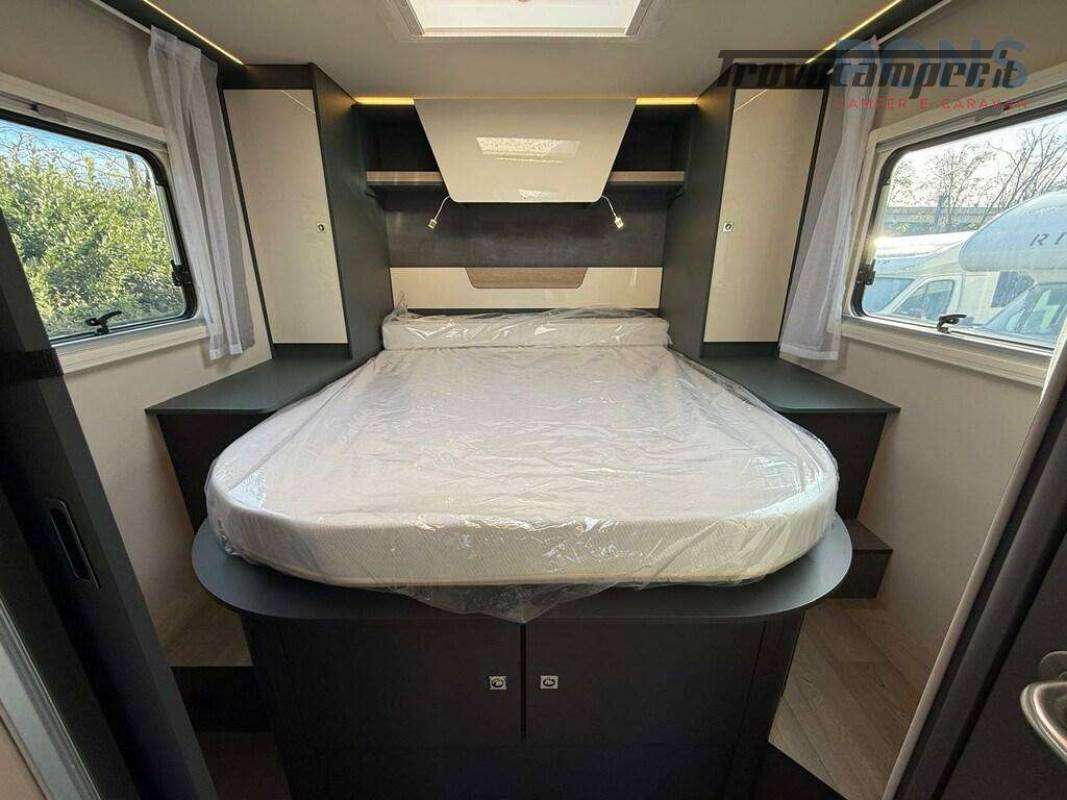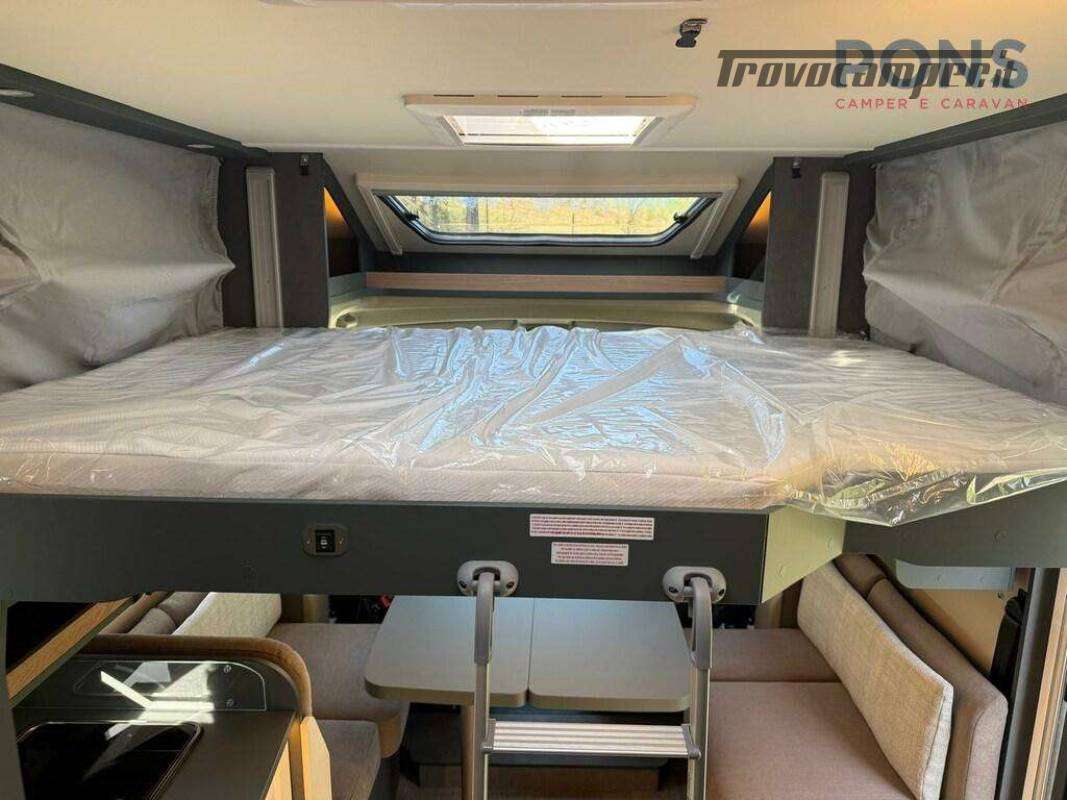 In coda troviamo una vera camera matrimoniale con letto centrale, armadi e pensili, mentre il letto basculante elettrico sopra la dinette offre altri due posti letto pronti in pochi secondi.