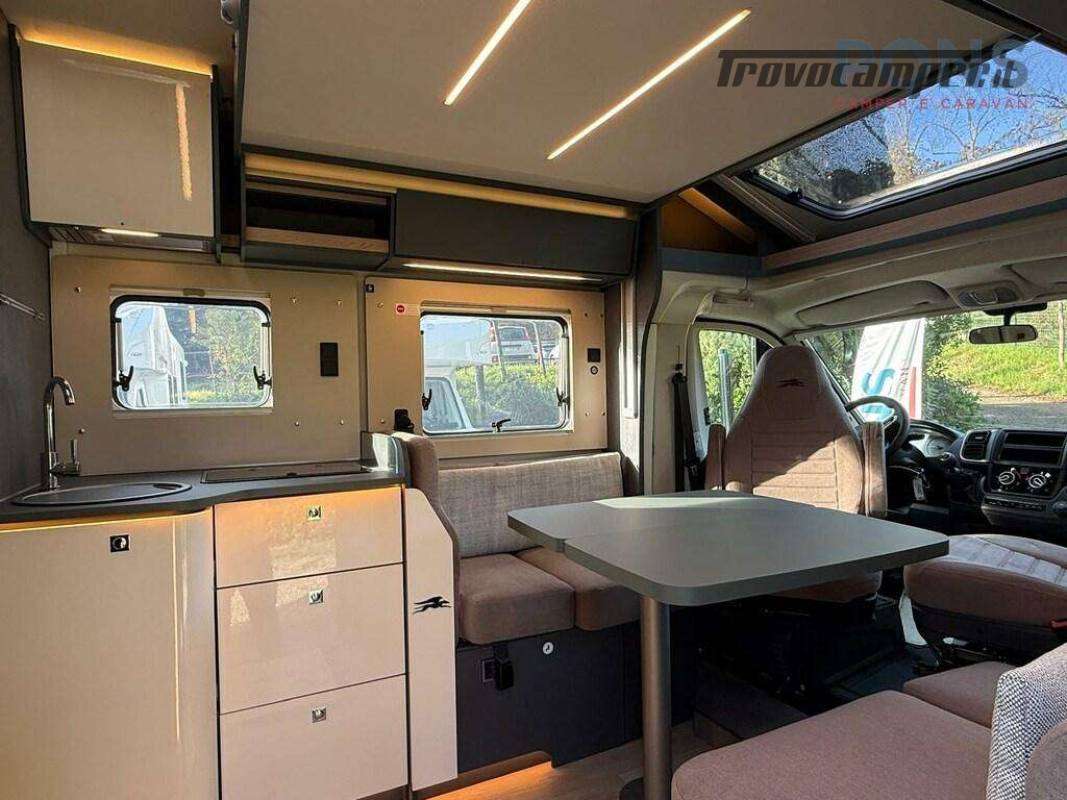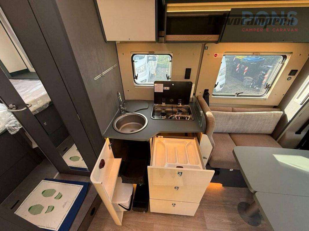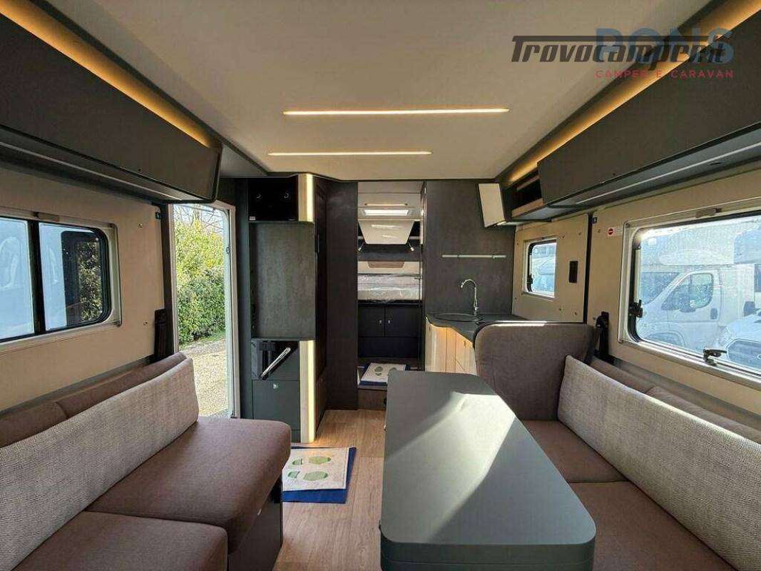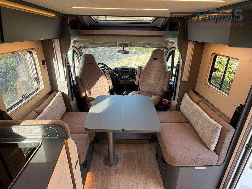 All?ingresso ci si affaccia su un ampio soggiorno con doppia seduta contrapposta e tavolo centrale regolabile e ribaltabile: un vero salotto, luminosissimo grazie al grande skyroof e alle finestre laterali e a una completa illuminazione full Led.