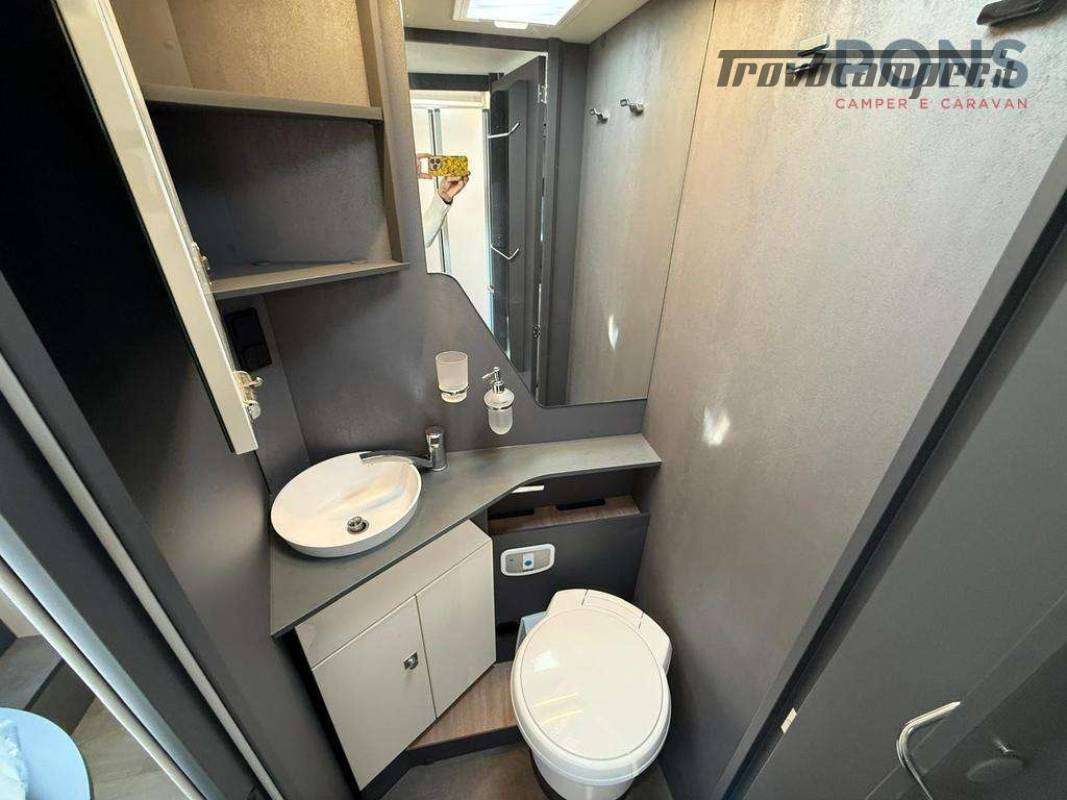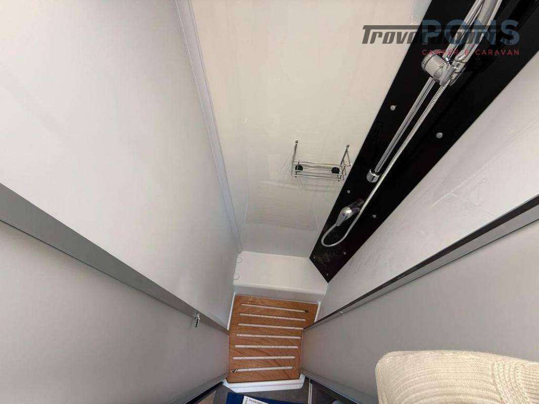 Il blocco toilette è elegante e pratico, con wc, lavabo e numerosi vani portaoggetti; di fronte la doccia indipendente con colonna e pedana in legno garantisce il comfort di casa anche in viaggio.