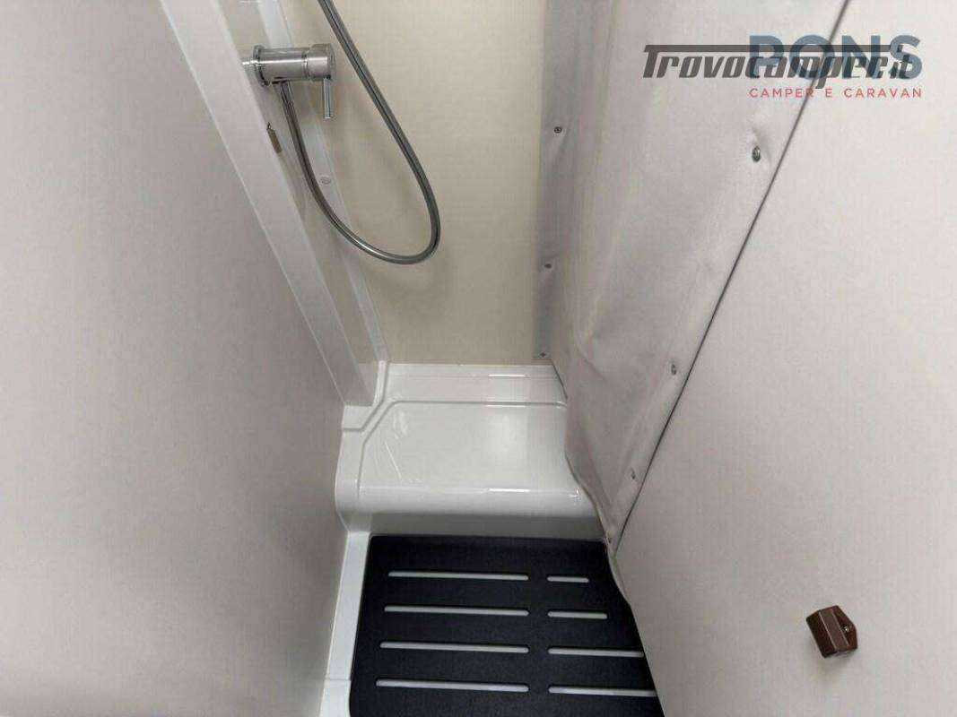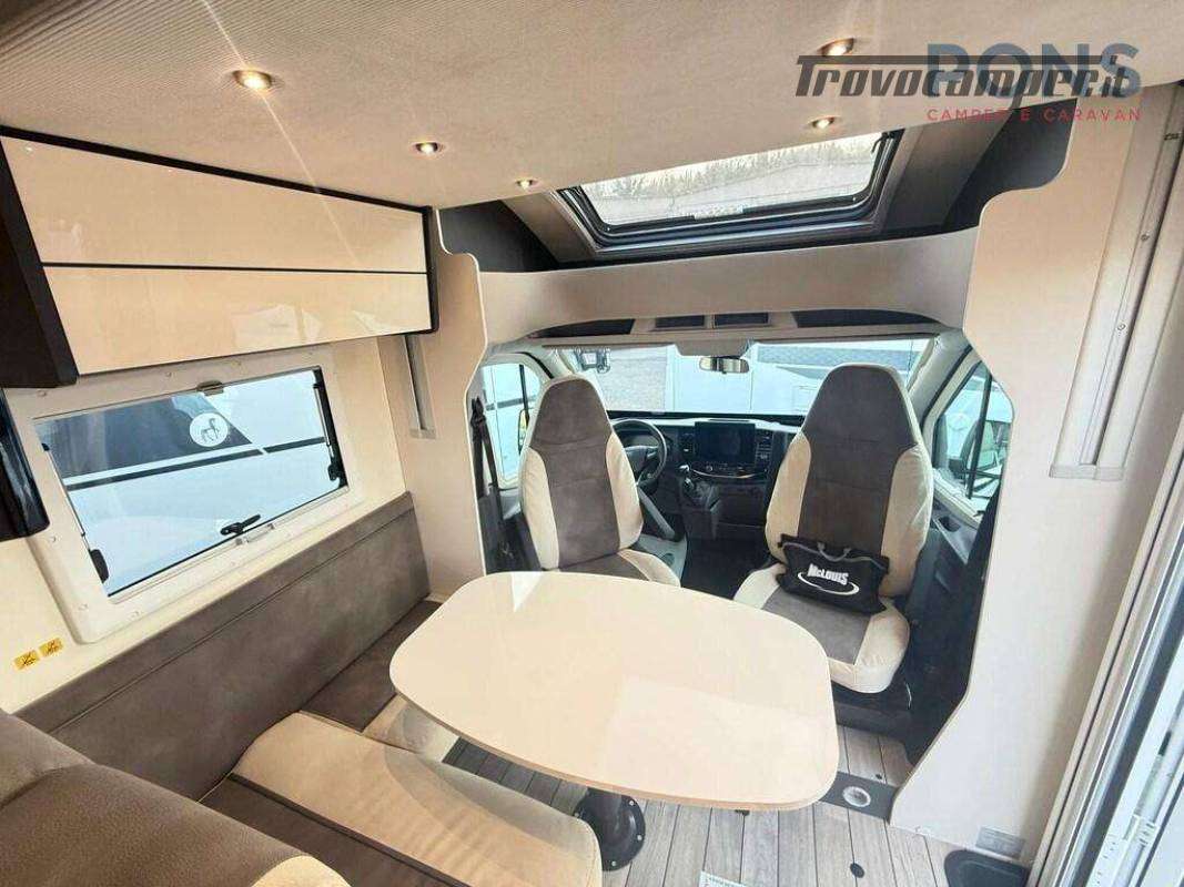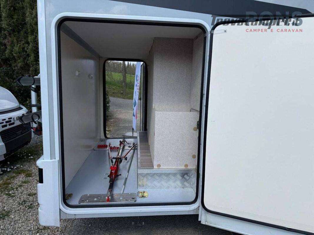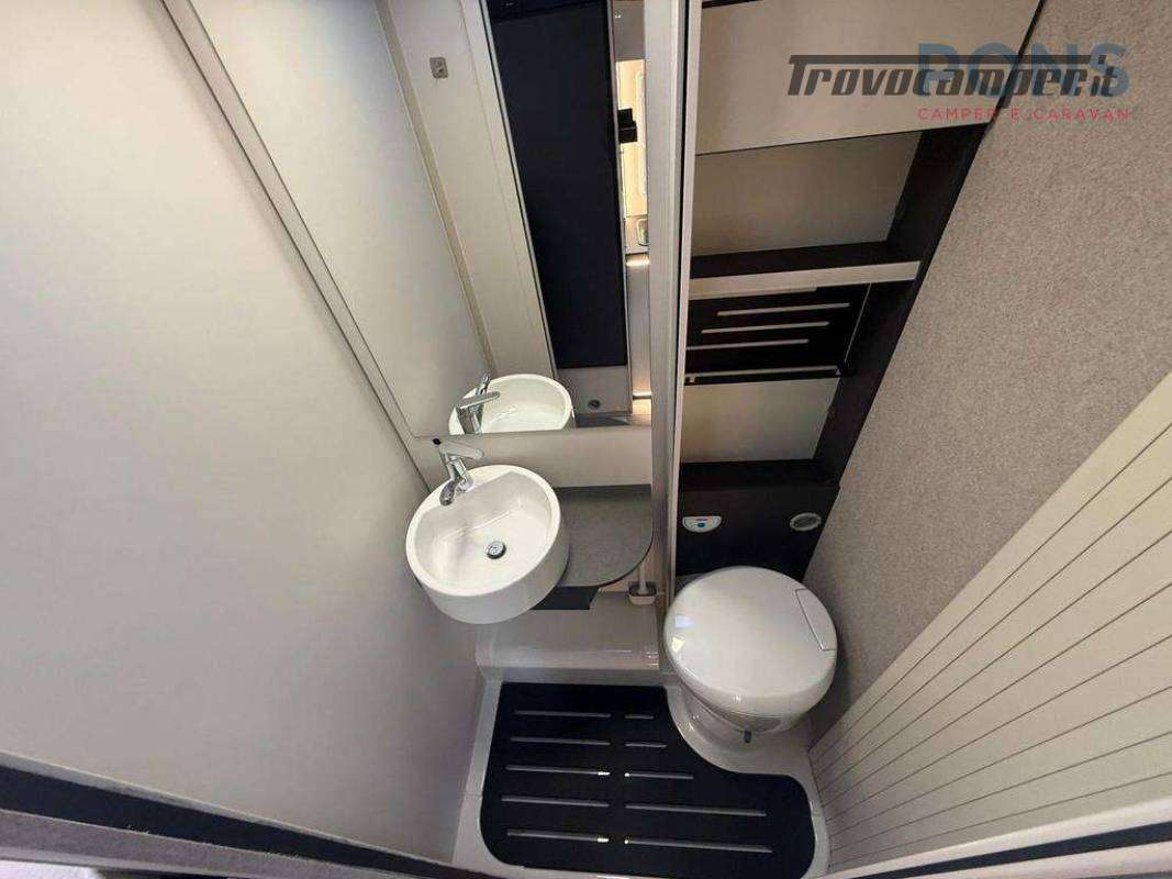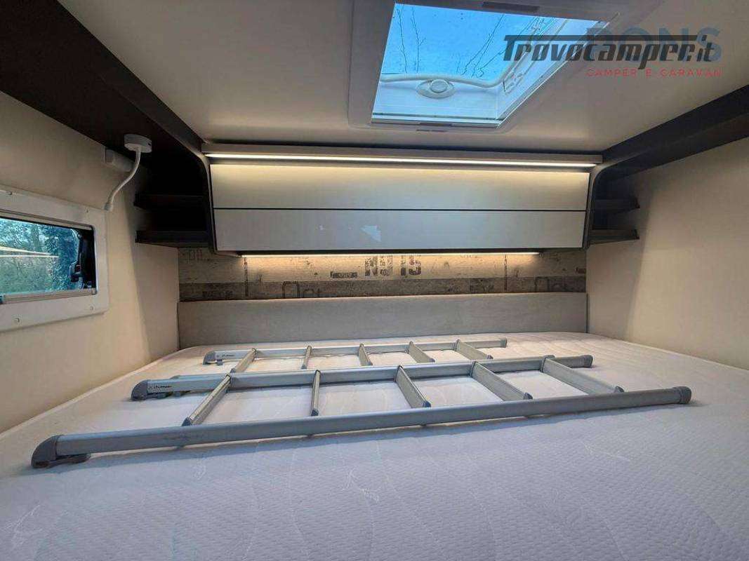 In coda è collocato il letto matrimoniale trasversale mentre sopra alla dinette troviamo il secondo letto, basculante elettrico.