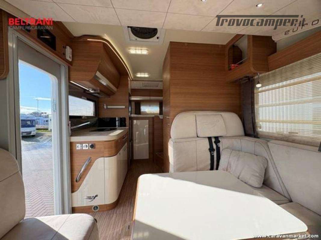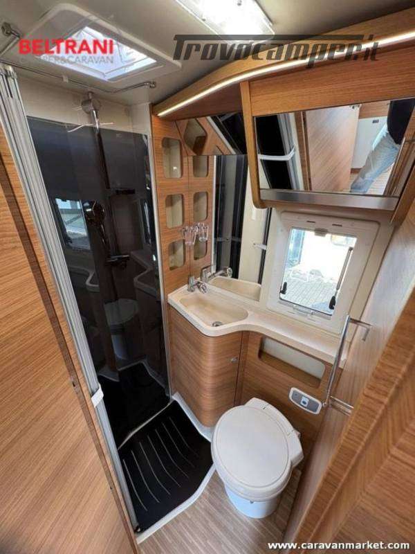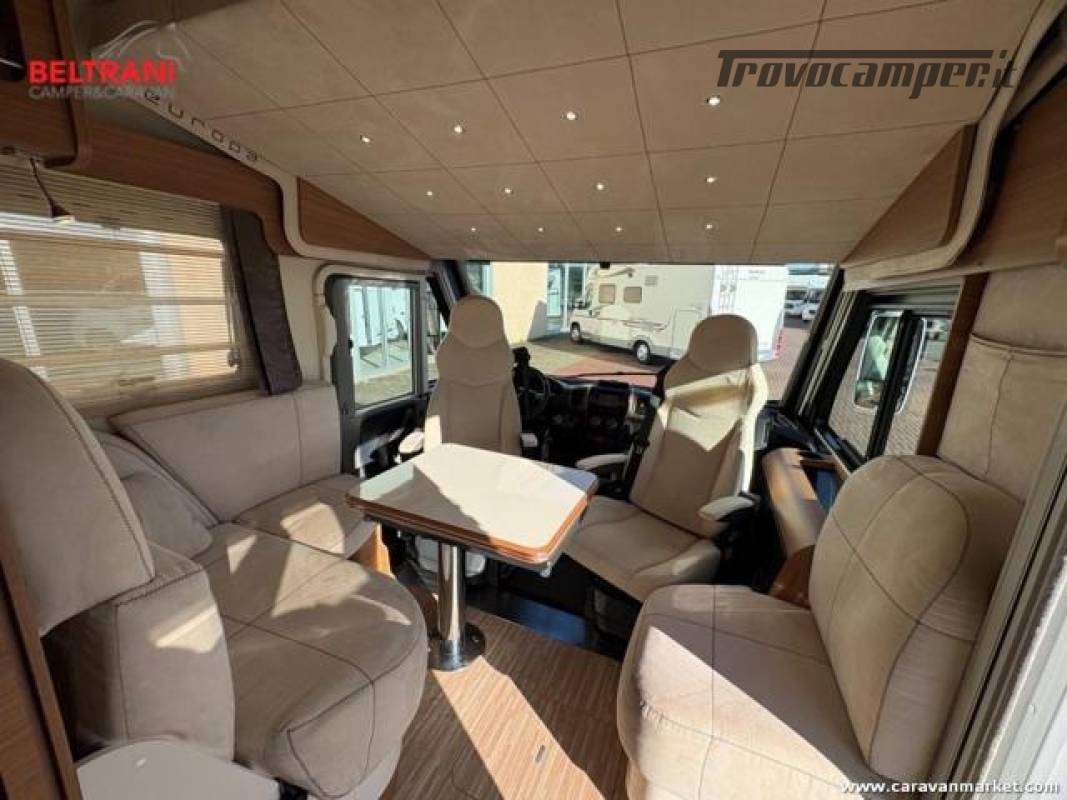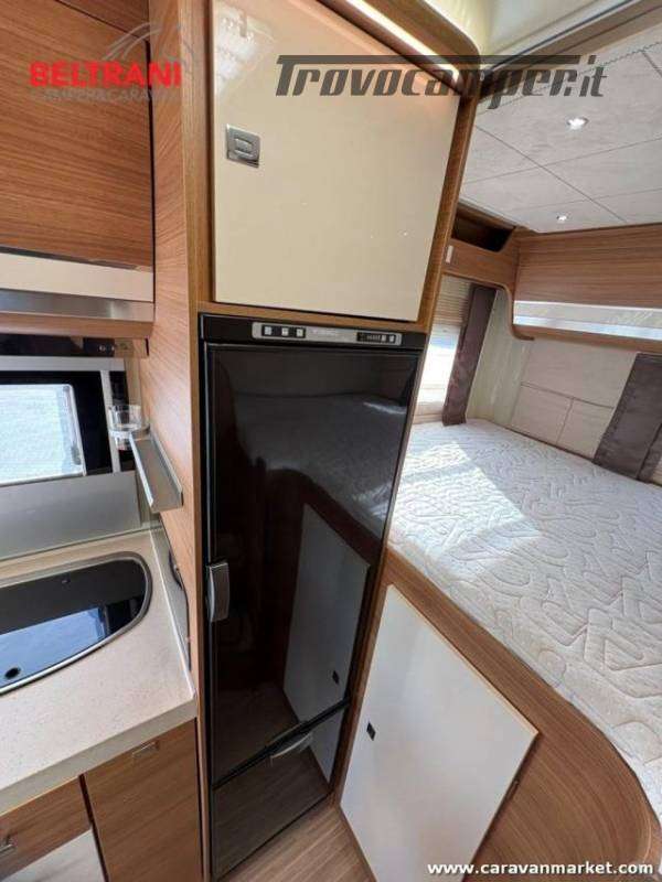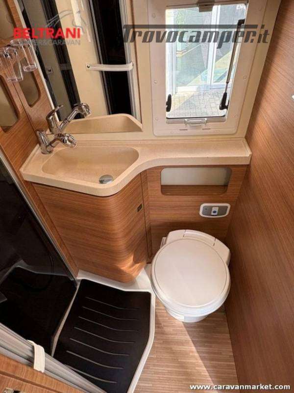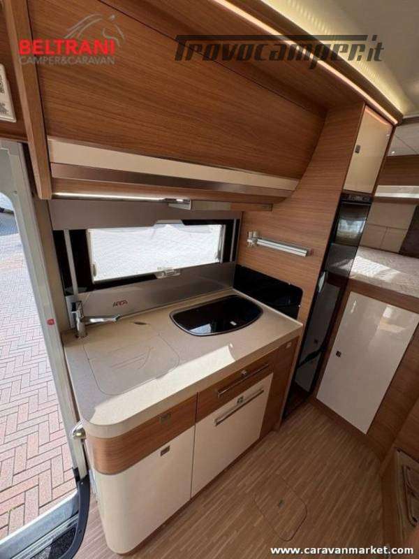 telaio rinforzato AL-KO, offre 4 posti letto grazie al letto matrimoniale trasversale posteriore king size e al letto basculante sopra la zona living.È dotato di doppio pavimento termoisolato E garage laterale capientea.