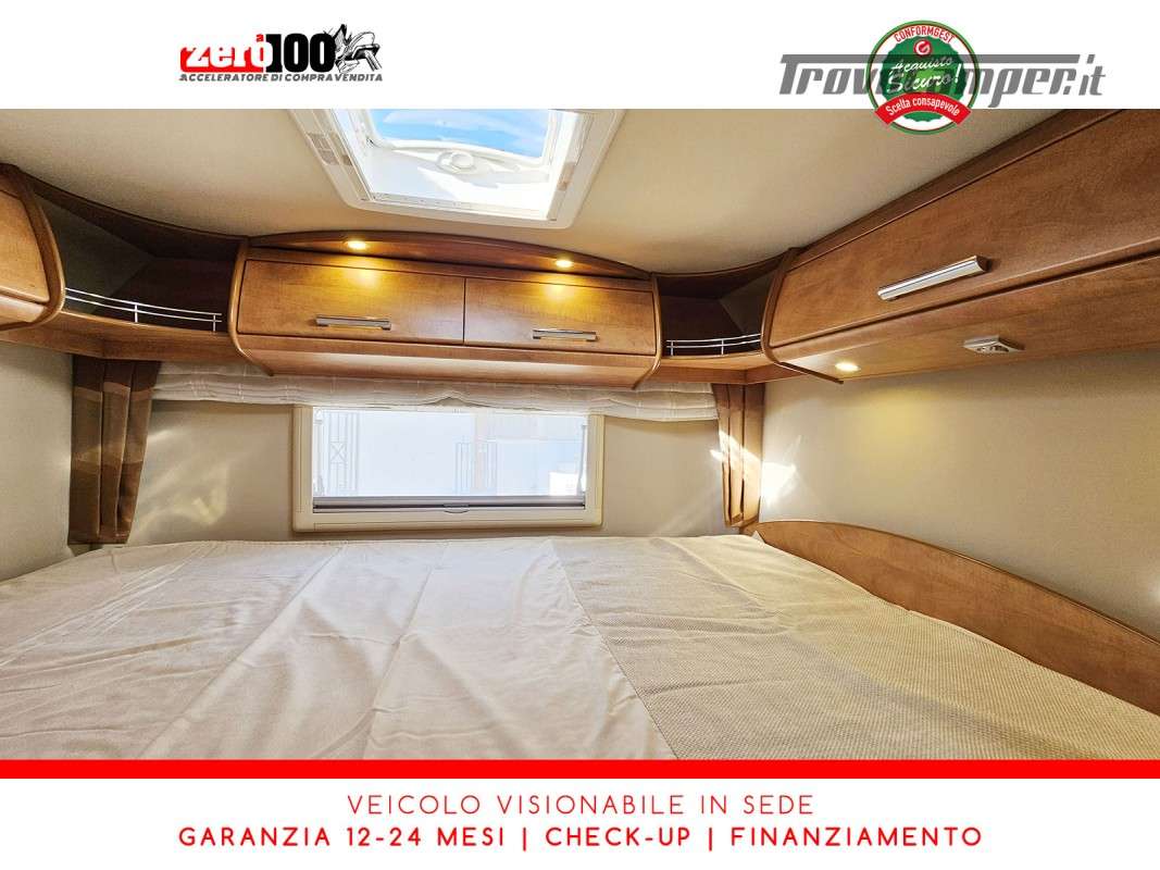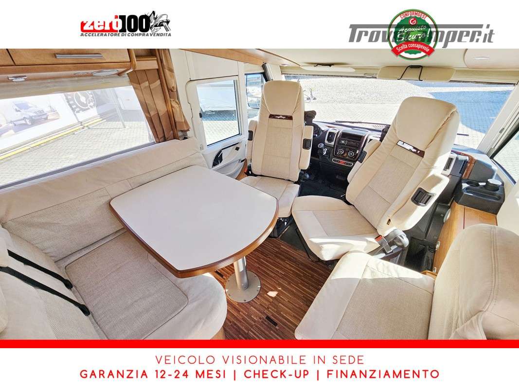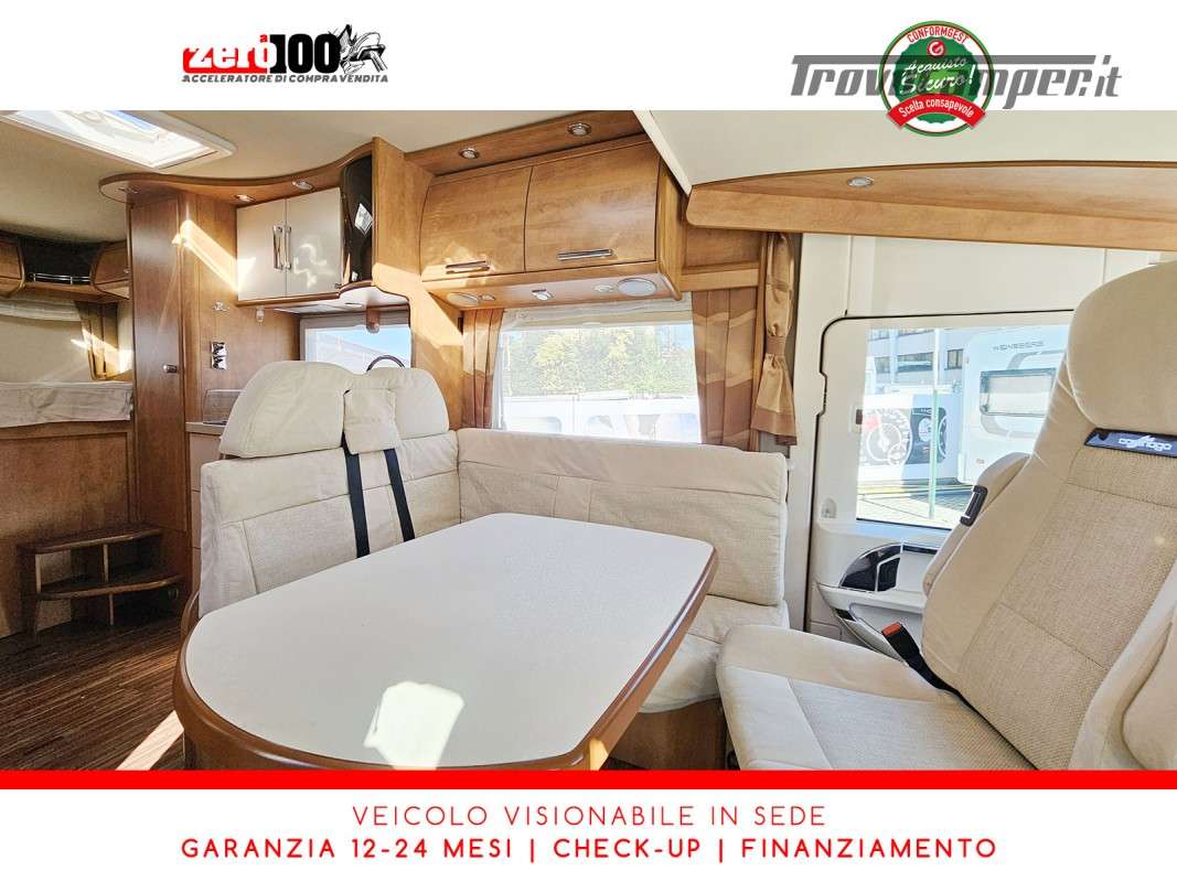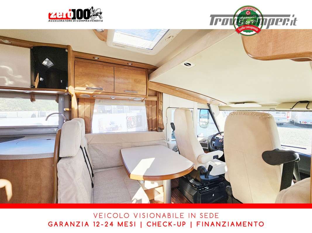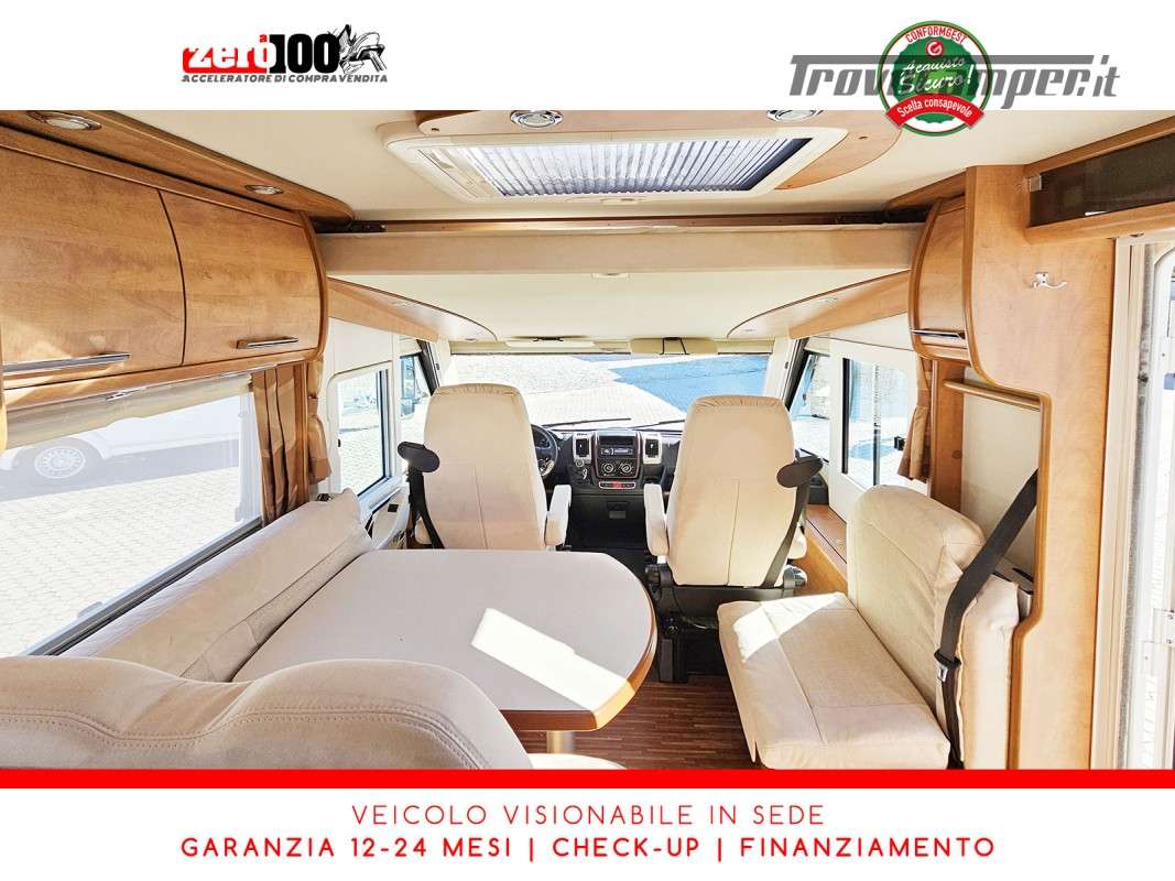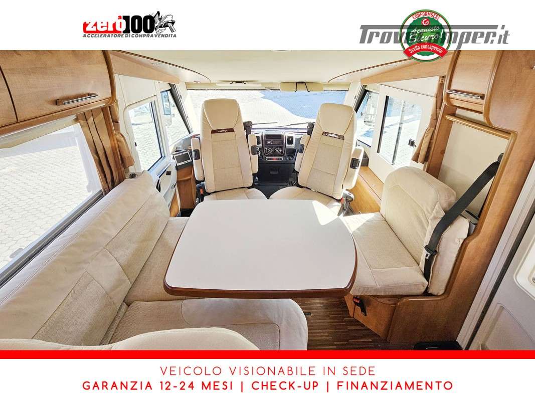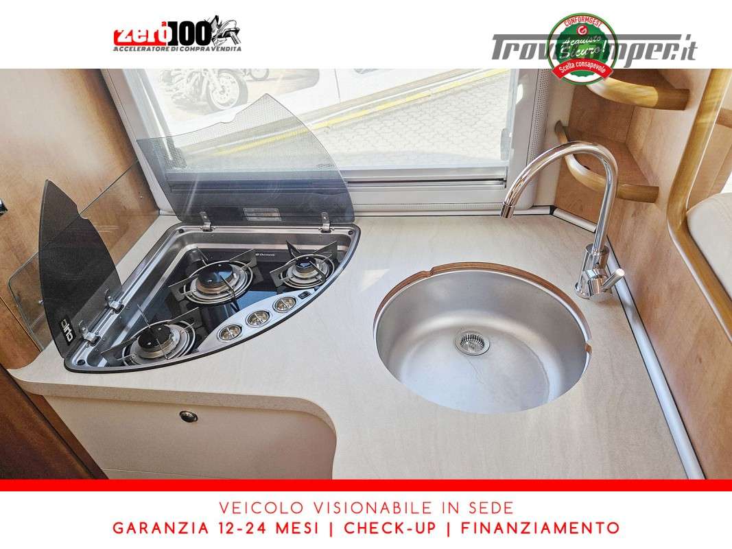 Dinette a L con panca laterale e sedili cabina girevoli - Cucina a L 3 fuochi con piezo, cappa aspirante e Frigorifero trivalente 160 lt automatico contrapposto - Letto matrimoniale trasversale in coda con botola di accesso al garage - Letto matrimoniale basculante anteriore - Bagno con box doccia - Ampio garage