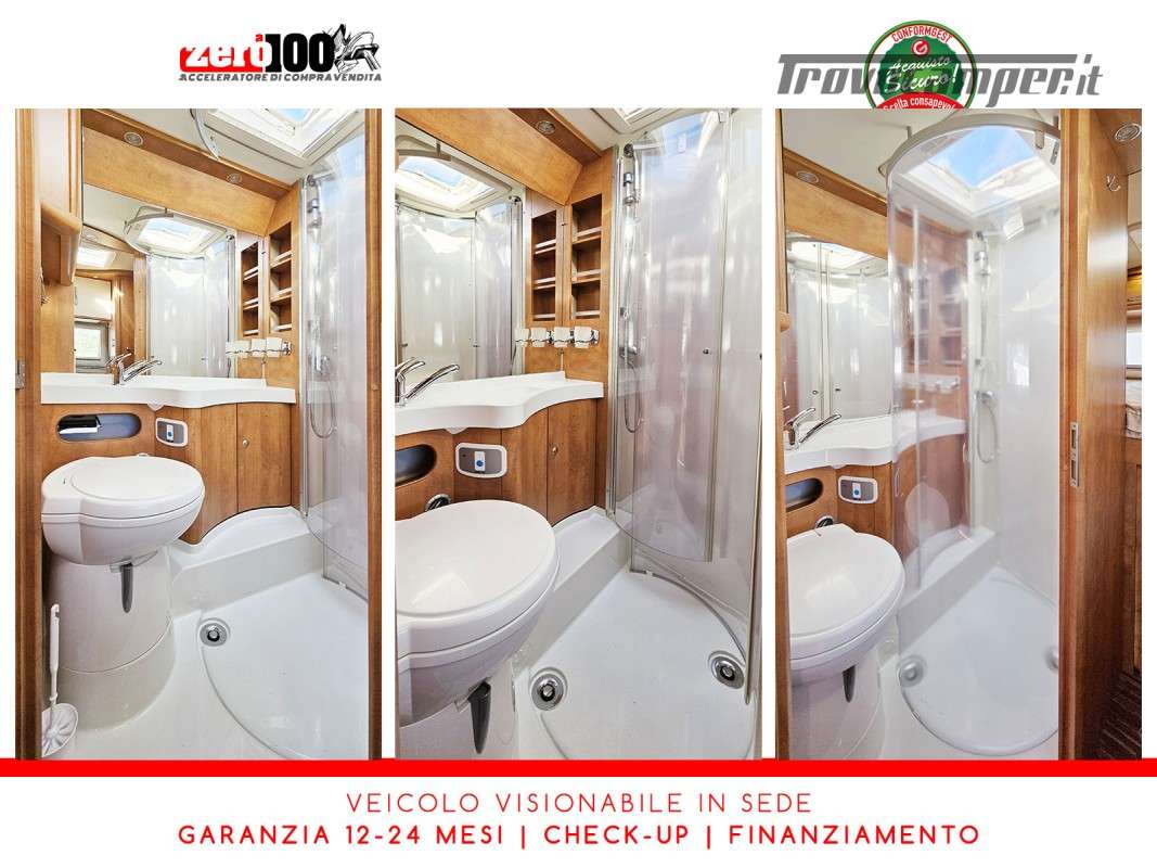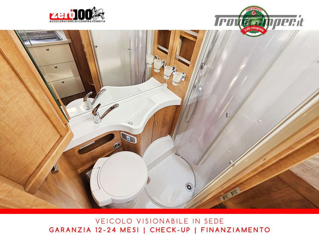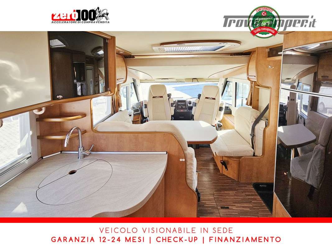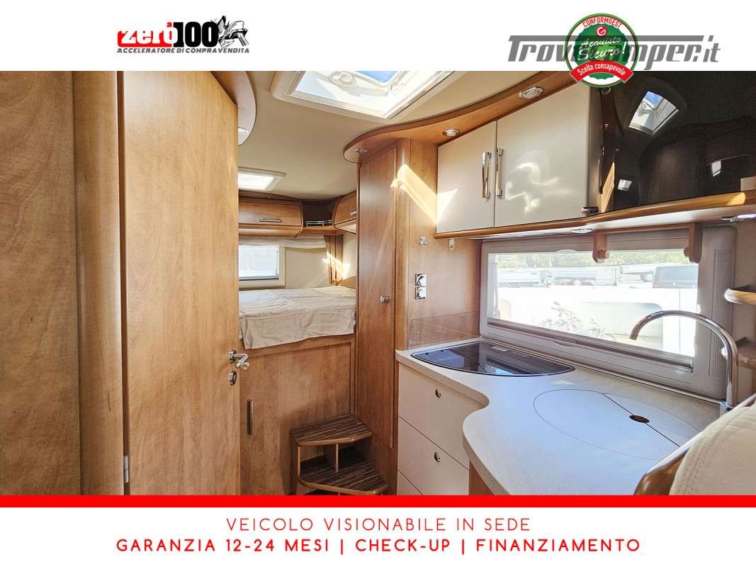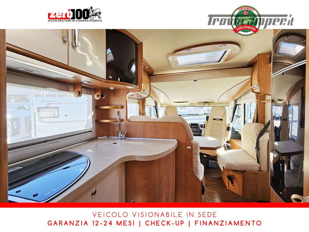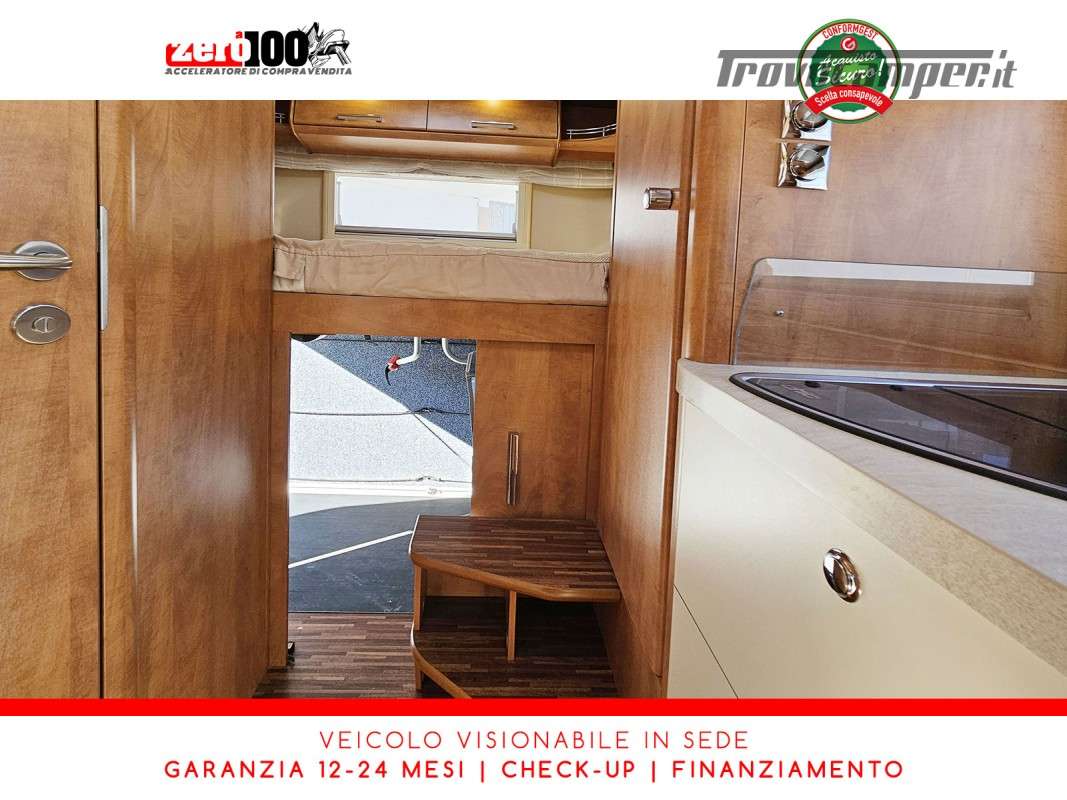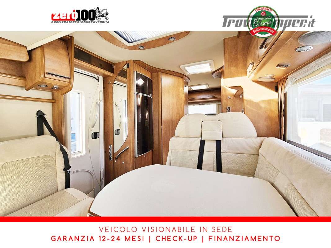 Dinette a L con panca laterale e sedili cabina girevoli - Cucina a L 3 fuochi con piezo, cappa aspirante e Frigorifero trivalente 160 lt automatico contrapposto - Letto matrimoniale trasversale in coda con botola di accesso al garage - Letto matrimoniale basculante anteriore - Bagno con box doccia - Ampio garage