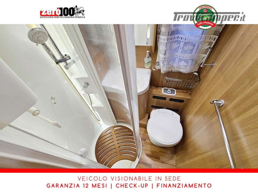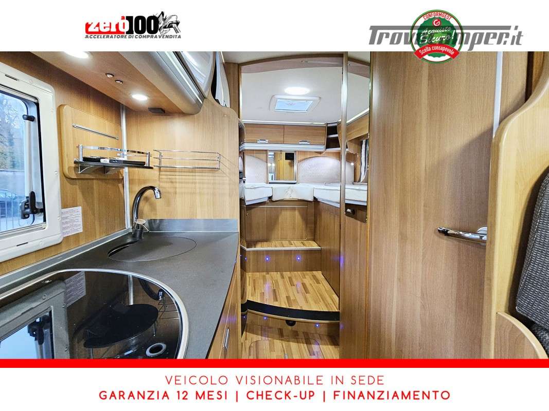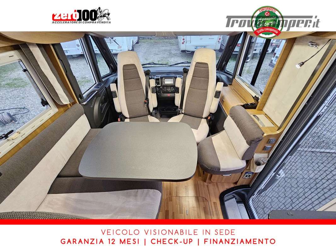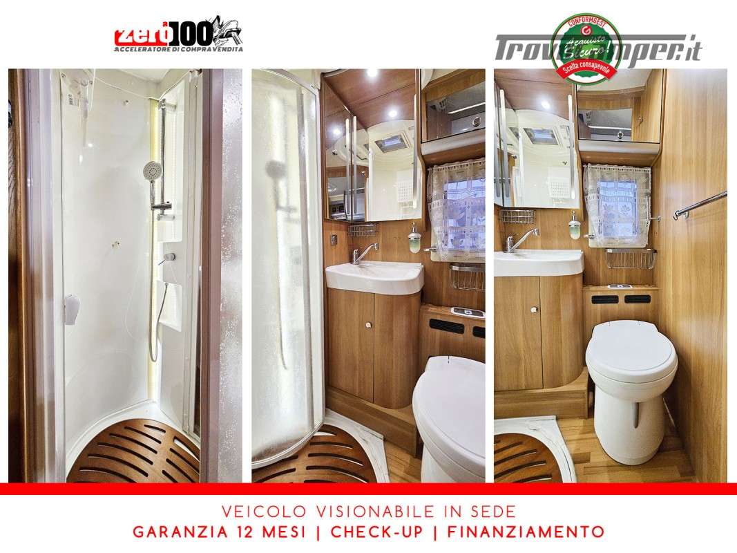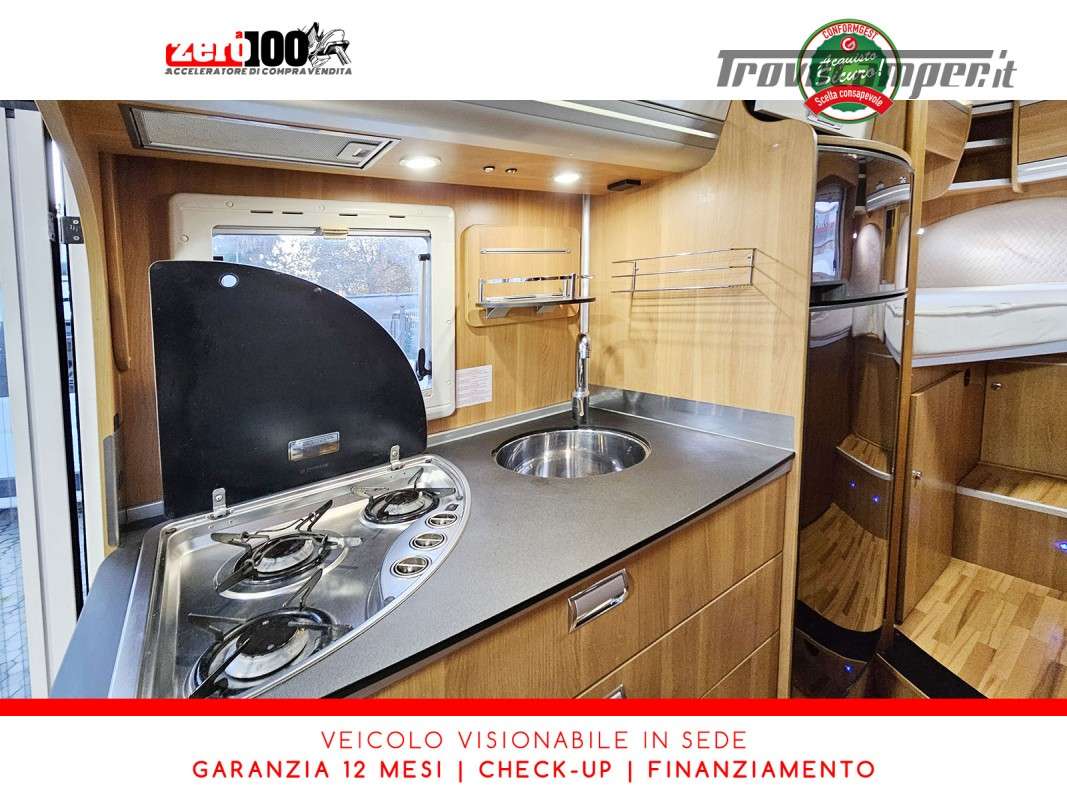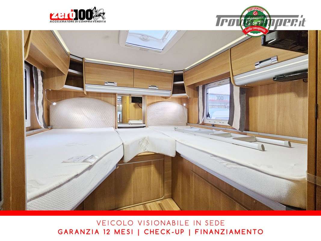 Letti gemelli in coda – Letto basculante anteriore – Dinette a L con sedili cabina girevoli – Cucina a L 3 fuochi con piezo, Frigorifero trivalente grande con cella freezer separata – Toilette con lavandino, wc e finestra – Box doccia girevole con oblo’ 28 x 28 – Garage