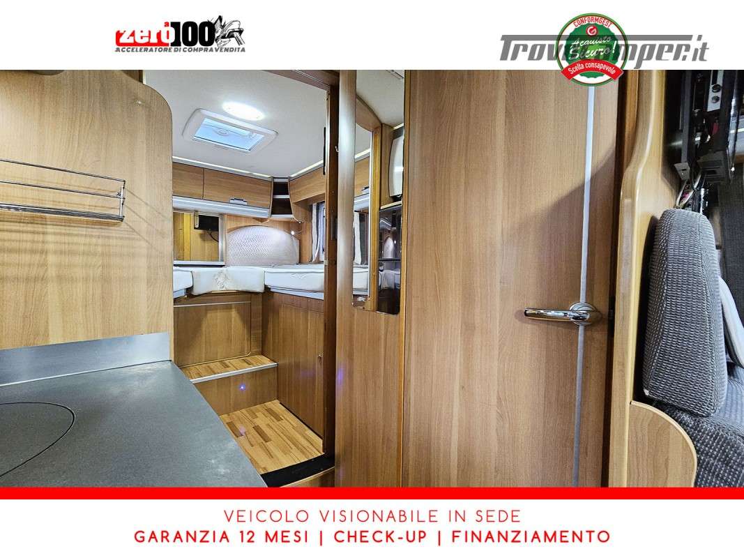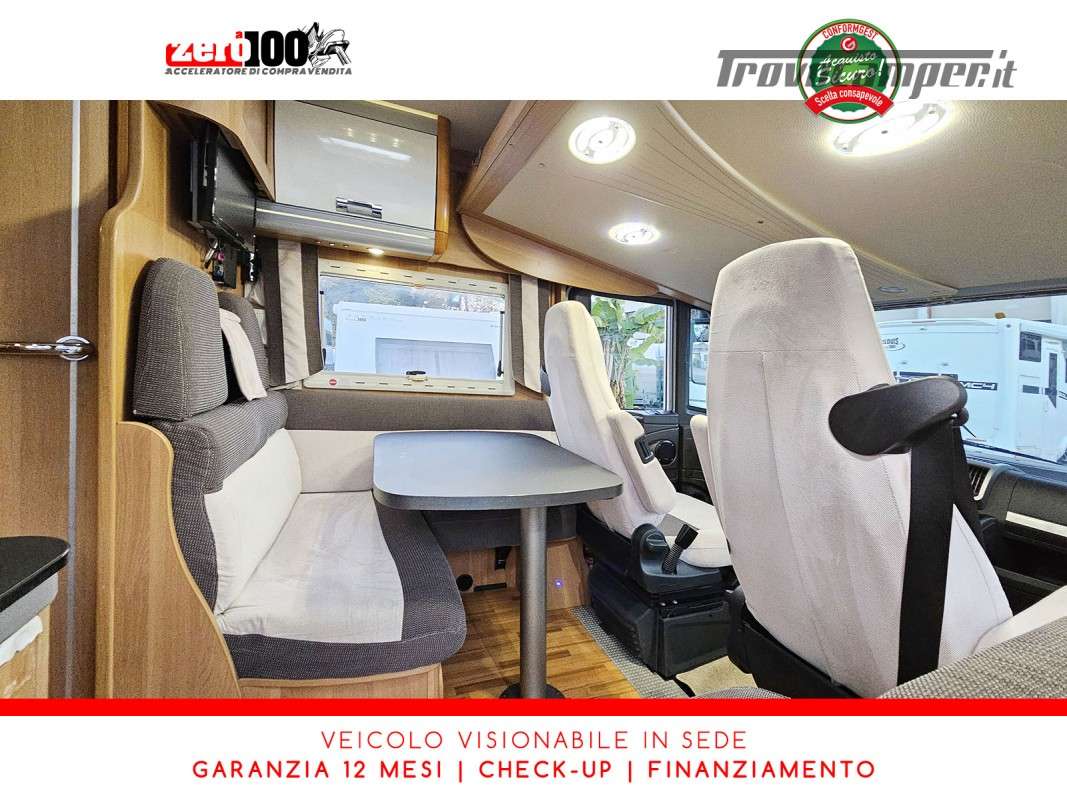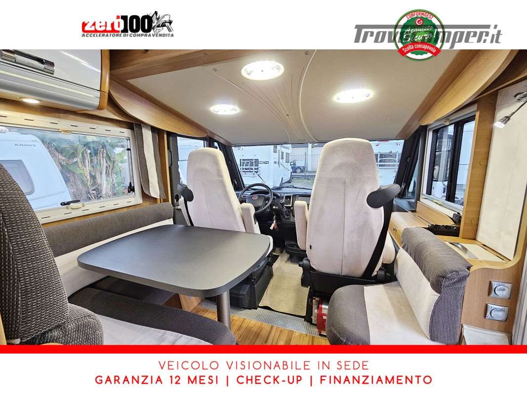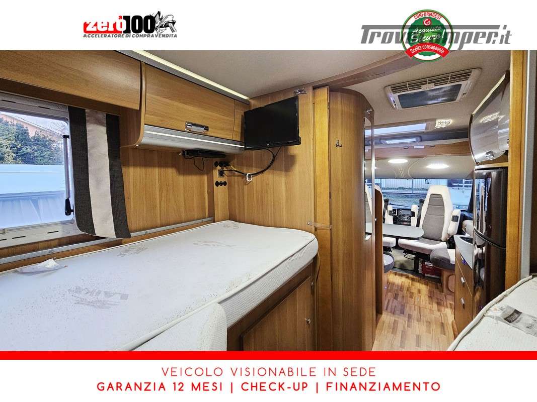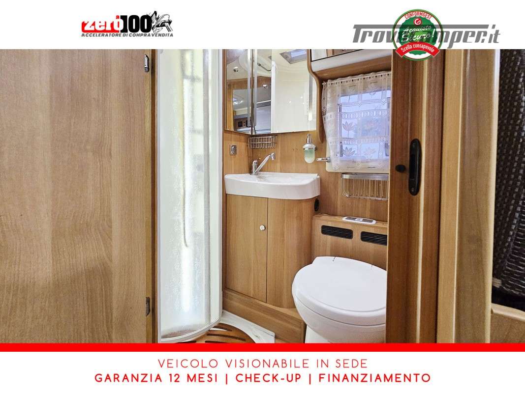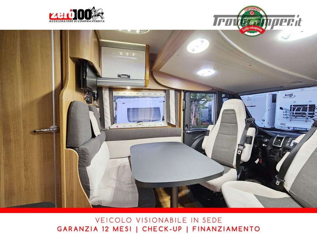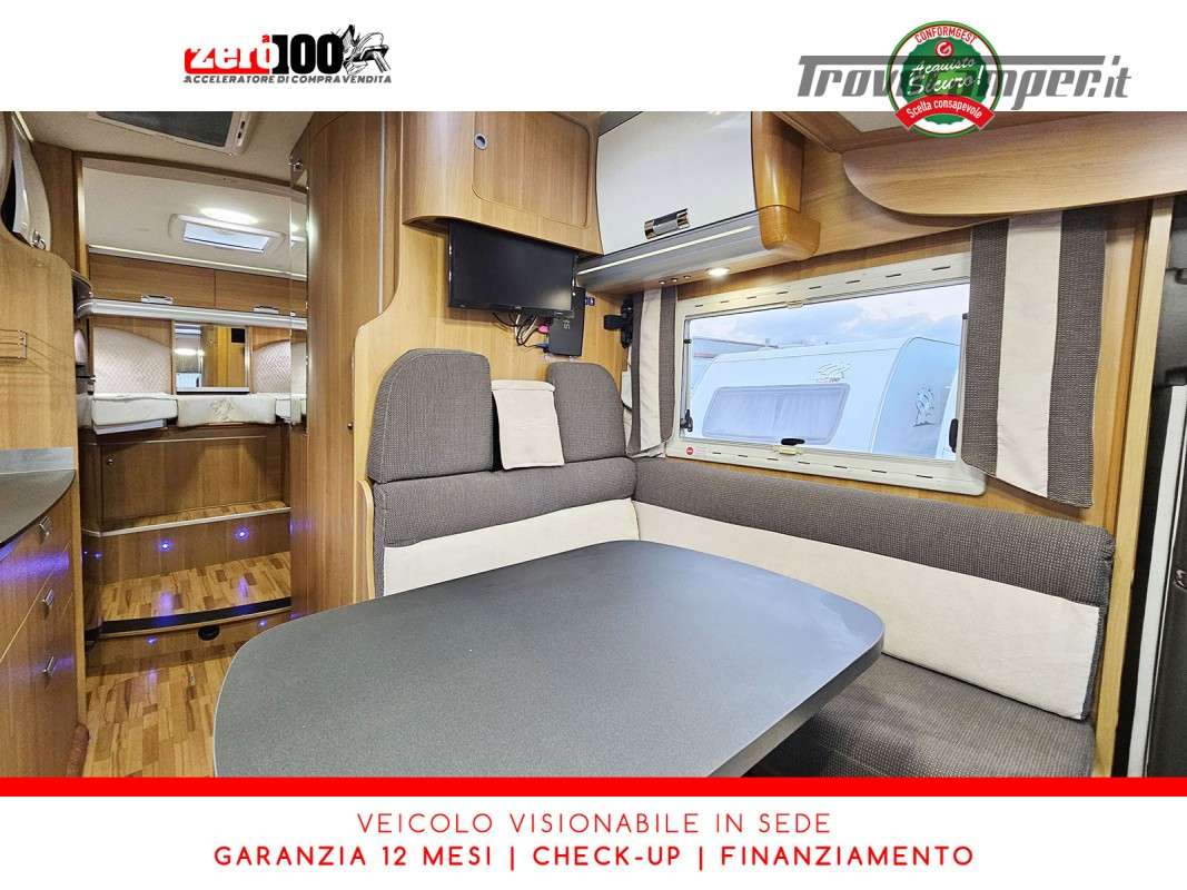 Letti gemelli in coda – Letto basculante anteriore – Dinette a L con sedili cabina girevoli – Cucina a L 3 fuochi con piezo, Frigorifero trivalente grande con cella freezer separata – Toilette con lavandino, wc e finestra – Box doccia girevole con oblo’ 28 x 28 – Garage