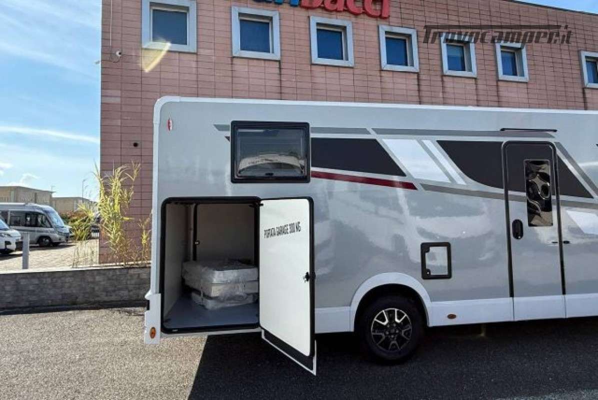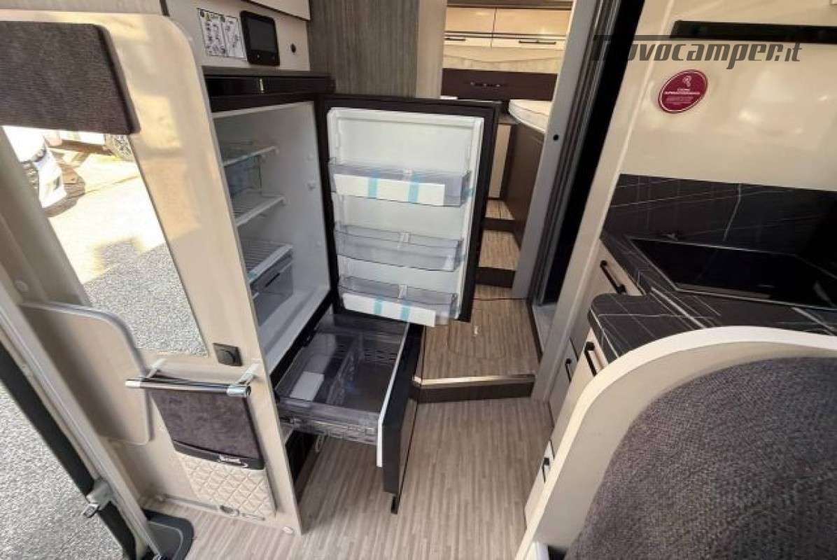 Motorhome con letti singoli gemelli trasformabili in letto matrimoniale e sottostante gavone garage nella zona posteriore, bagno con doccia separata, cucina con frigo a compressore 158l nella zona centrale, dinette a L con divanetto laterale e sedili anteriori girevoli, letto basculante matrimoniale..;