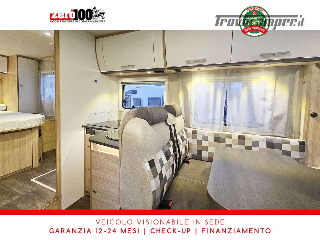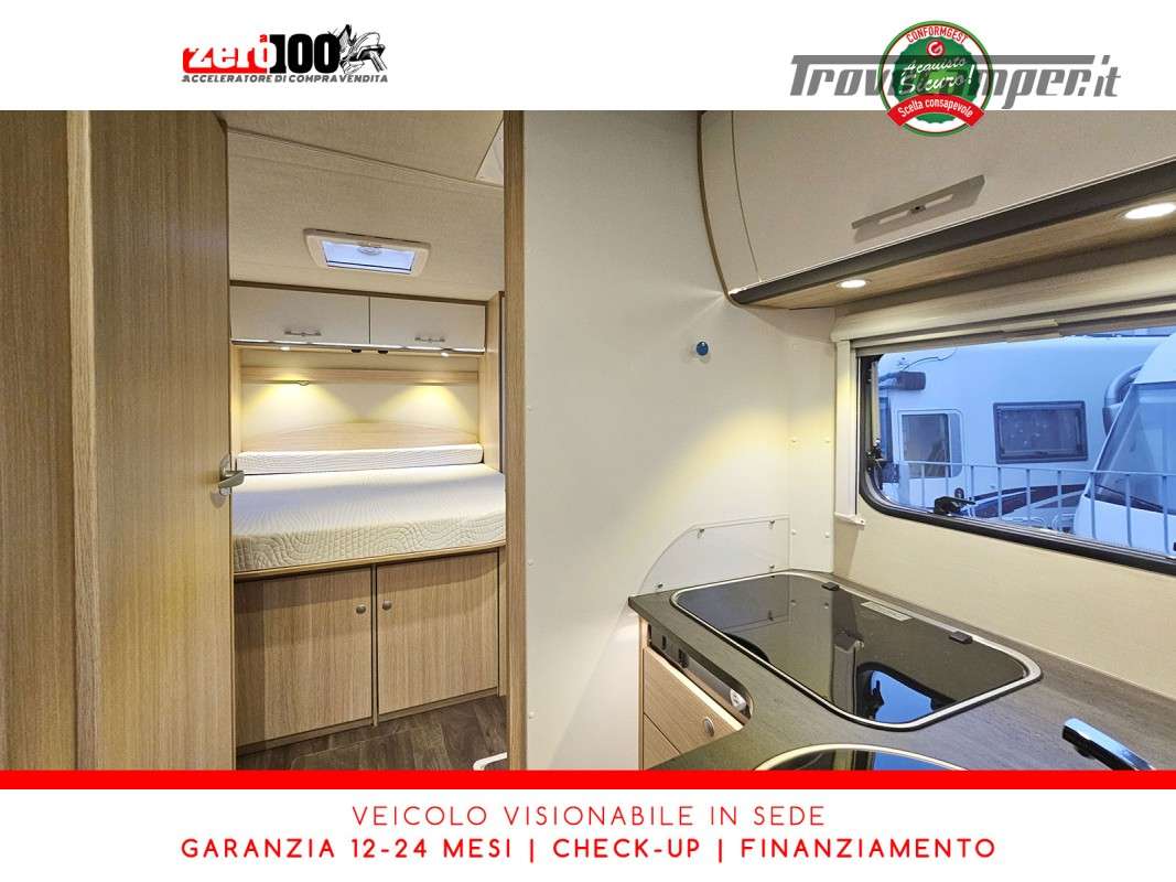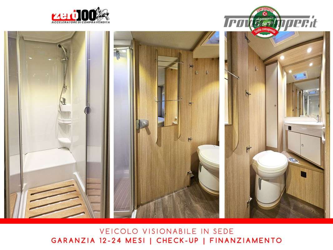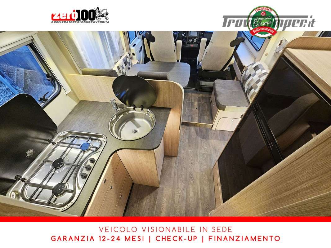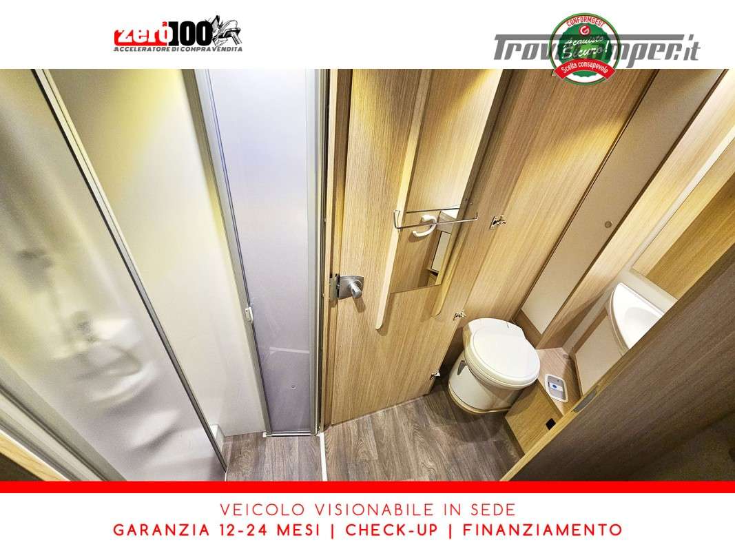 Letto nautico in coda – Mezza dinette con sedili cabina girevoli – Letto basculante anteriore sopra cabina – Cucina lineare 3 fuochi con Frigorifero trivalente alto con cella freezer separata – Bagno composto da 2 vani separati entrambi con oblò e (lato dx toilette, lato sx Doccia indipendente) – Garage