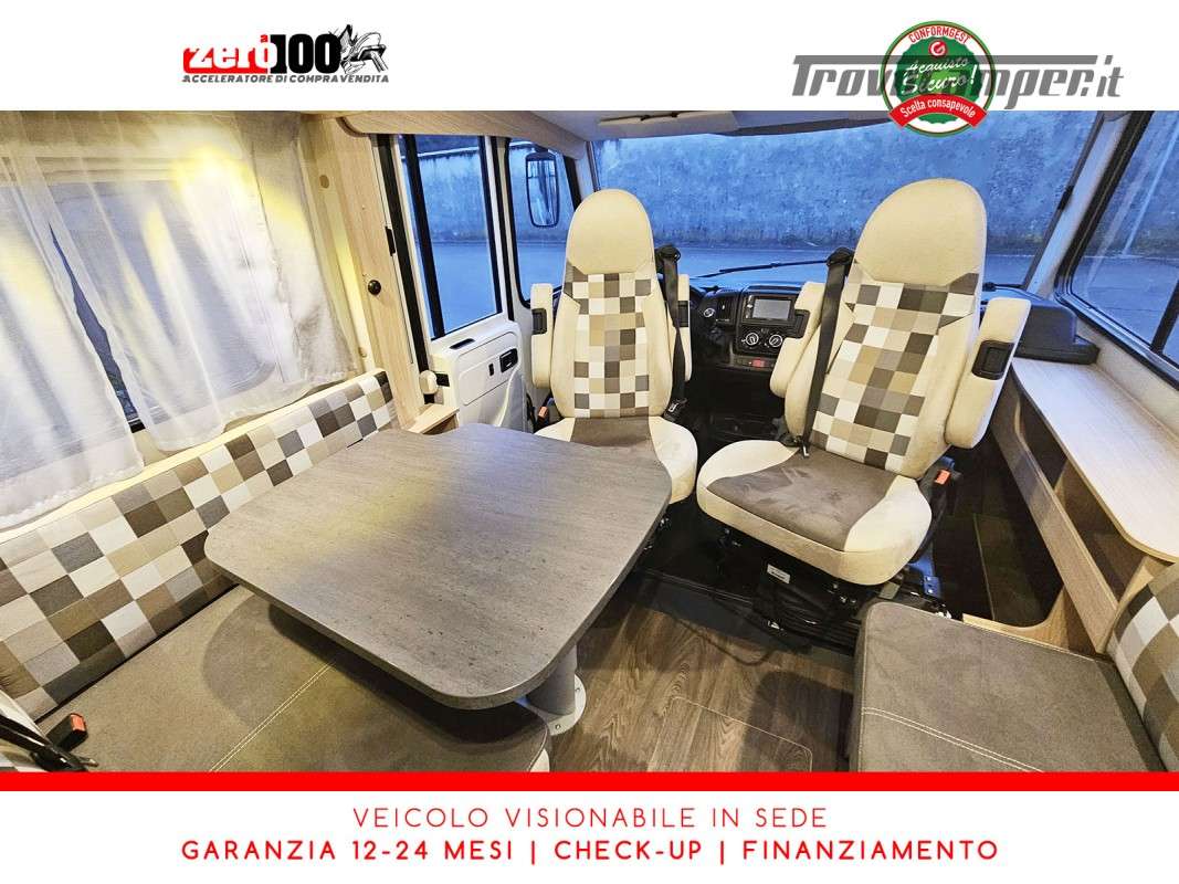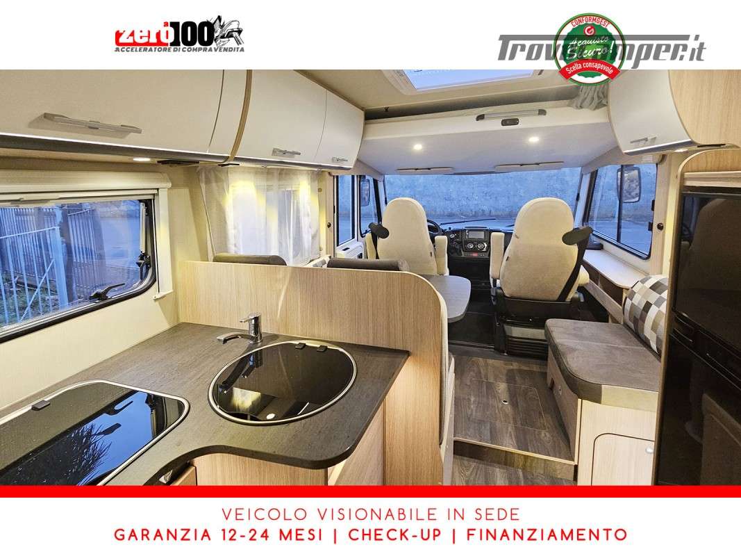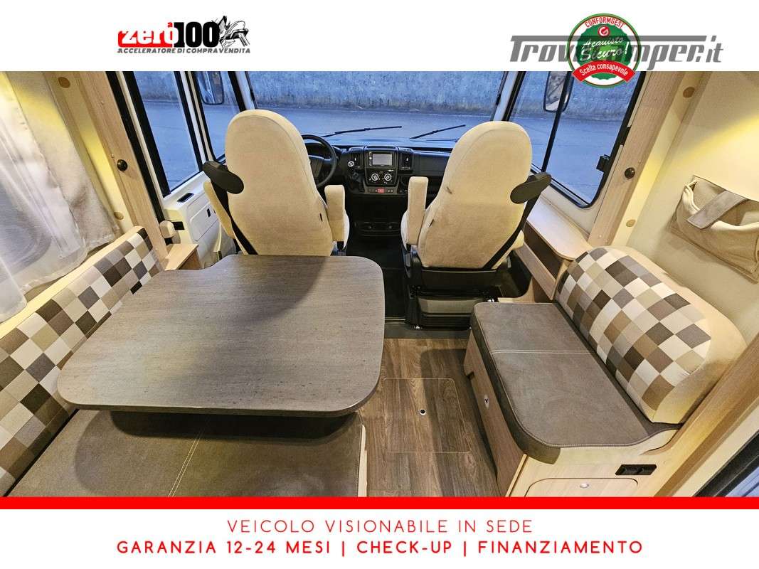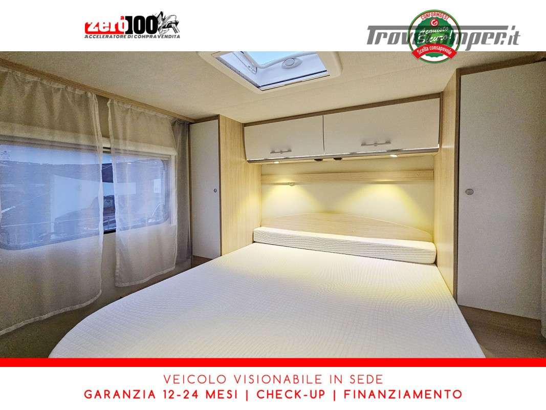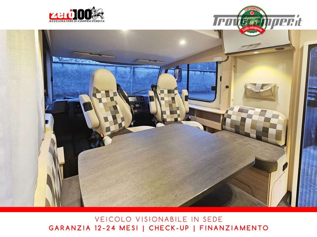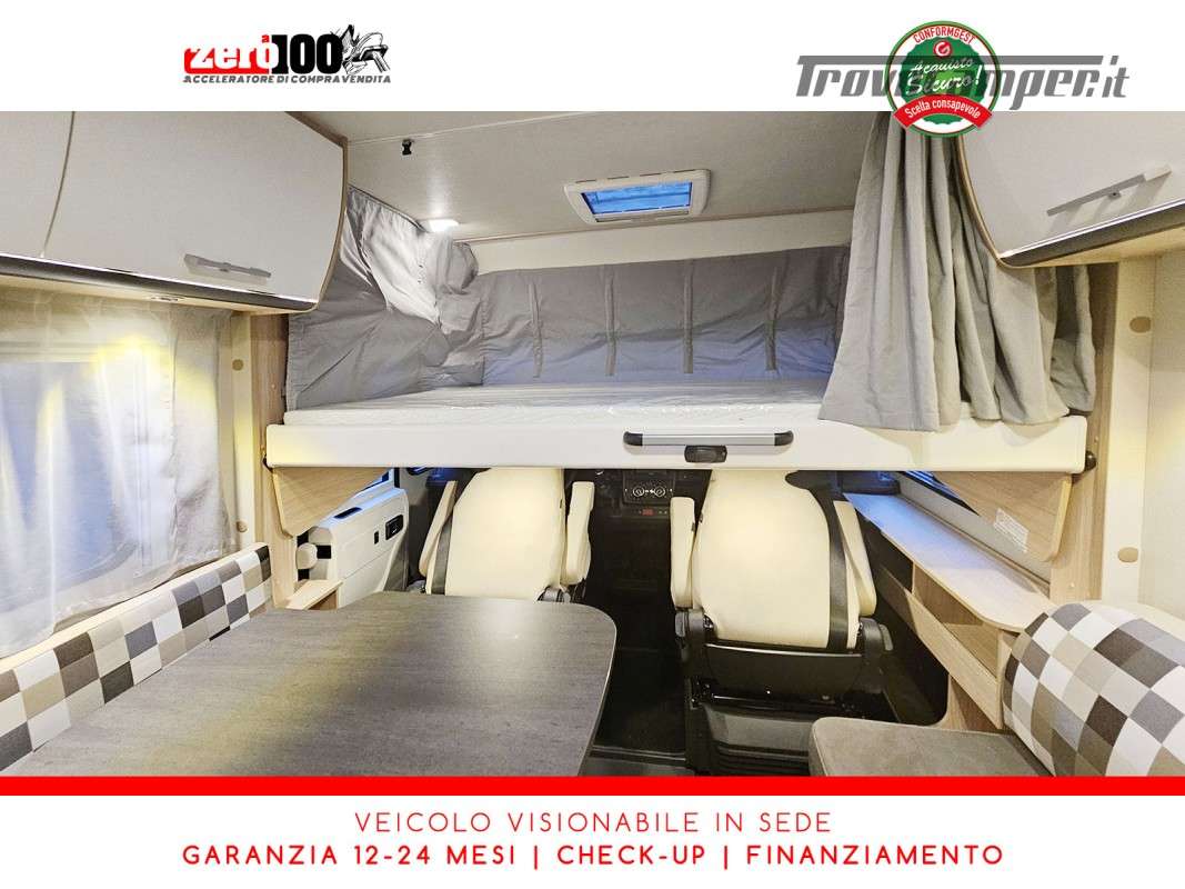 Letto nautico in coda – Mezza dinette con sedili cabina girevoli – Letto basculante anteriore sopra cabina – Cucina lineare 3 fuochi con Frigorifero trivalente alto con cella freezer separata – Bagno composto da 2 vani separati entrambi con oblò e (lato dx toilette, lato sx Doccia indipendente) – Garage