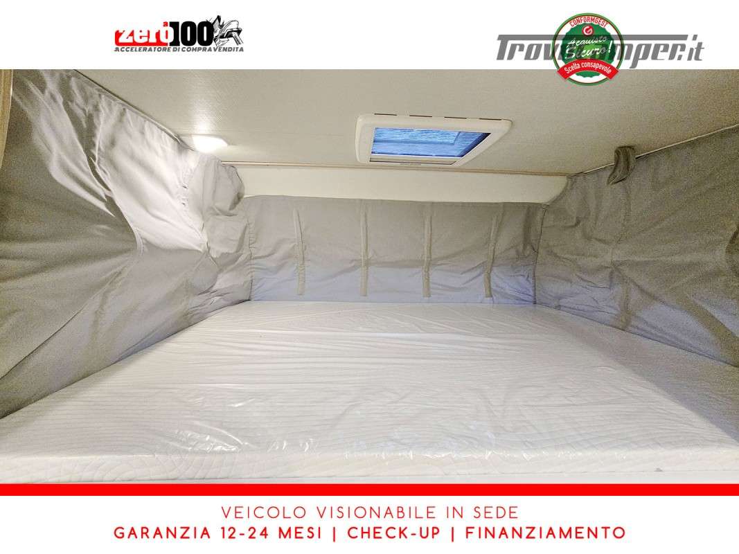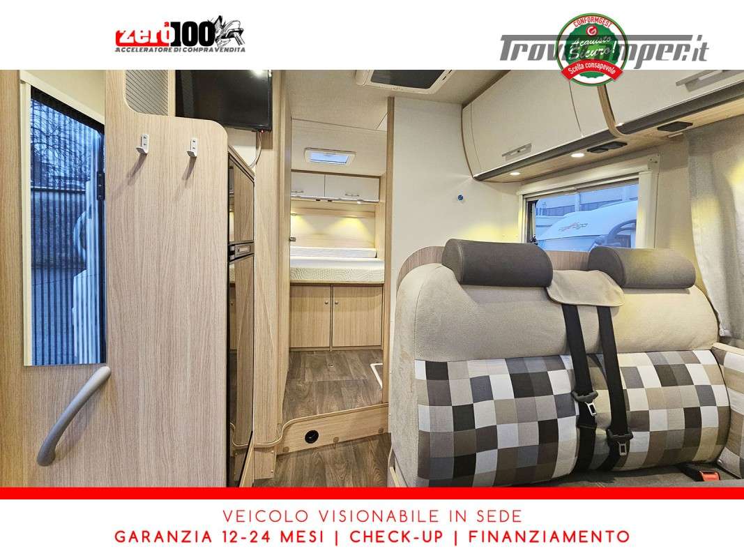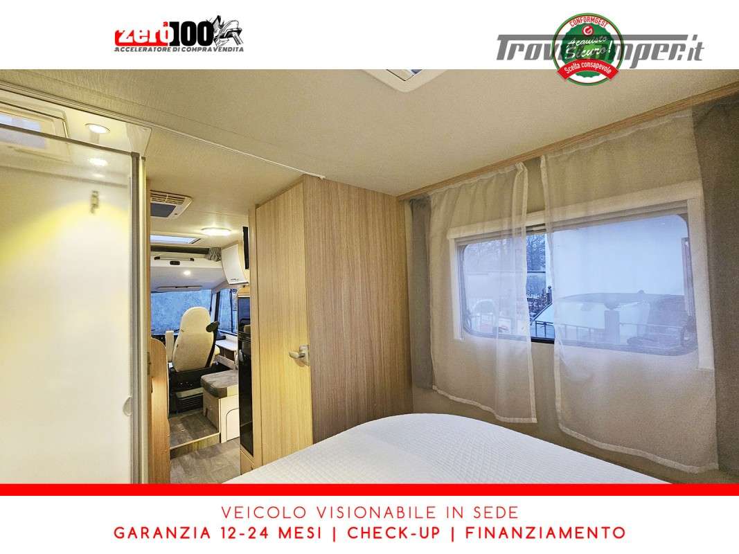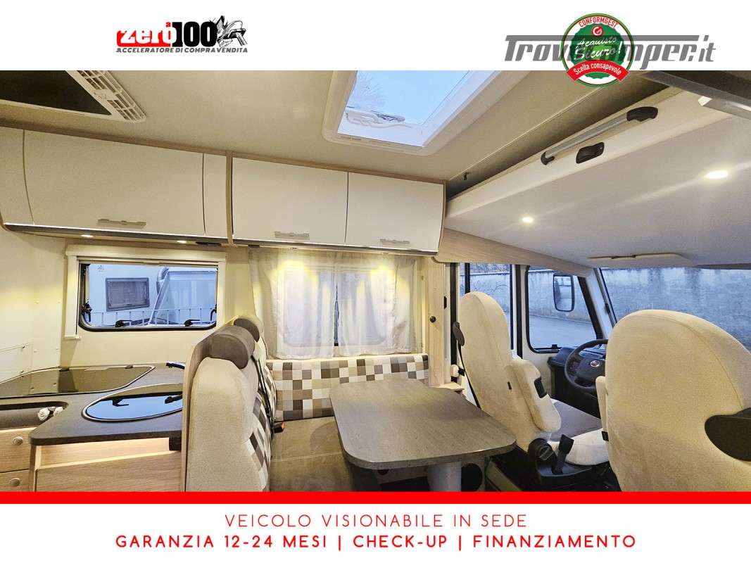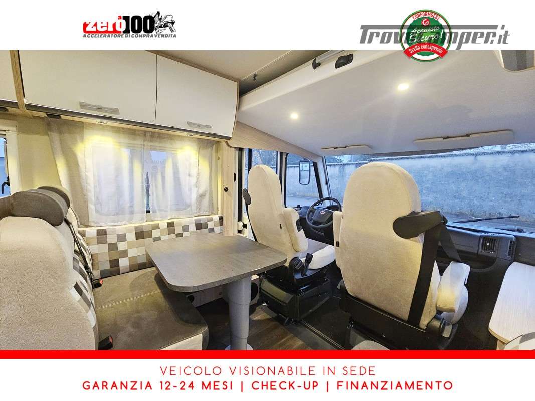 Letto nautico in coda – Mezza dinette con sedili cabina girevoli – Letto basculante anteriore sopra cabina – Cucina lineare 3 fuochi con Frigorifero trivalente alto con cella freezer separata – Bagno composto da 2 vani separati entrambi con oblò e (lato dx toilette, lato sx Doccia indipendente) – Garage